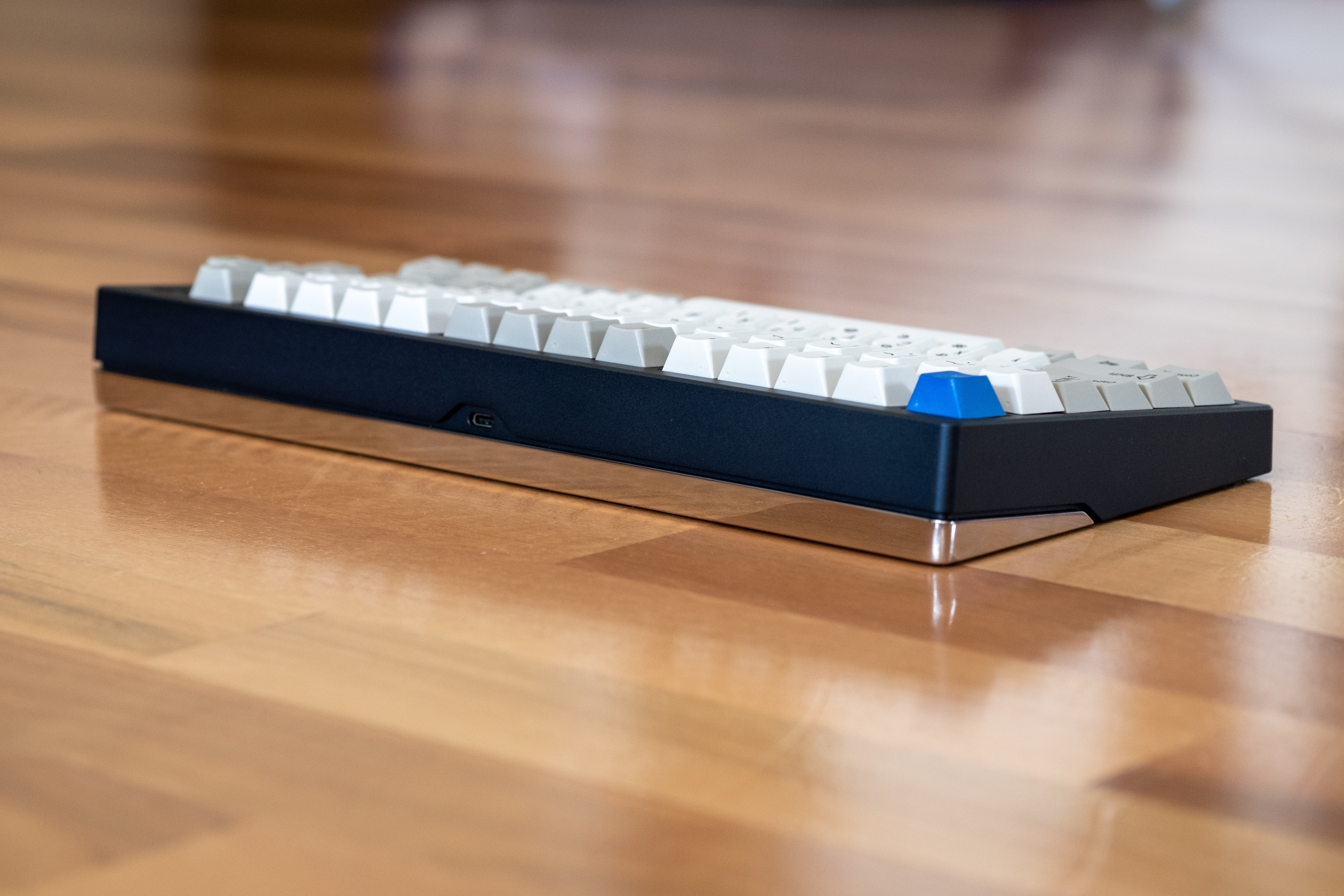 Really dark blue (this won't be the blue colour for the production run_ with raw polished stainless steel weight and logo - Enjoypbt 3000SAT keycaps