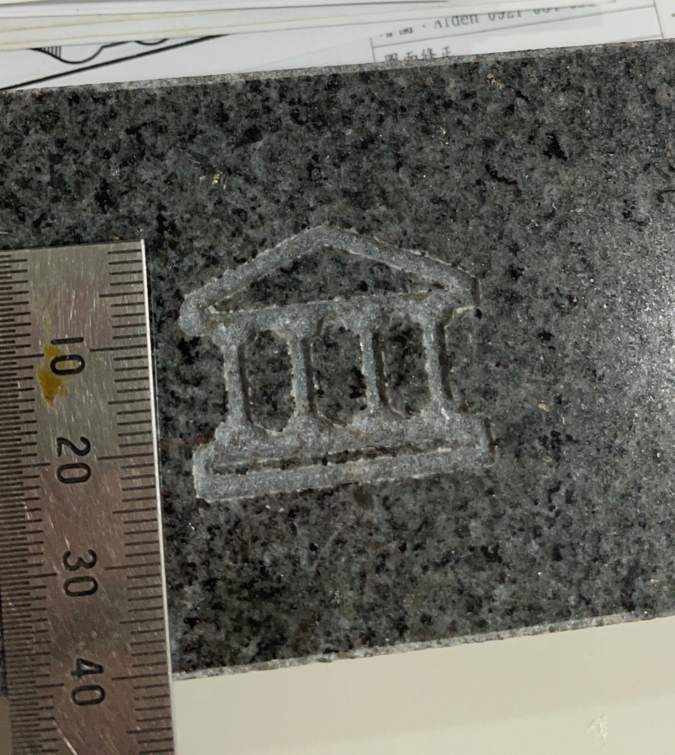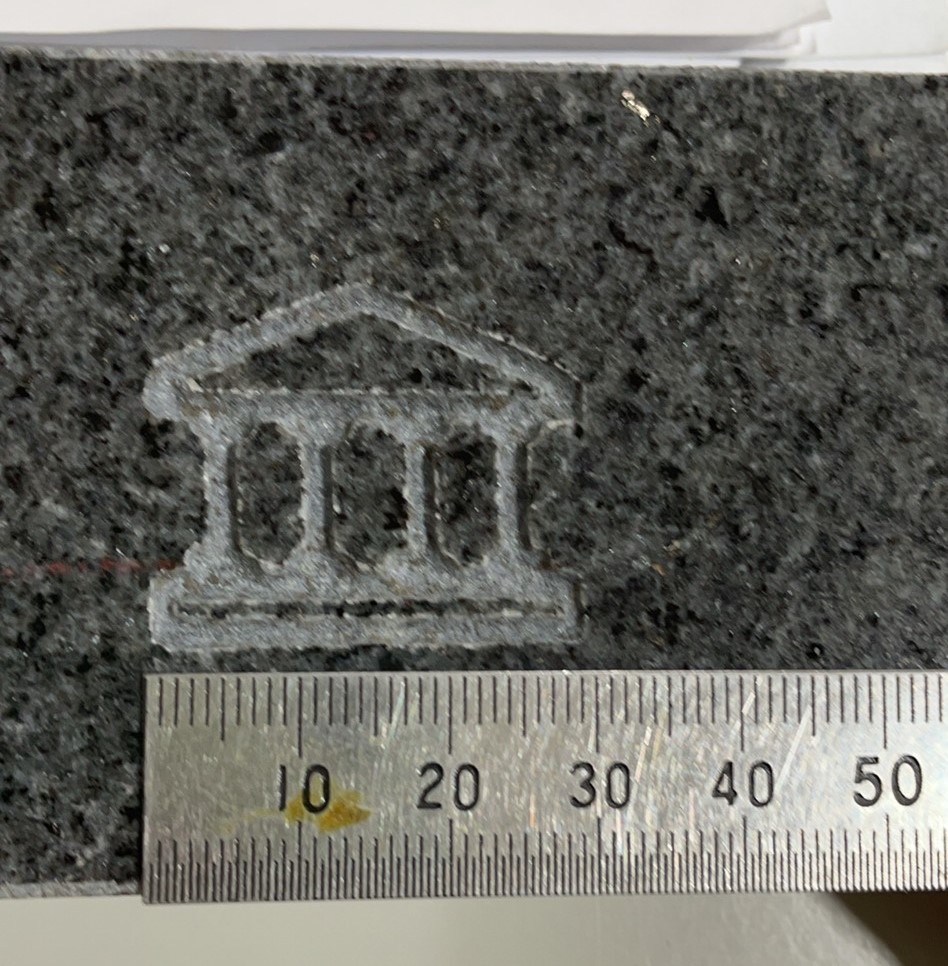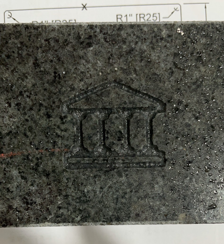 This engraving is made by water jet with a size of 29mm*25mm // 1.14*1 inch for a stroke thickness of almost 2mm (0.08inch) and a depth of 1mm (0.04inch).