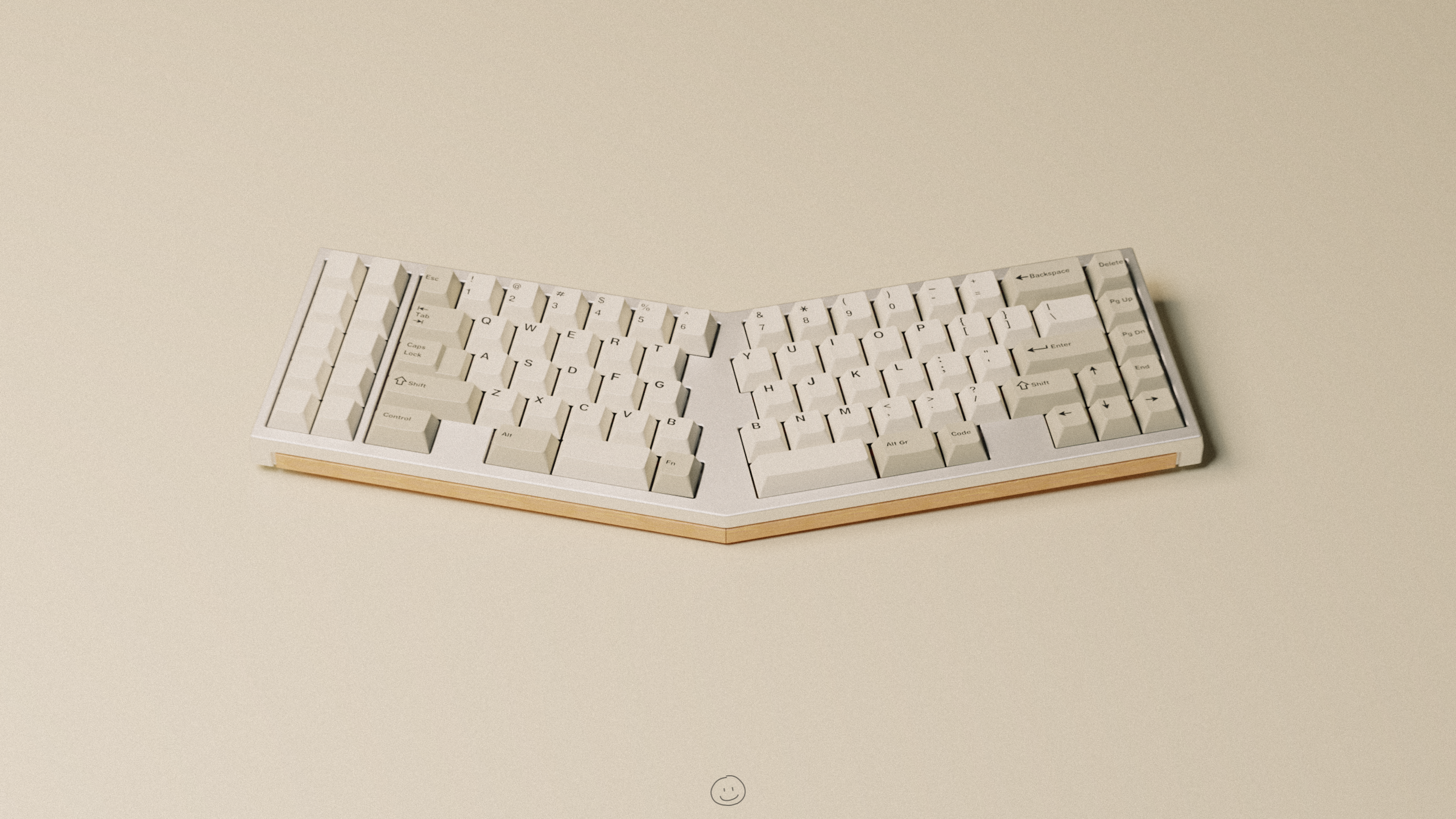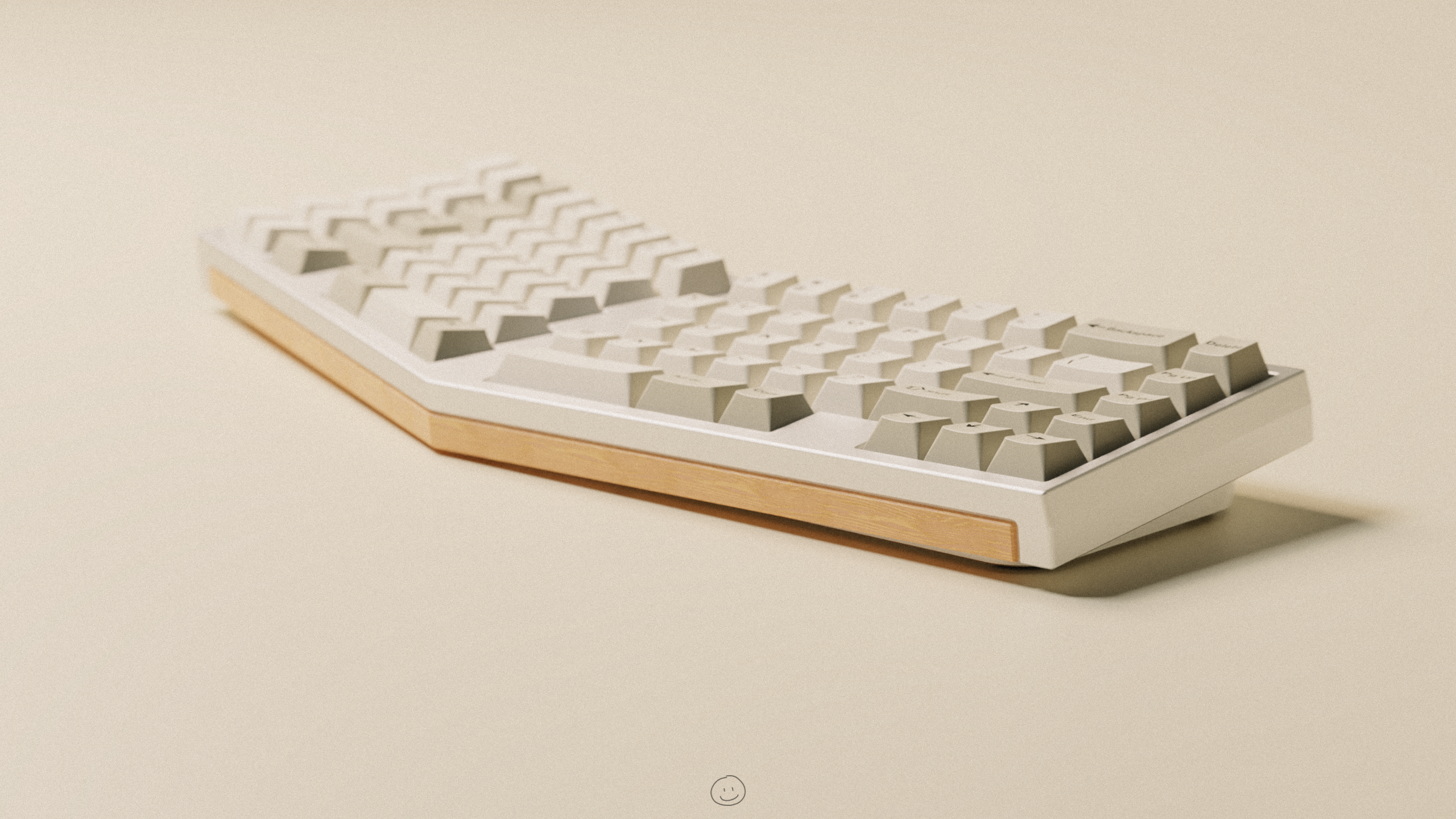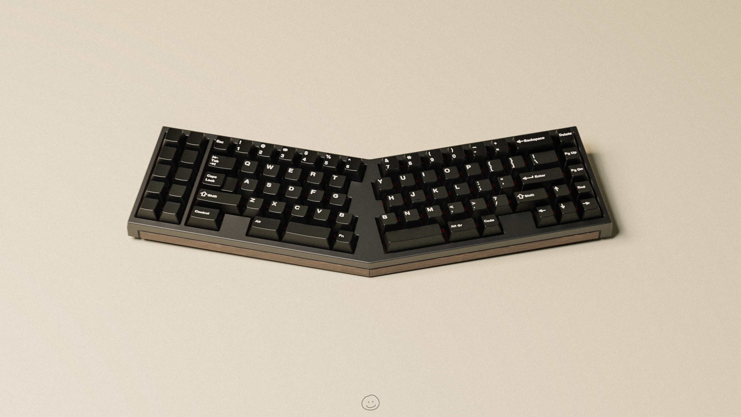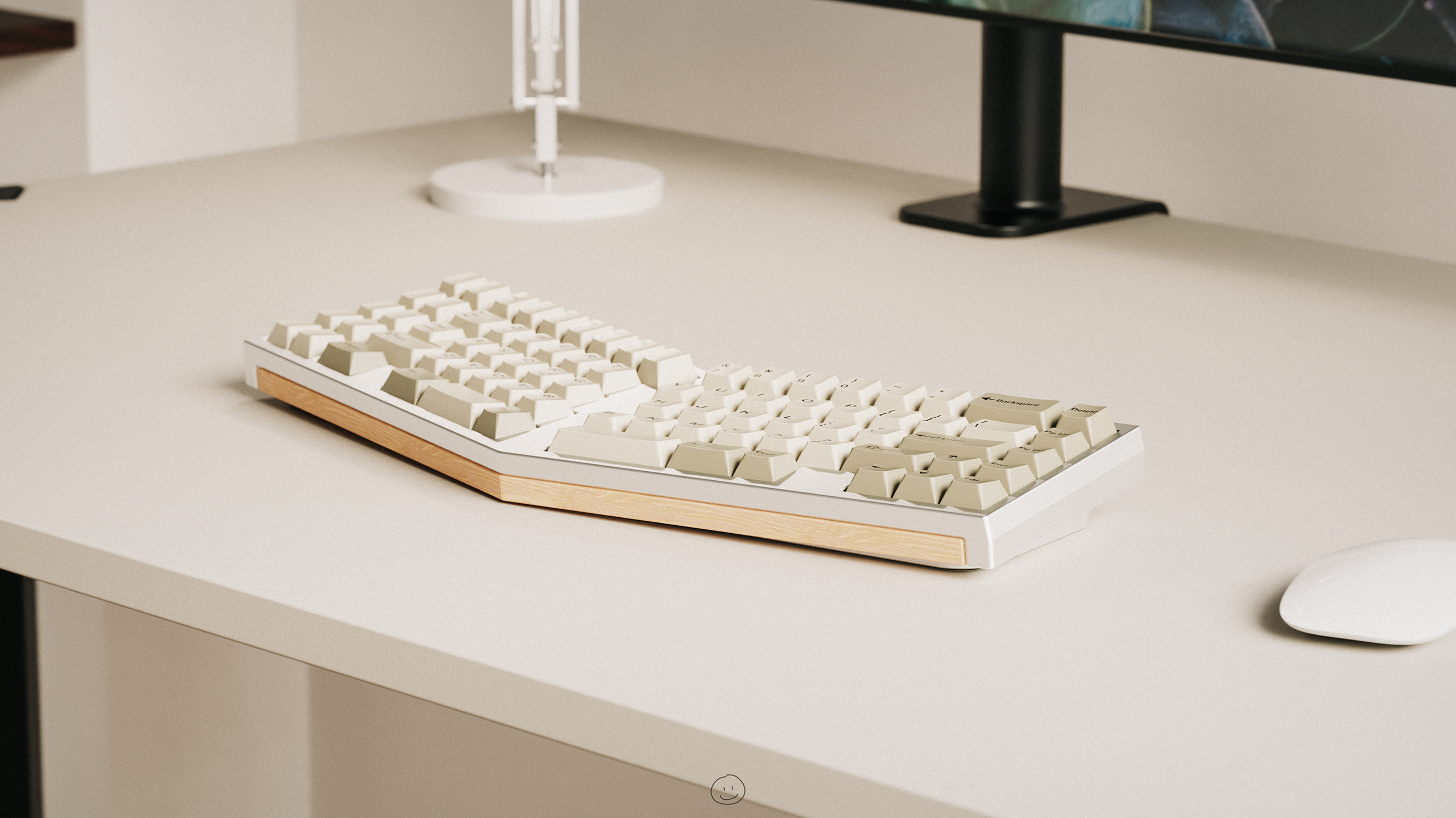 Arc is an ergonomic 65% keyboard with a 2-row macro column, split at a 12-degree angle. It features the familiar gummy O-ring mount and a front-facing walnut/maple accent.