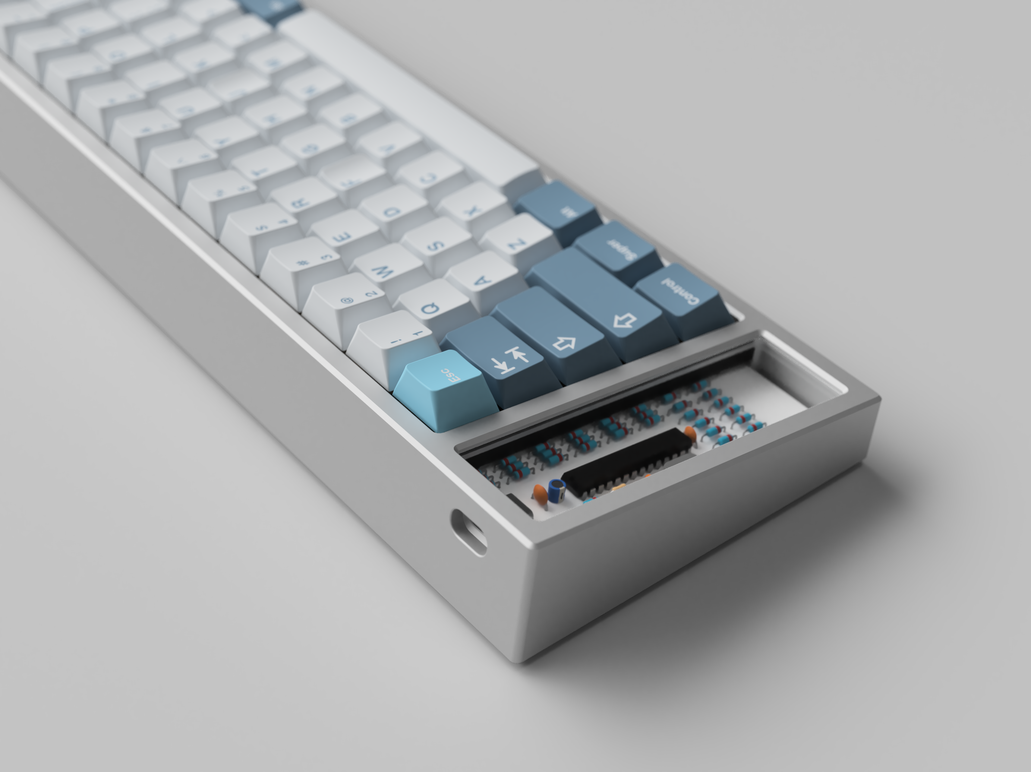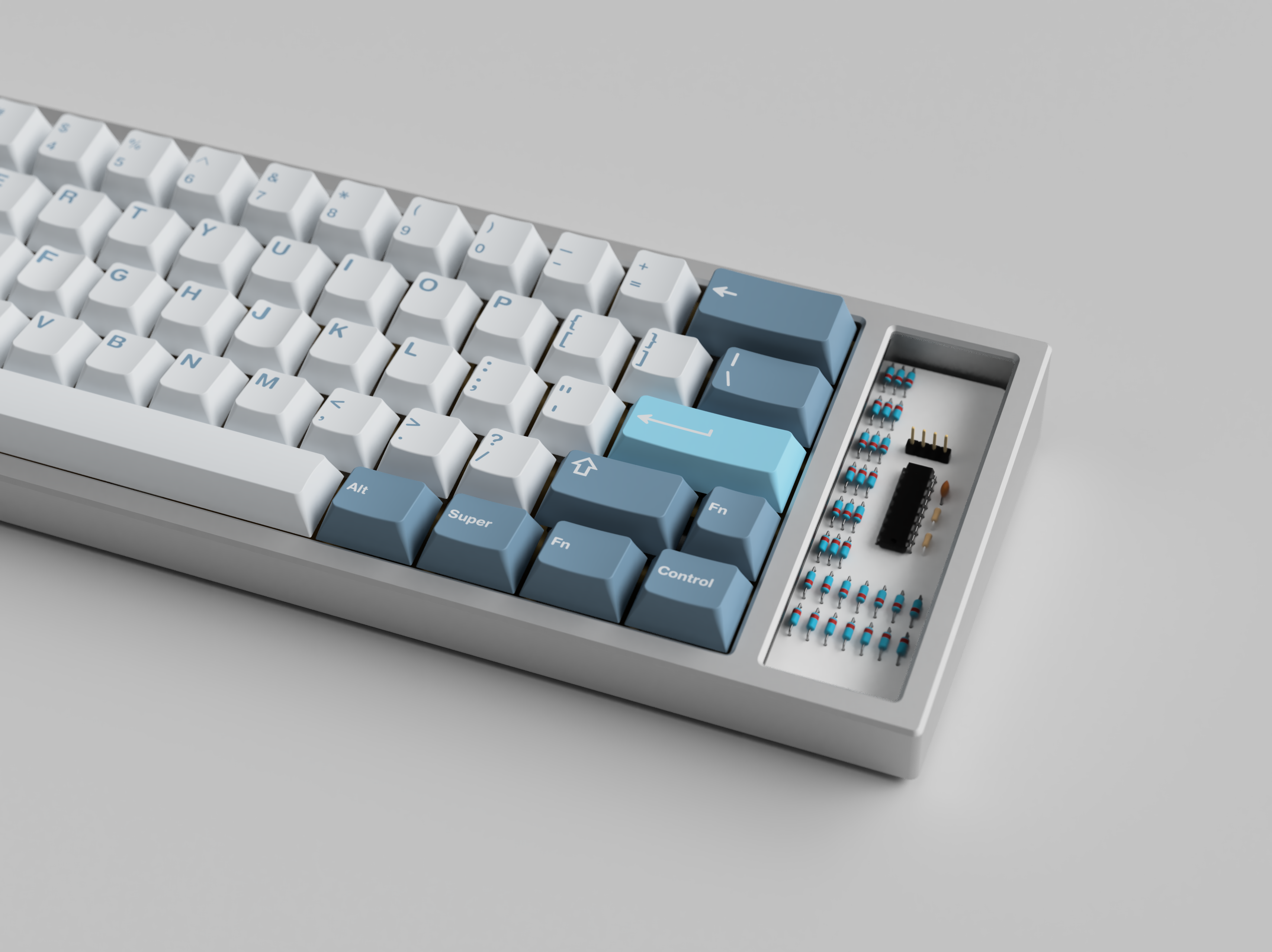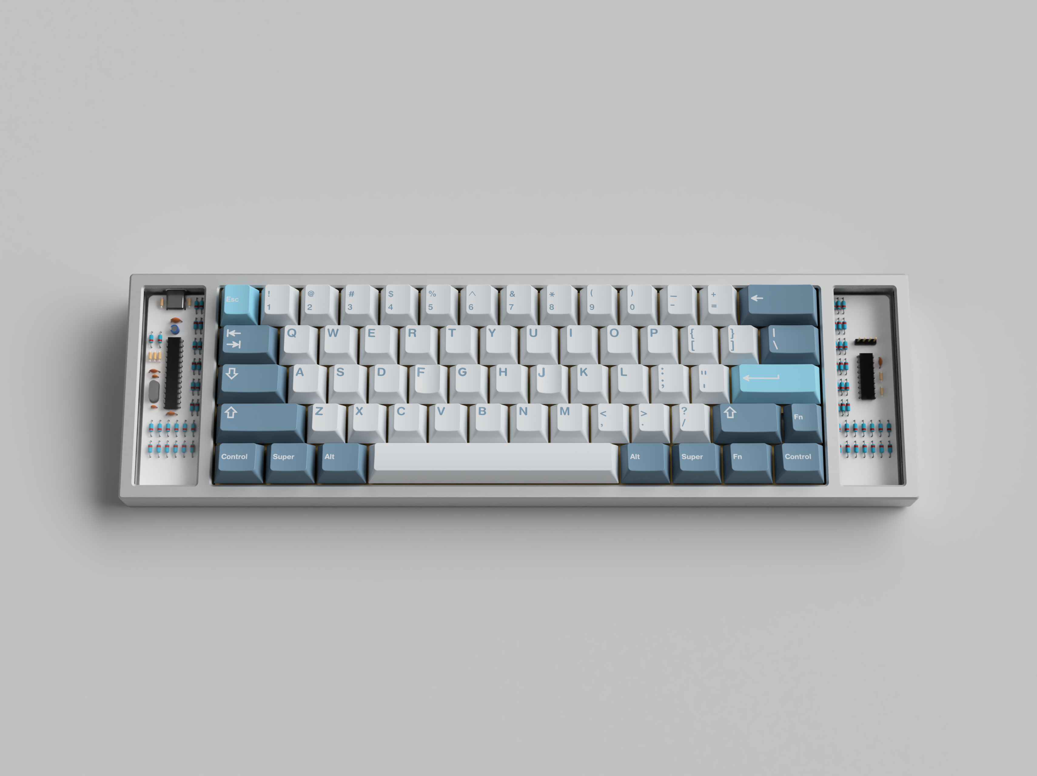 I love the through-hole keyboards out there but I wanted one with a metal housing. So, I employed Jae of Prototypist (logistics and fulfillment), James of Alchemist Keyboards (housing design), and Yiancar (PCB design) to make my idea into a reality. To give it’s own flavor and to give a better view of the components, the components were split to the sides of the keyboard. The relatively high typing angle was also chosen to increase the visibility of the components. Even though 65% is my favorite layout by far, I couldn’t pass up the opportunity to match the symmetry of the housing with the symmetry of the 60% layout. Because the focus of the keyboard is the side partitions, the rest of the design was kept relatively simple.