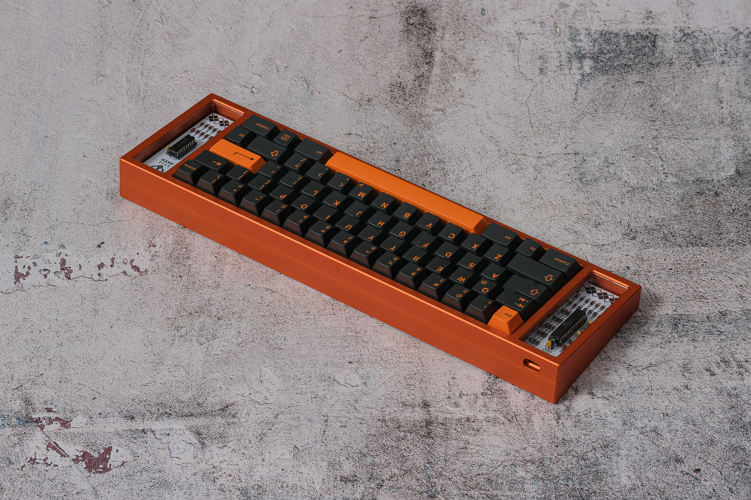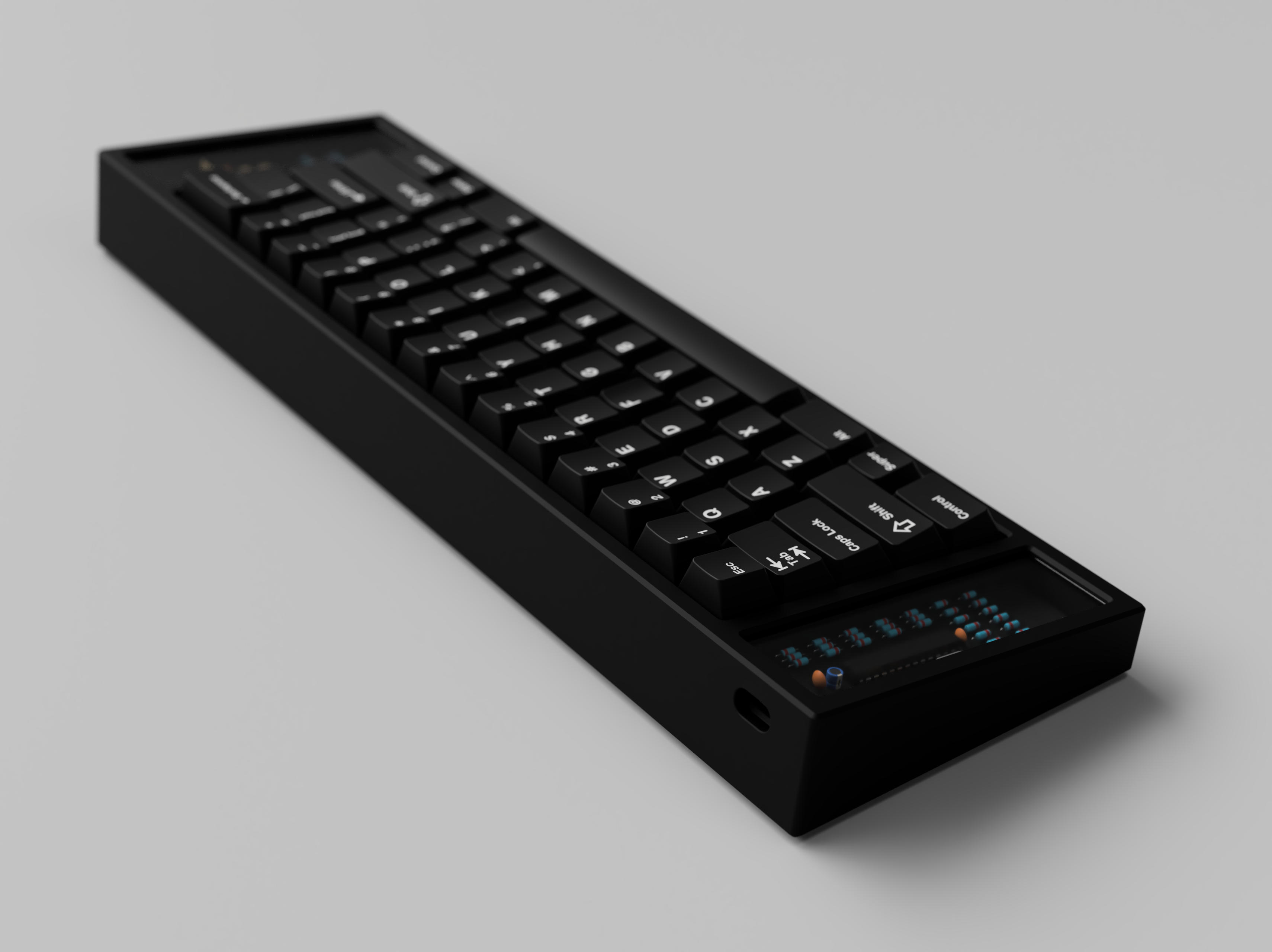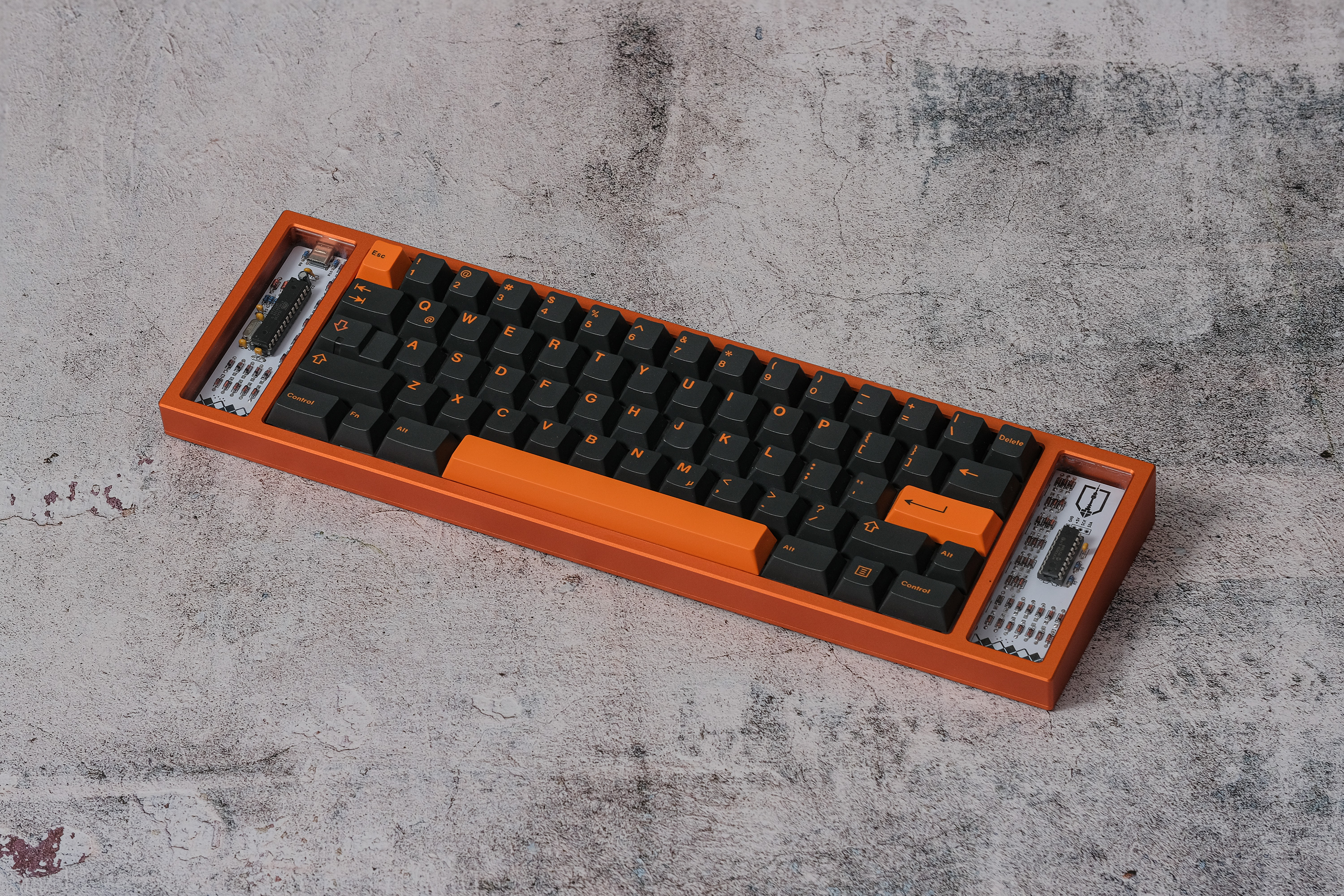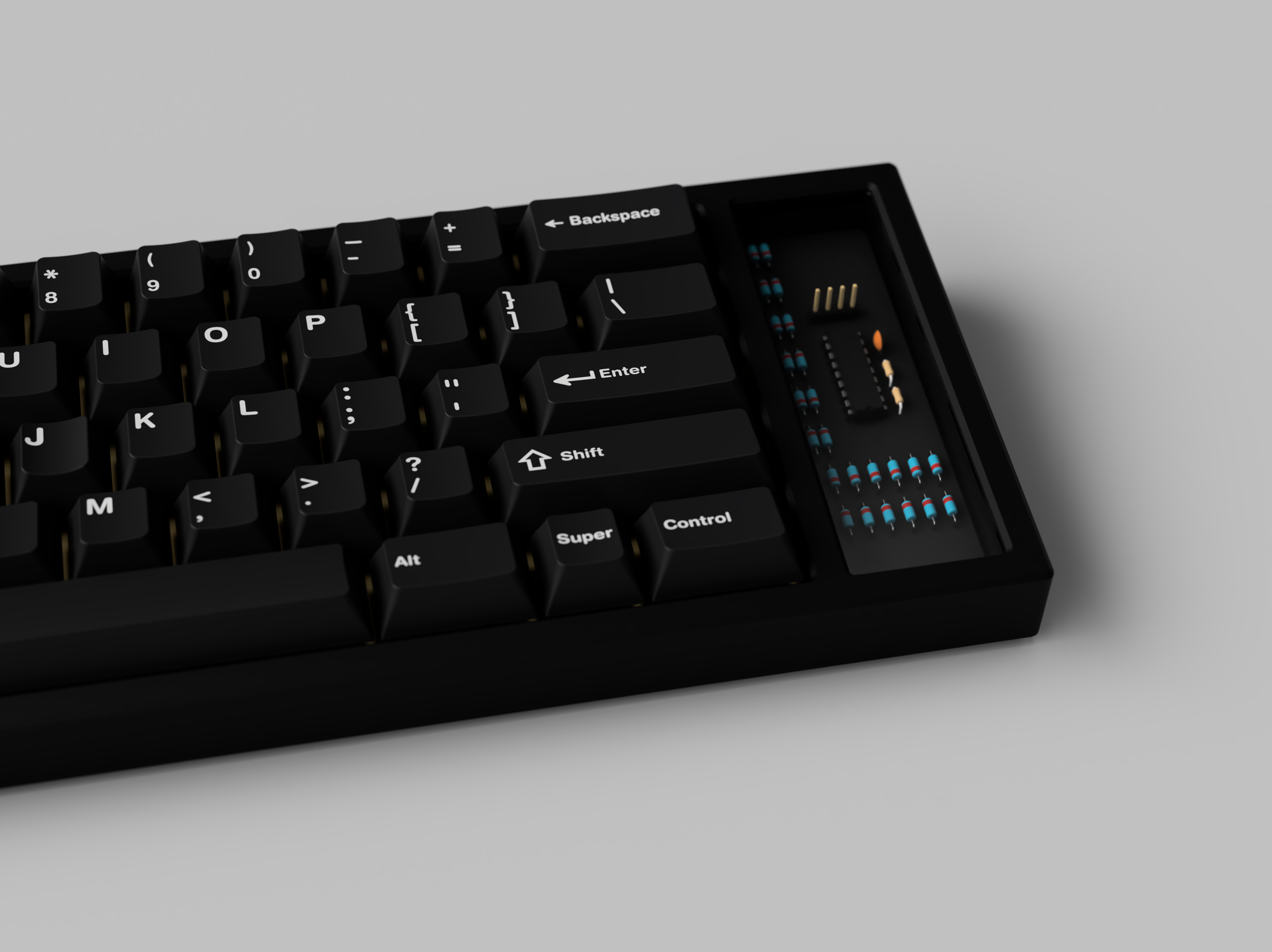 I love the through-hole keyboards out there but I wanted one with a metal housing. So, I employed Jae of Prototypist (logistics and fulfillment), James of Alchemist Keyboards (housing design), and Yiancar (PCB design) to make my idea into a reality. To give it’s own flavor and to give a better view of the components, the components were split to the sides of the keyboard. The relatively high typing angle was also chosen to increase the visibility of the components. Even though 65% is my favorite layout by far, I couldn’t pass up the opportunity to match the symmetry of the housing with the symmetry of the 60% layout. Because the focus of the keyboard is the side partitions, the rest of the design was kept relatively simple.