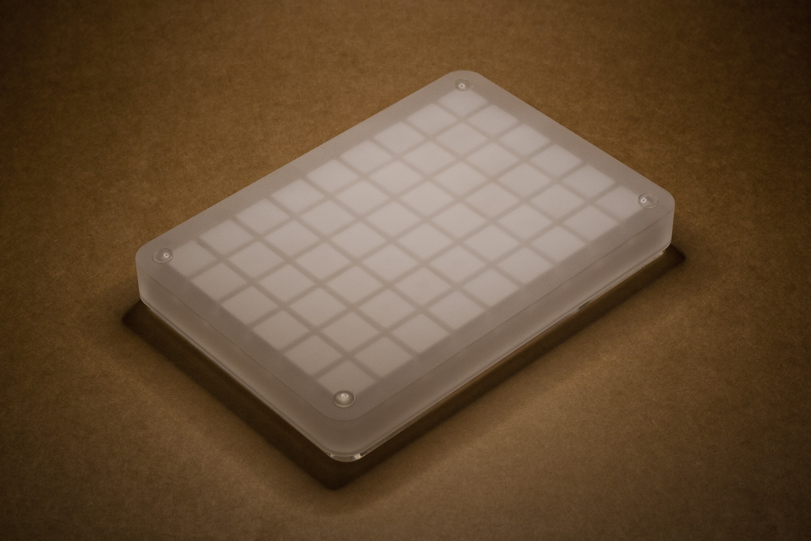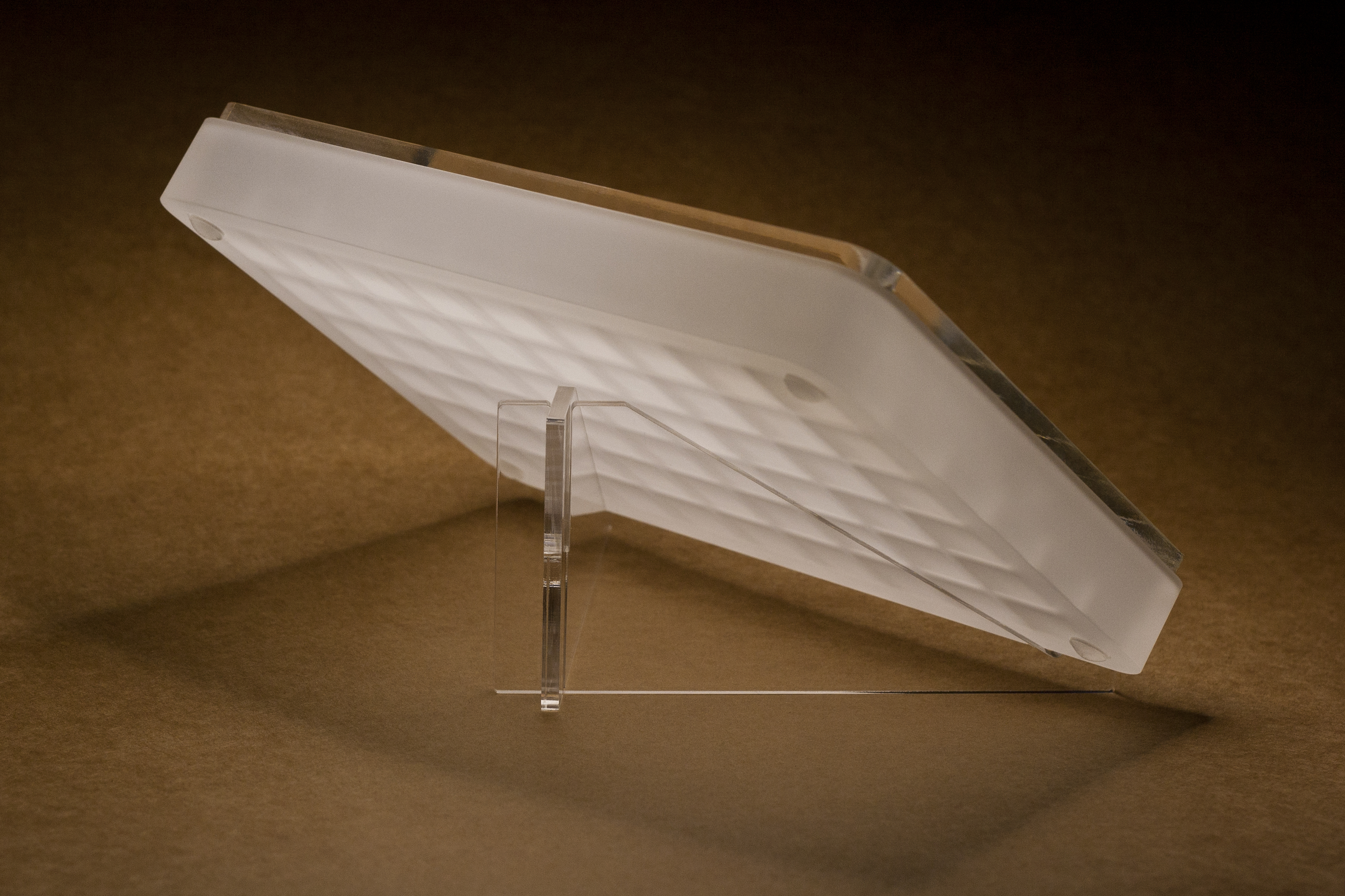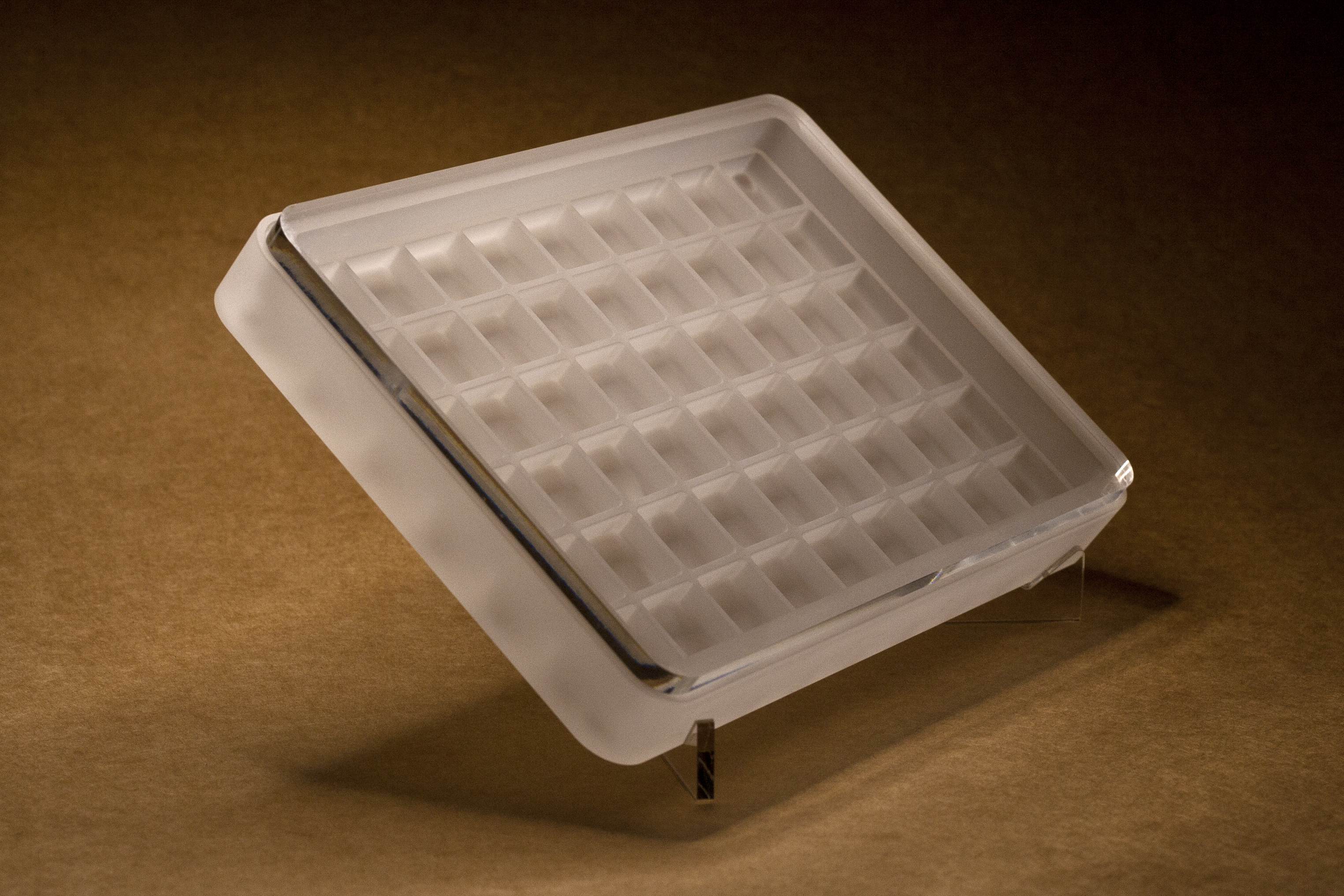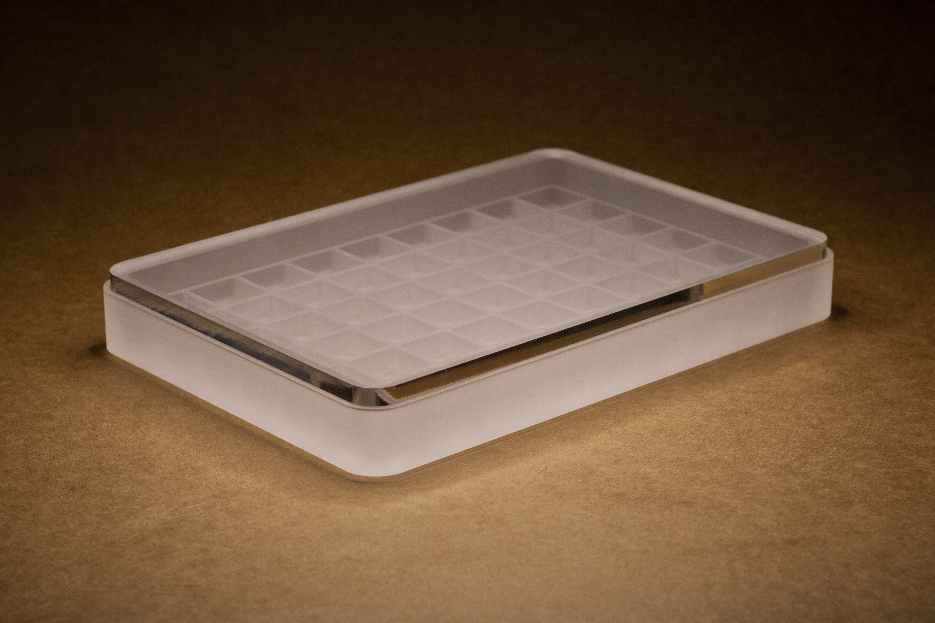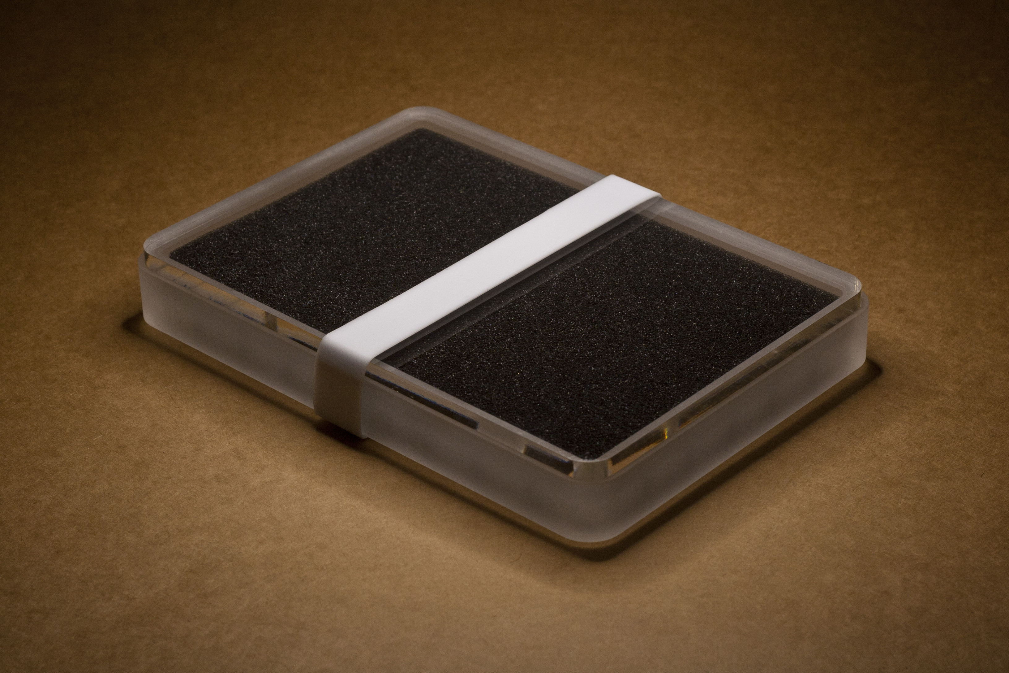 Specifications - 54 Slots (6x9) - Precision Machined CNC Acrylic Case - Glass Bead Blasted Finish - PlexiGlass Hard Coated Lid with UV Protection - more details on PlexiGlass UV Hard Coat - Acrylic Display Stand - Charcoal Travel Foam - Translucent Silicone Travel Band - Translucent Bump-on x 4 - Timestamp Ring - Cell Dimensions (LxWxH): 0.83" x .0.83" x 0.81" - Cell Wall Height: 0.34"