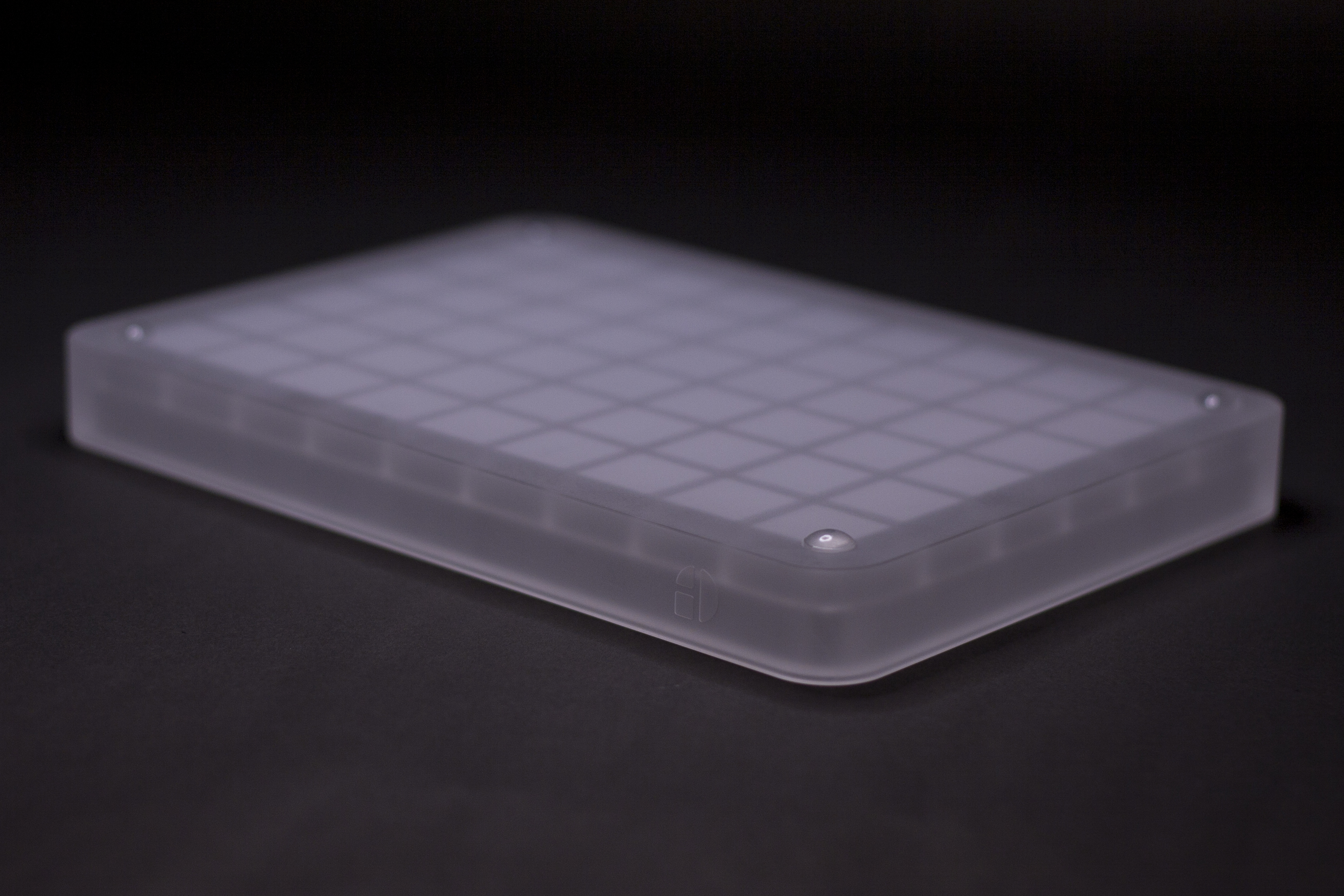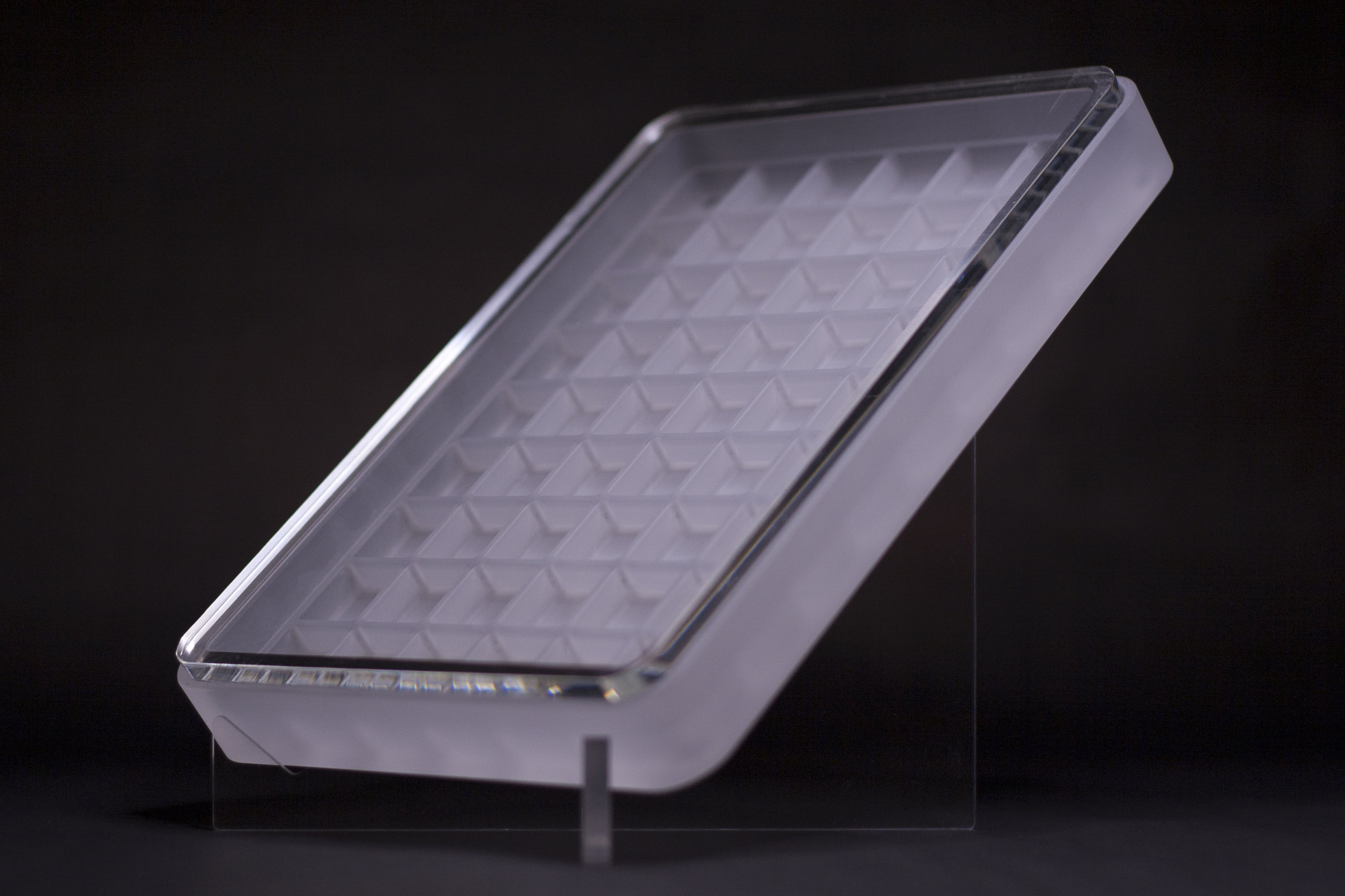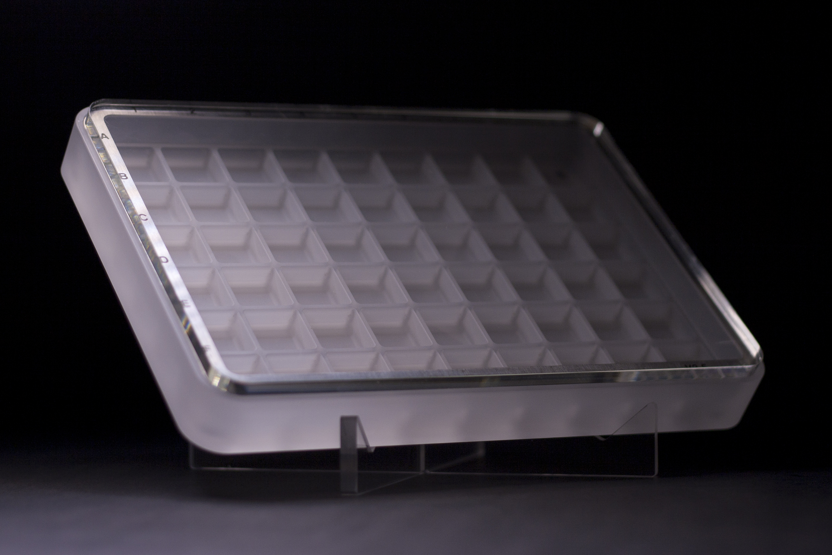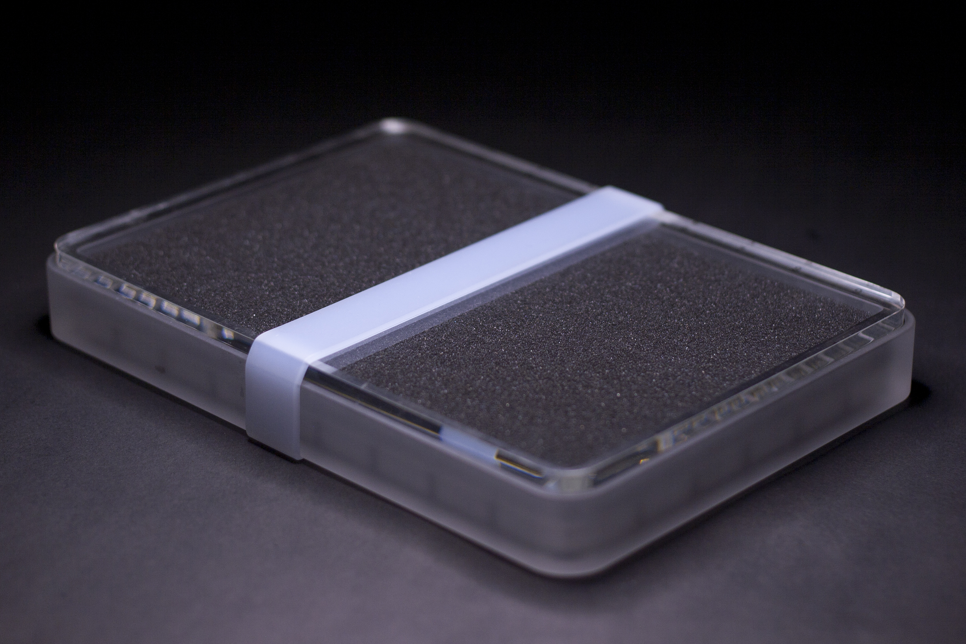 Specifications - 54 slots (6x9) - Precision machined CNC acrylic case - Stainless steel timestamp ring - Acrylic display stand (machined & allowing for portrait view) - Glass bead-blasted finish - PlexiGlass hard-coated lid with UV protection - more details on PlexiGlass UV Hard Coat - Charcoal travel foam - Translucent silicone travel band - Translucent bump-on x 4 - Cell dimensions (LxWxH): 0.83" x .0.83" x 0.81" - Cell wall height: 0.34"