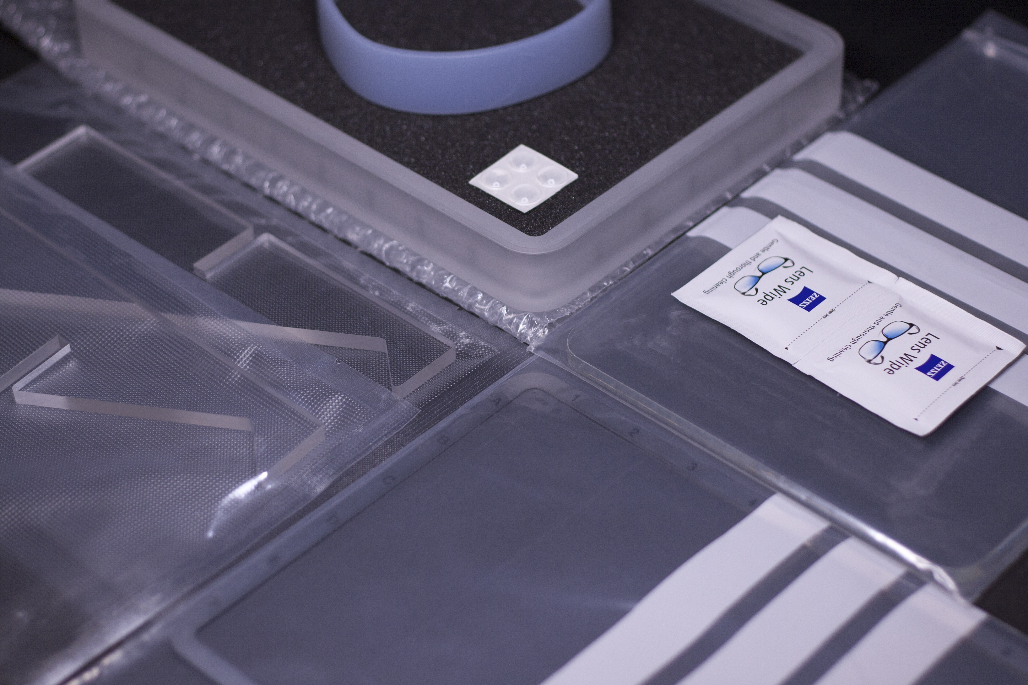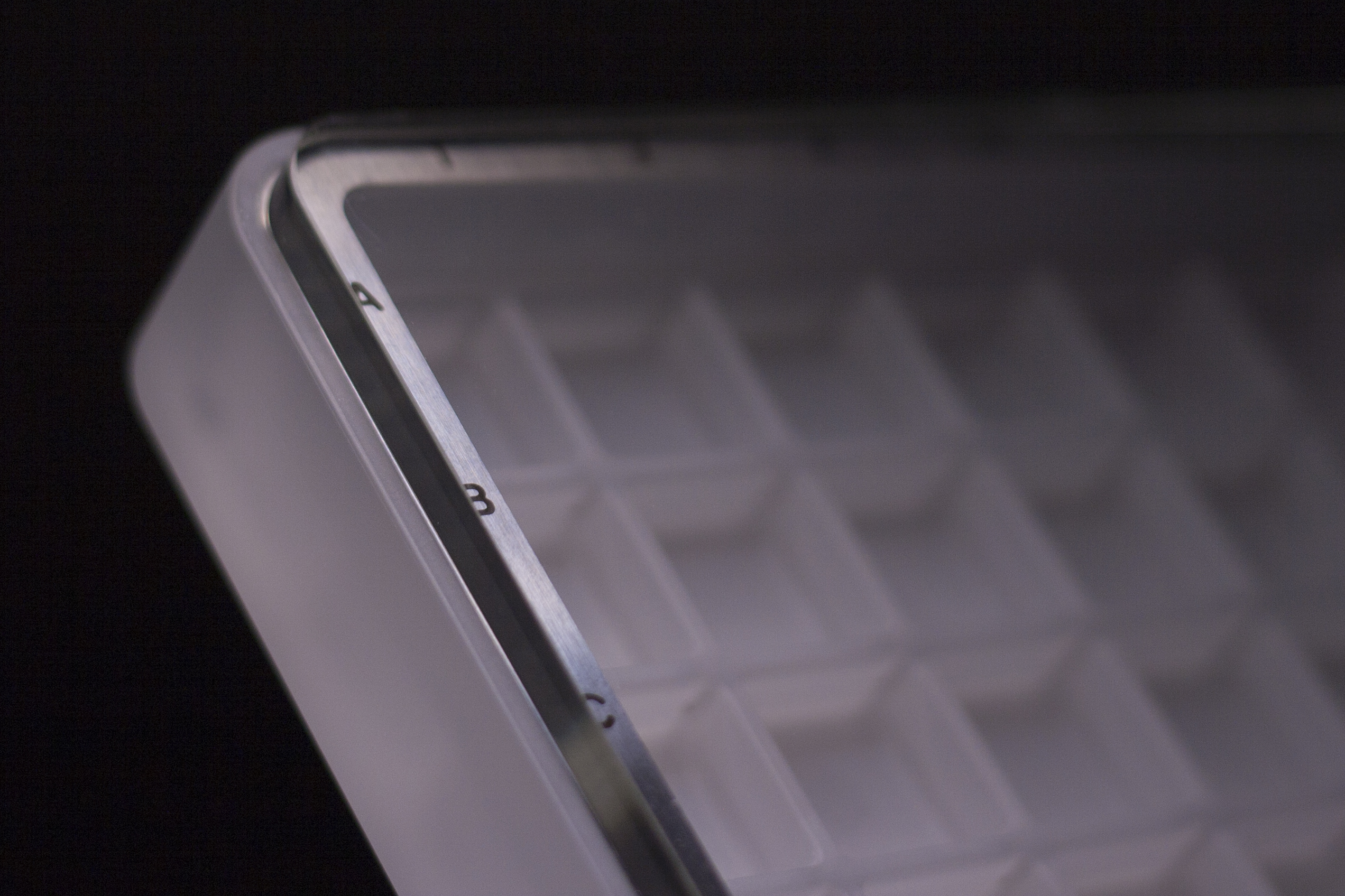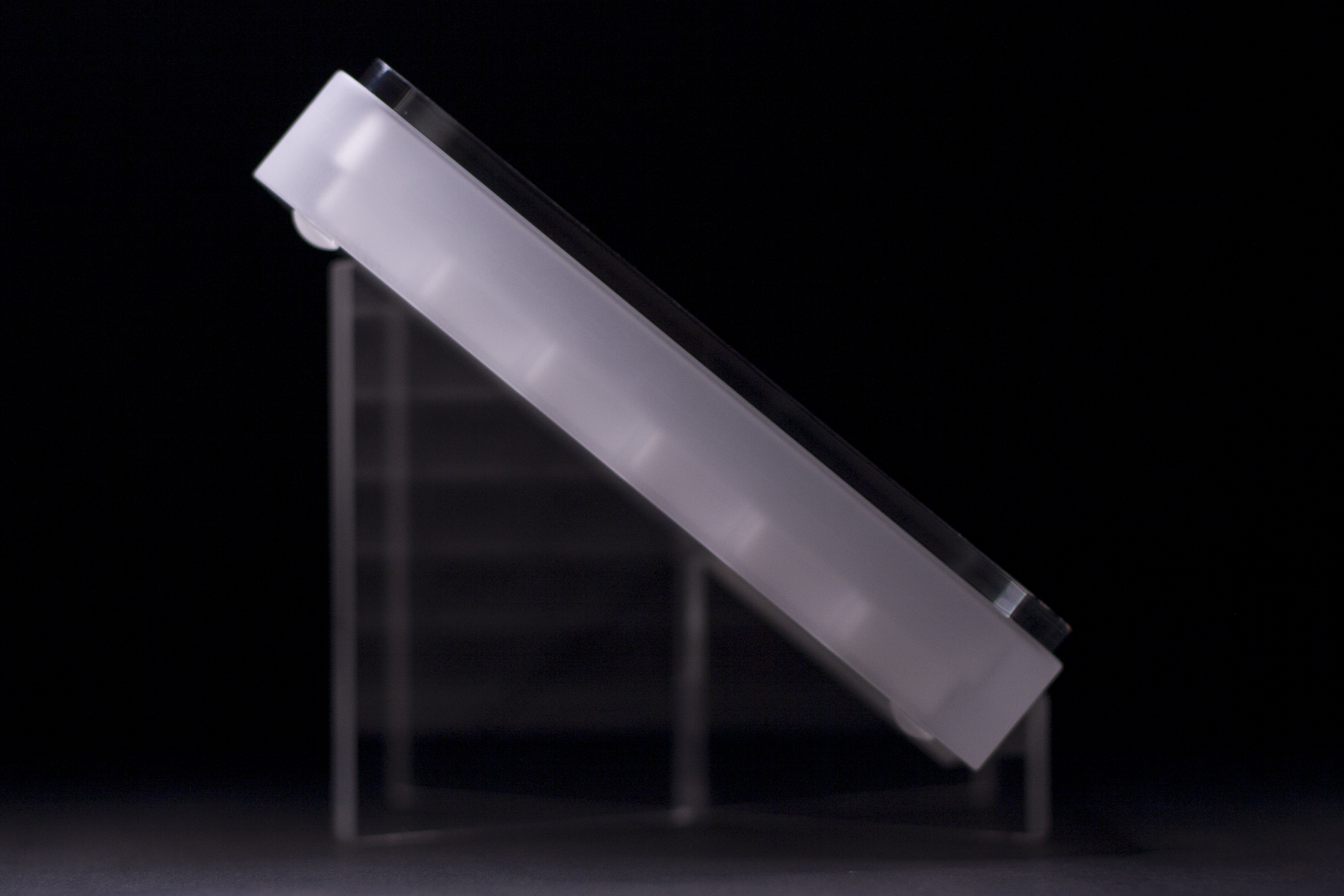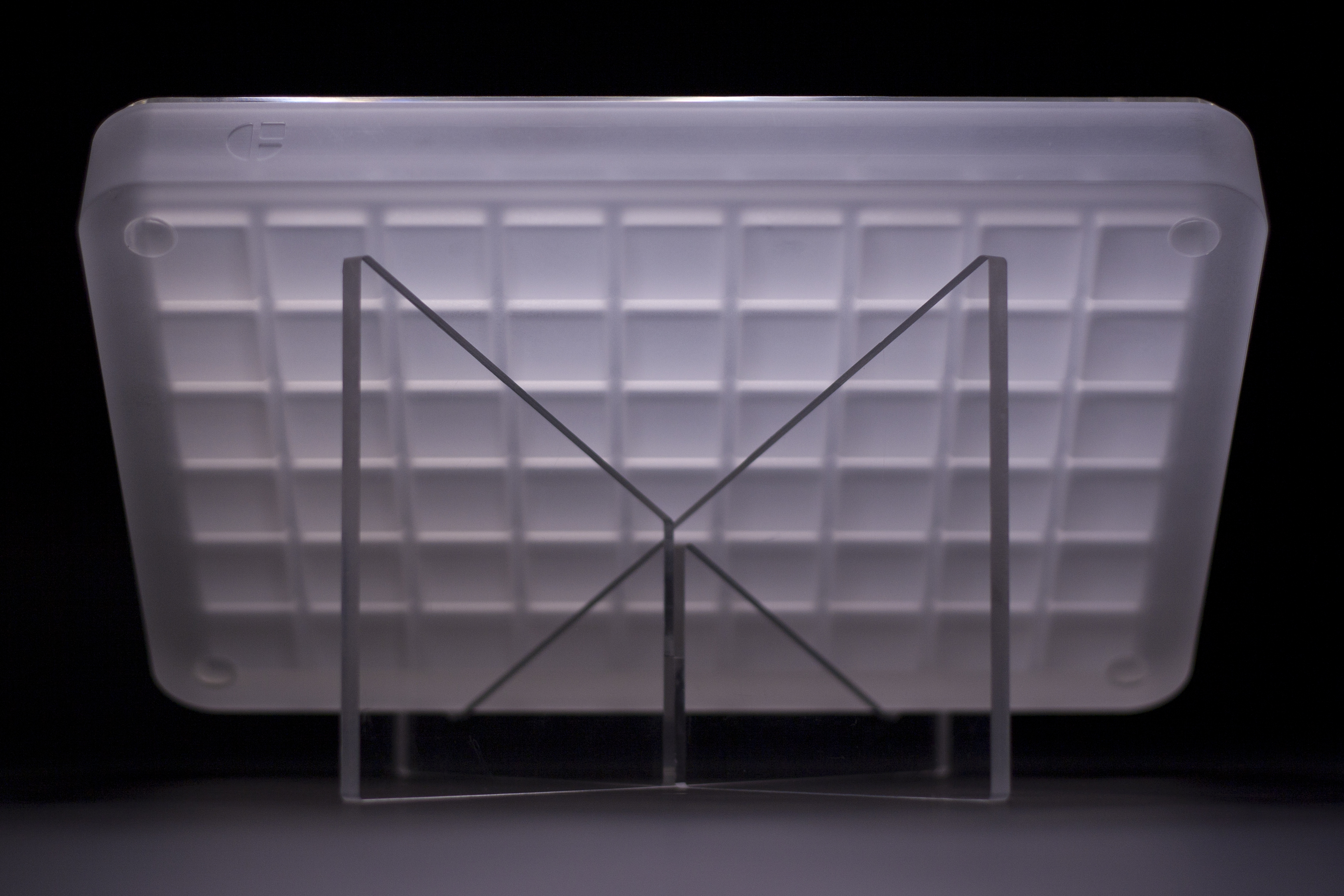 Specifications - 54 slots (6x9) - Precision machined CNC acrylic case - Stainless steel timestamp ring - Acrylic display stand (machined & allowing for portrait view) - Glass bead-blasted finish - PlexiGlass hard-coated lid with UV protection - more details on PlexiGlass UV Hard Coat - Charcoal travel foam - Translucent silicone travel band - Translucent bump-on x 4 - Cell dimensions (LxWxH): 0.83" x .0.83" x 0.81" - Cell wall height: 0.34"