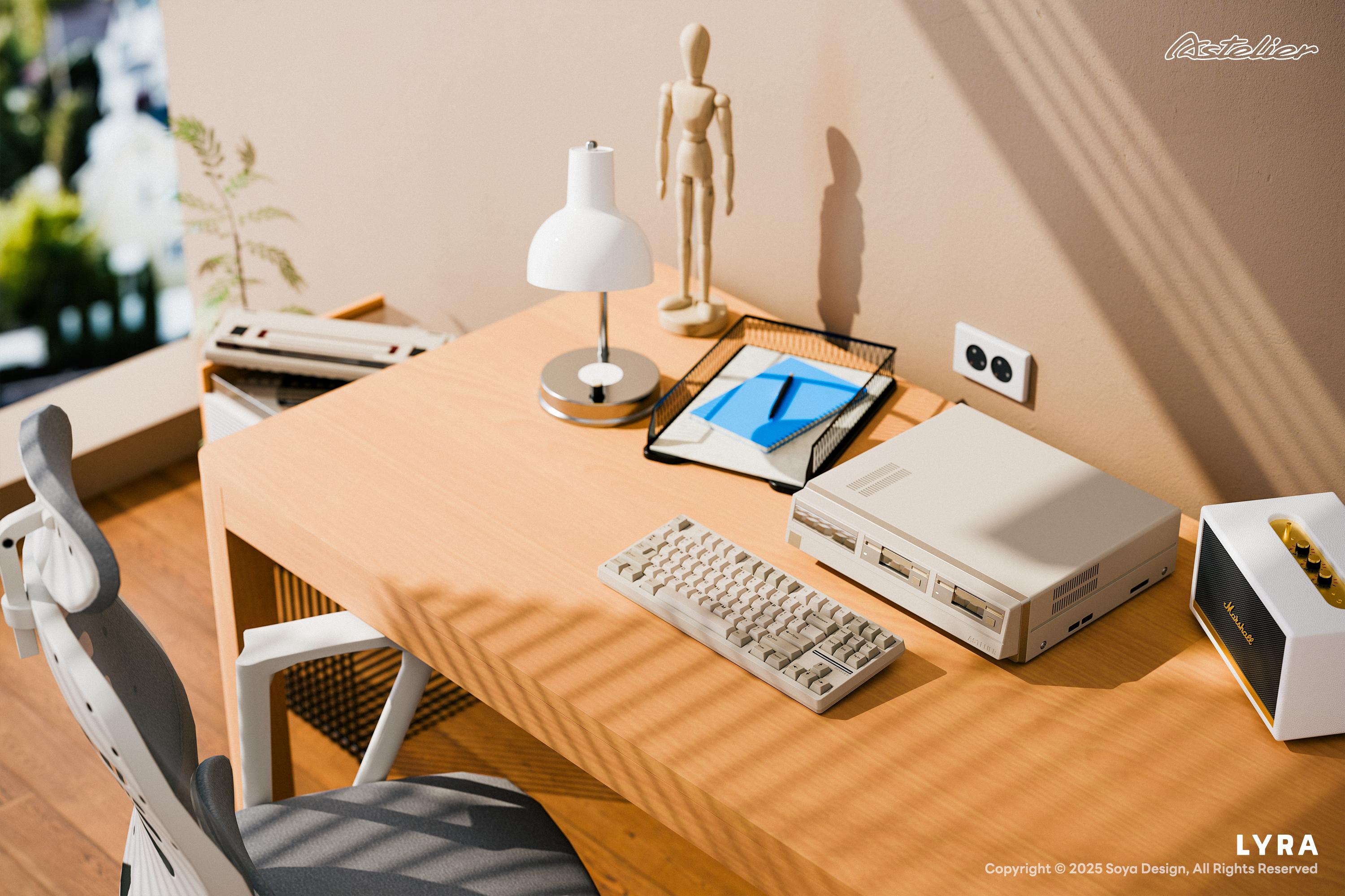 LYRA retains many design elements from its predecessor: symmetrical cable outlets on the side strips, lines running through the side strips, and a weighted frame extending outward from the base. Additionally, the side strips feature an LED strip design.