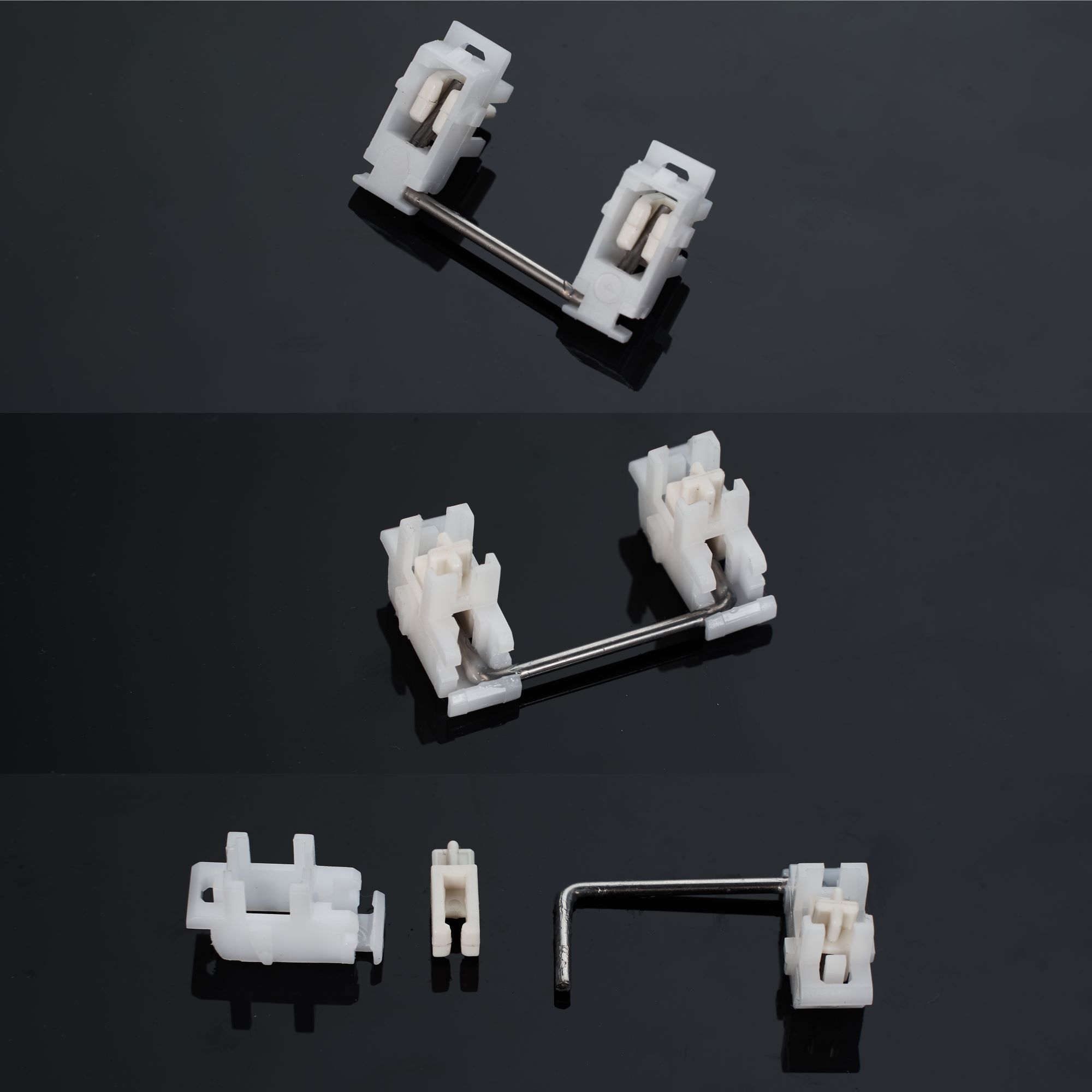 We designed new plate-mount Cherry-style stabilizers that can fit the plate perfectly. The sound and feel of the stabs are on-par with PCB-mount stabs.