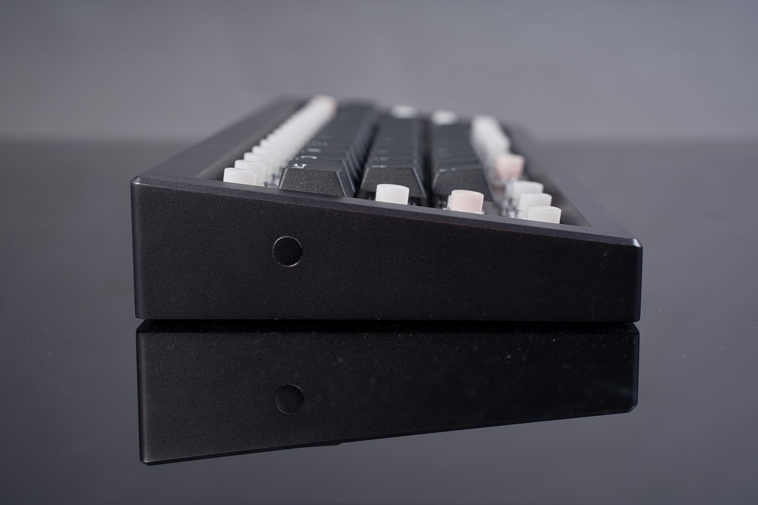 Vertical: The vertical front and back walls look cleaner than most regular keyboard designs. To achieve this goal, the aluminum bars need to be re-adjusted for more times during the CNC milling, which significantly adds the costs.