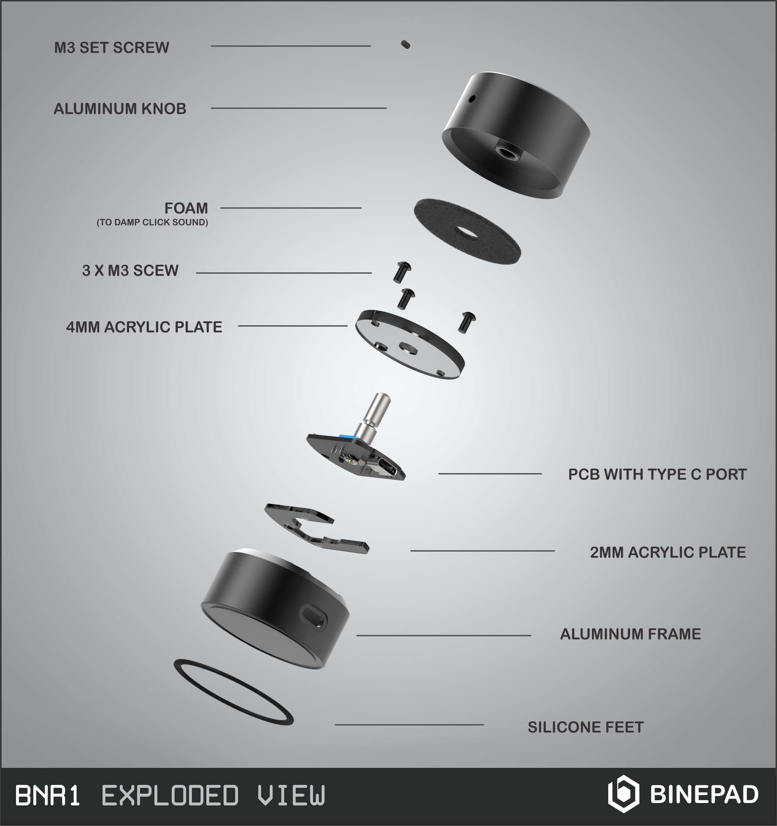 BNR1 is a multifunction knob, which can be rotated, pressed, and rotated while pressed. These actions can be programmed to invoke specific responses from a range of computer applications, such as video editing, volume, brightness, media player and many more.