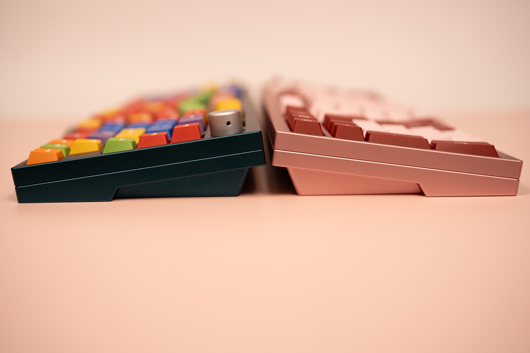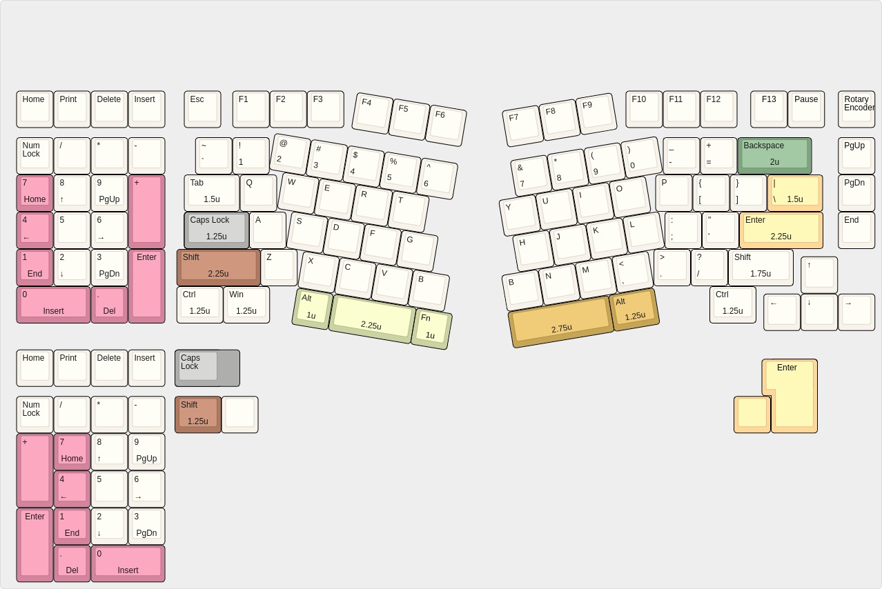 https://cannonkeys.com/products/spv1-keyboard), which was a "1800CP" with a 75% arrowcluster and a southpaw numpad because southpaw rocks. For CP Ergo, we wanted to translate this idea into the Alice layout albeit with a slightly reduced angle (9.5 degrees) which allows us to put a rotary at the F-row and also support ISO for the bad tasted respectable people that like it.