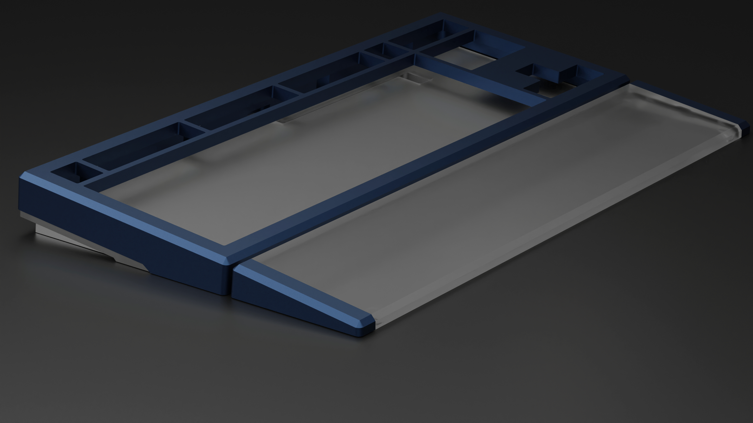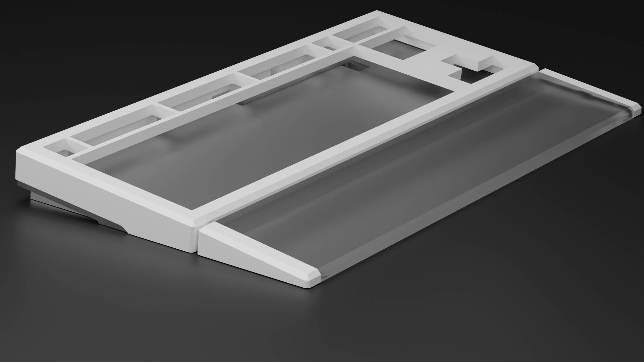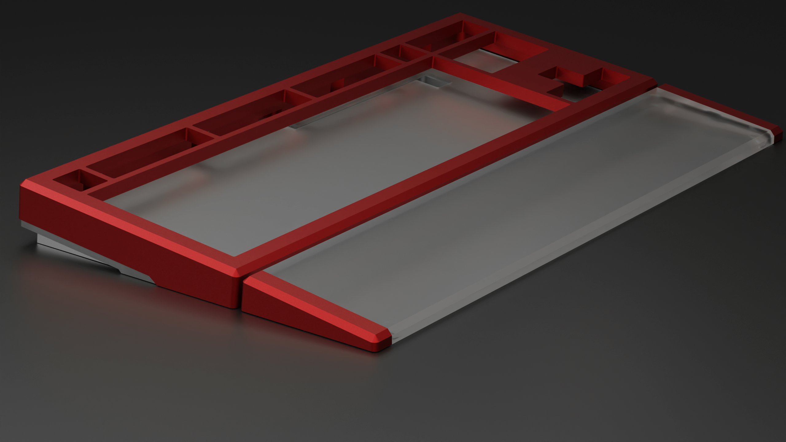 The purpose with the project was to focus on desk aesthetics, as in how the keyboard looks standing on your desk (which it does 99% of the time). So the design choice behind the split corner weights is that they give the keyboard a nice side profile, adds weight and cost less to produce. Having one solid weight across the back would not only increase the price, but the keyboard would still look the same on your desk, and this is not where I wanted to go with the project. Instead, this money can be spent on the matching wrist rest which actually contributes to how the keyboard look and feels.