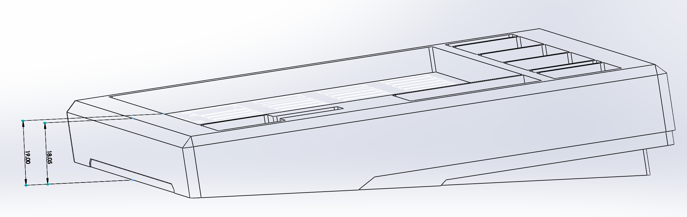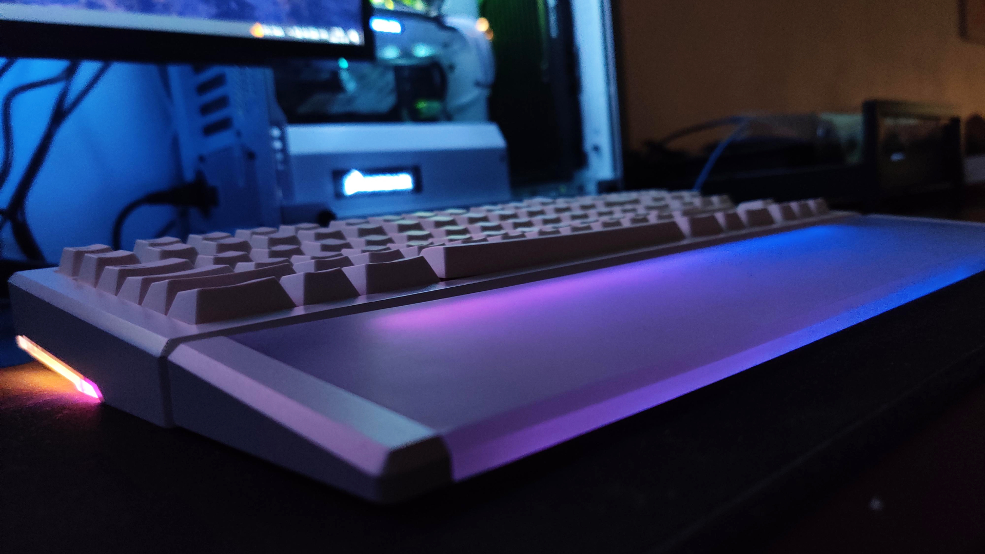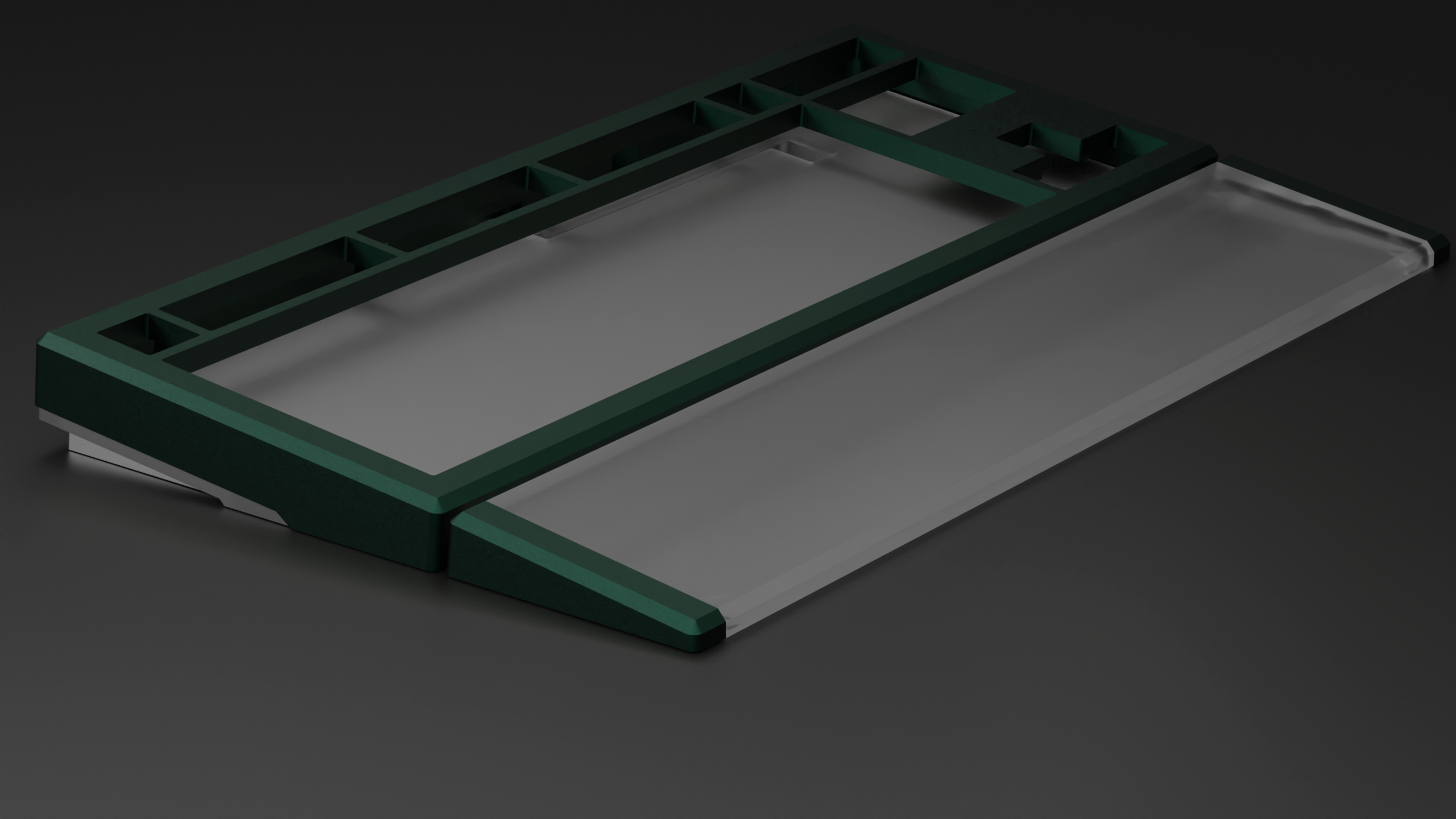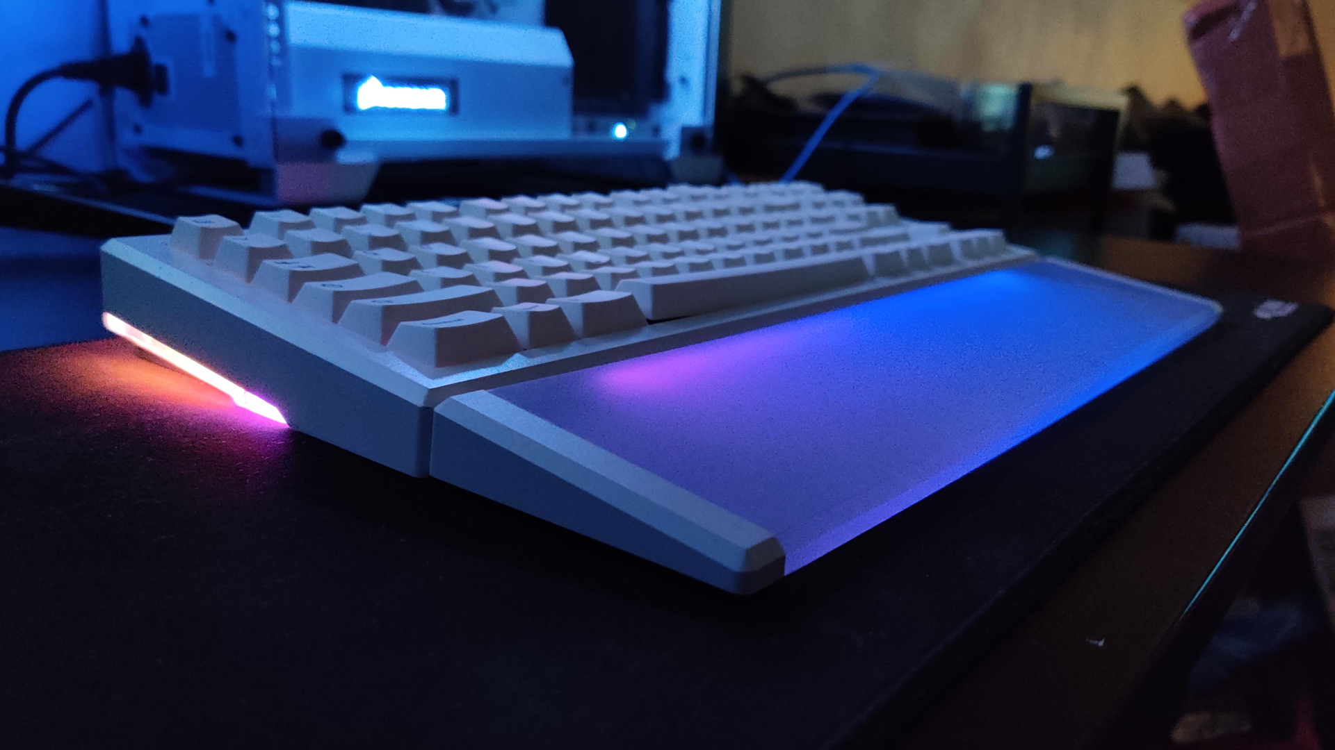The purpose with the project was to focus on desk aesthetics, as in how the keyboard looks standing on your desk (which it does 99% of the time). So the design choice behind the split corner weights is that they give the keyboard a nice side profile, adds weight and cost less to produce. Having one solid weight across the back would not only increase the price, but the keyboard would still look the same on your desk, and this is not where I wanted to go with the project. Instead, this money can be spent on the matching wrist rest which actually contributes to how the keyboard look and feels.