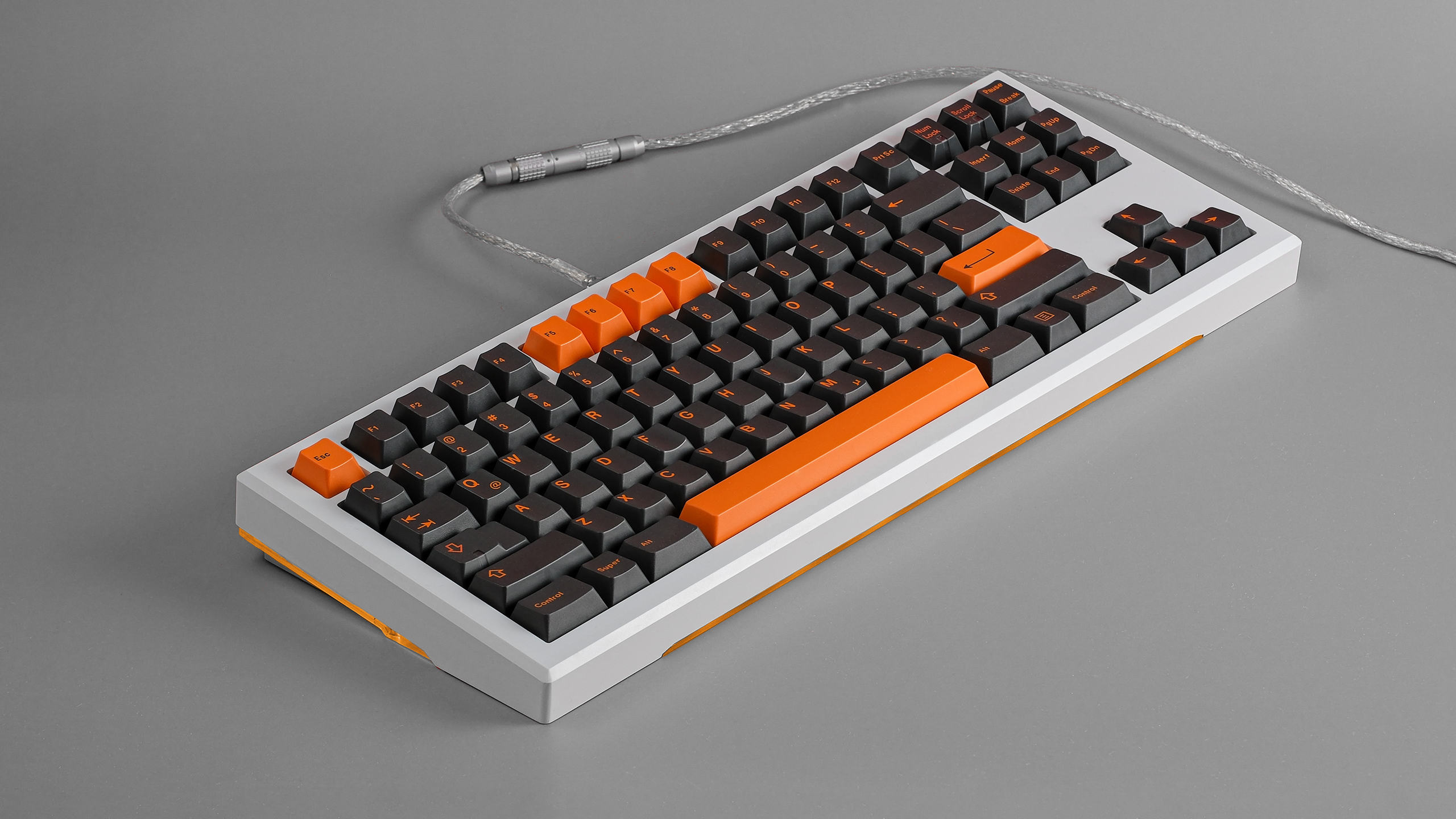 Keyboard SizeTKLTyping angle6°Front height19mmKeyboard weight2kg builtCase topAluminum 6063Case bottomFrosted polycarbonate, coated with a scratch resistant finish on the outside for protection and a nice glossy look.Weight materialBrushed stainless steelPCB Plate materialsAluminum, PC, POM, FR4. (All in black color to prevent light bleed)Wrist rest materials Aluminum 6063, Polycarbonate (frosted)Wrist rest dimensionsLength: 373mm, Depth: 82mm, Height: 17.5mm