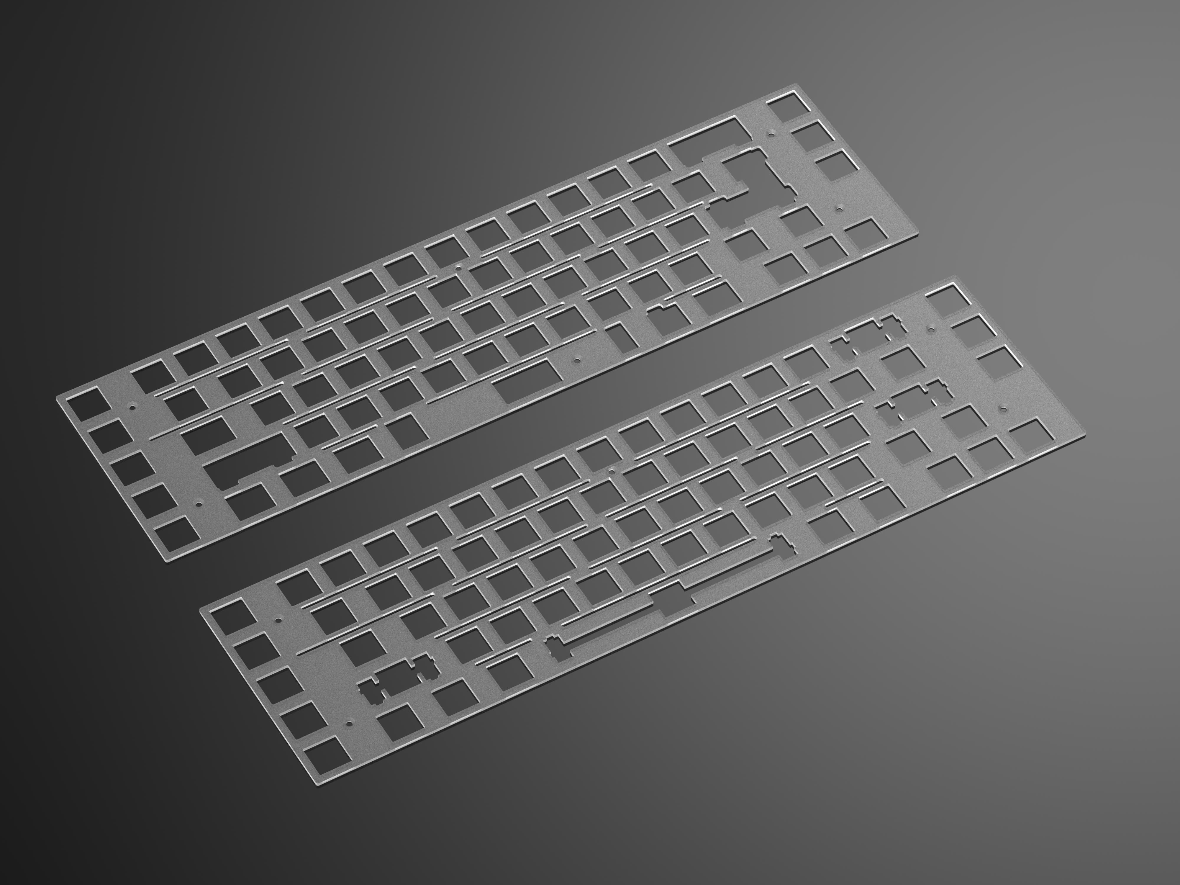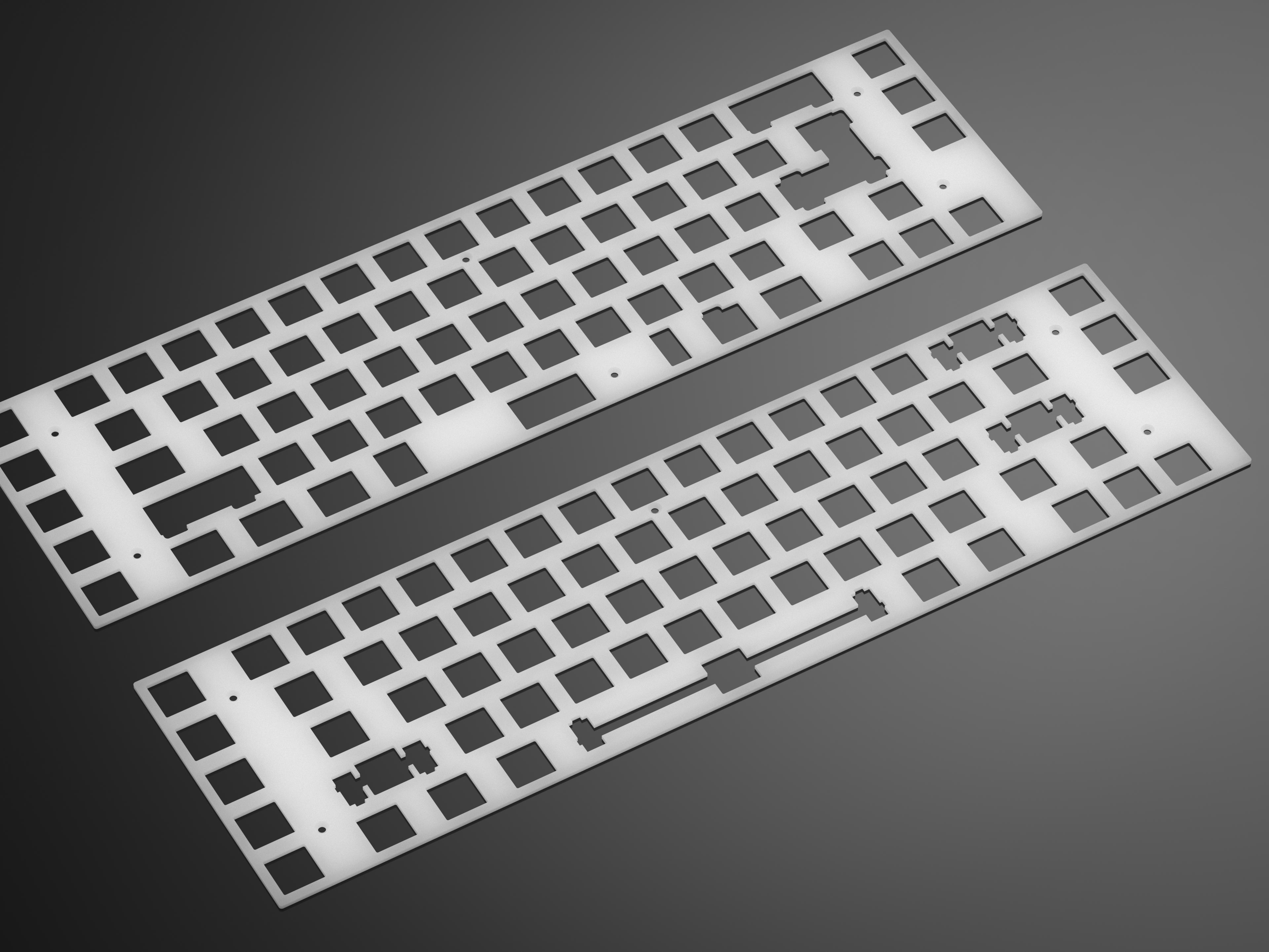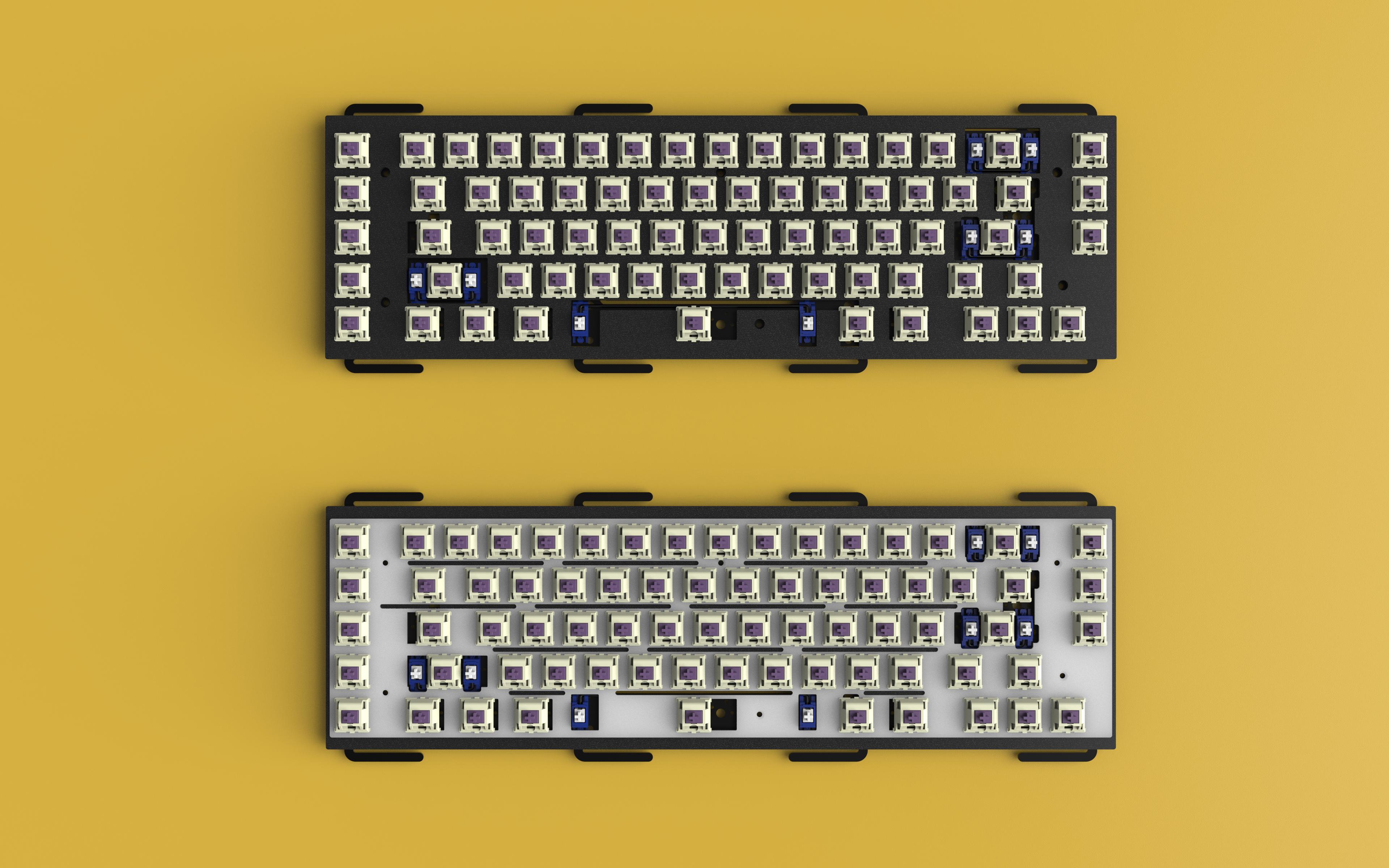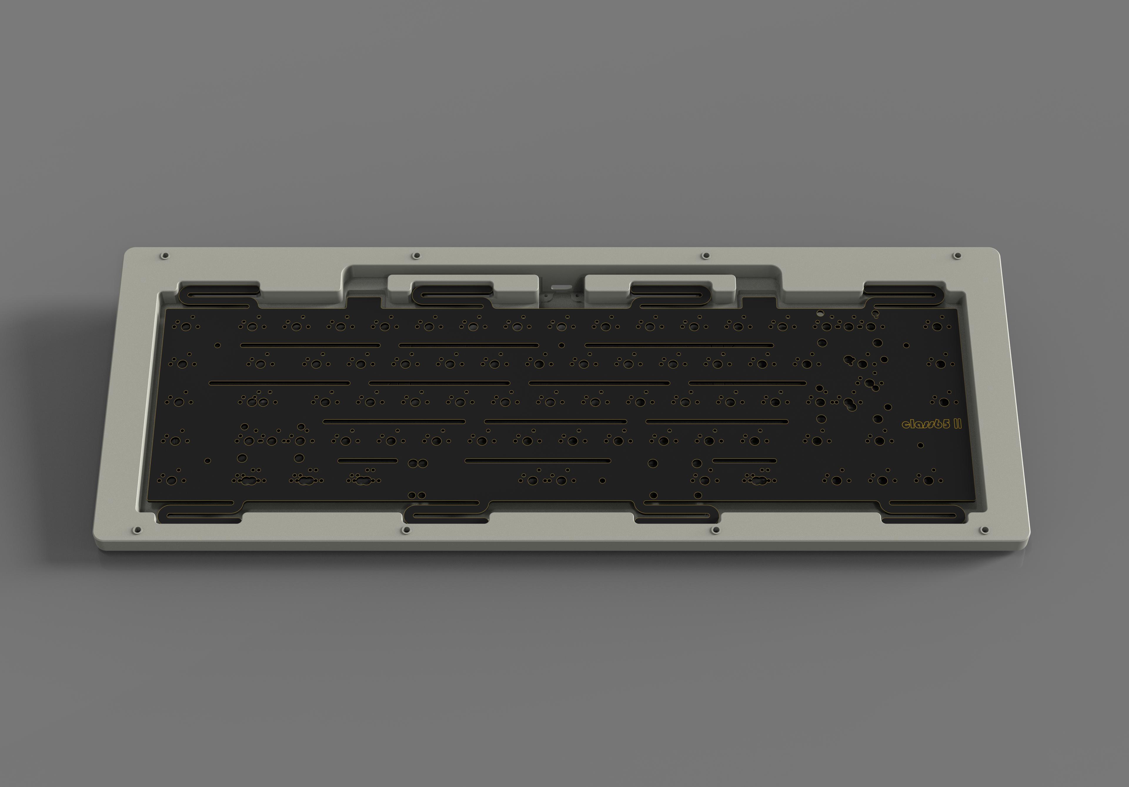 The Class65 features a Macro column and an exploded 65 column, with a plateless design. It uses leaf springs gaskets in order to have a both soft and bouncy typing experience. There is an optional POM plate. To help give it a strong sound we implemented a hidden brass weight. We will offer two types of plates PCB mount and Plate mount. This option was done because we wanted to allow for others to chose what they wanted. The ease of access to stabs with plate mount, or the stronger connection with PCB mount. Final design decision was center USB-c Port because Centered life is best life.
