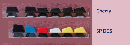 Comparing DCS to cherry profile, the corners are rounded, and the caps are a bit thinner with a slightly taller profile. This allows them to not be affected by keycap interference resulting from a north-facing switch configuration.