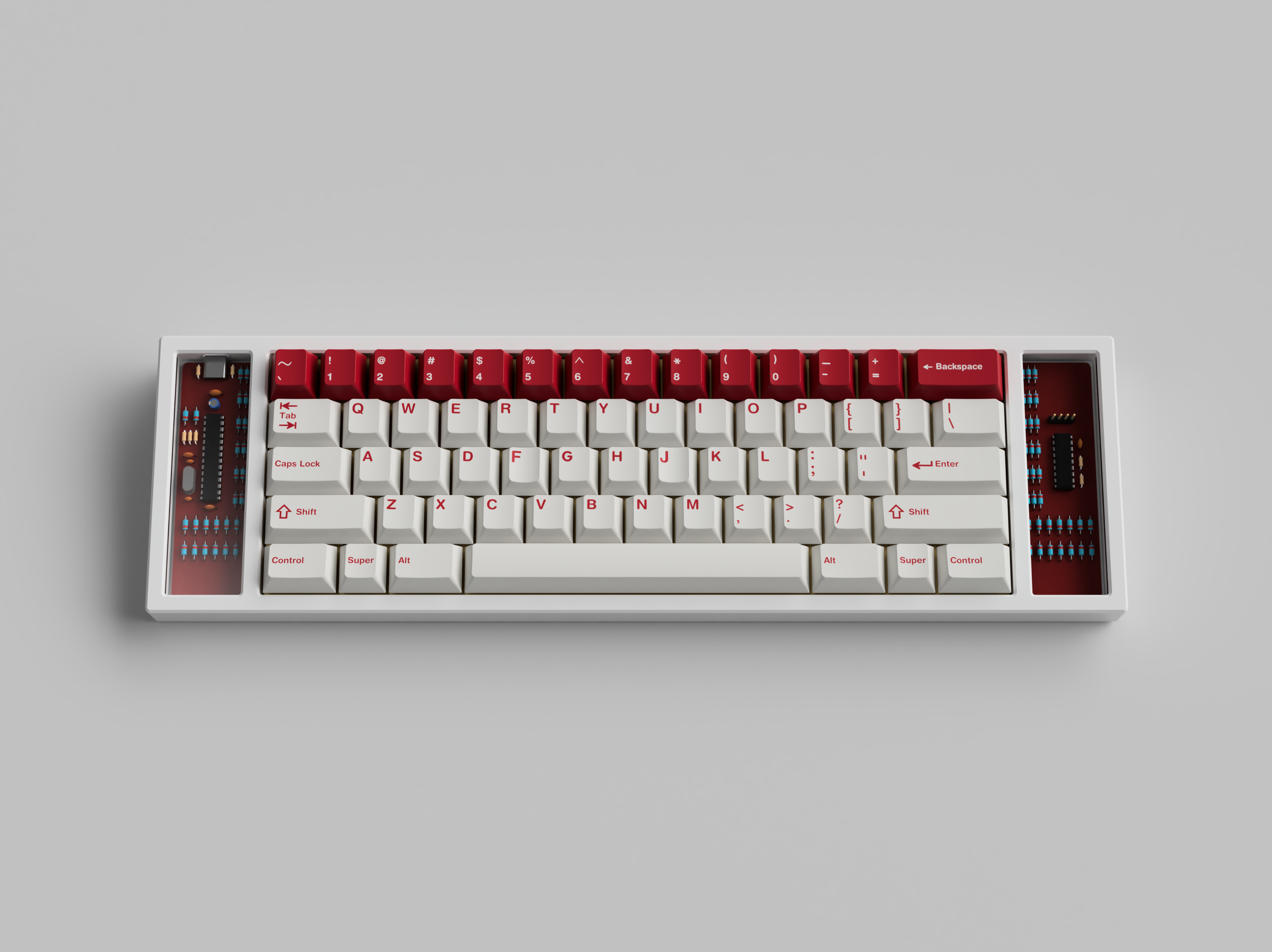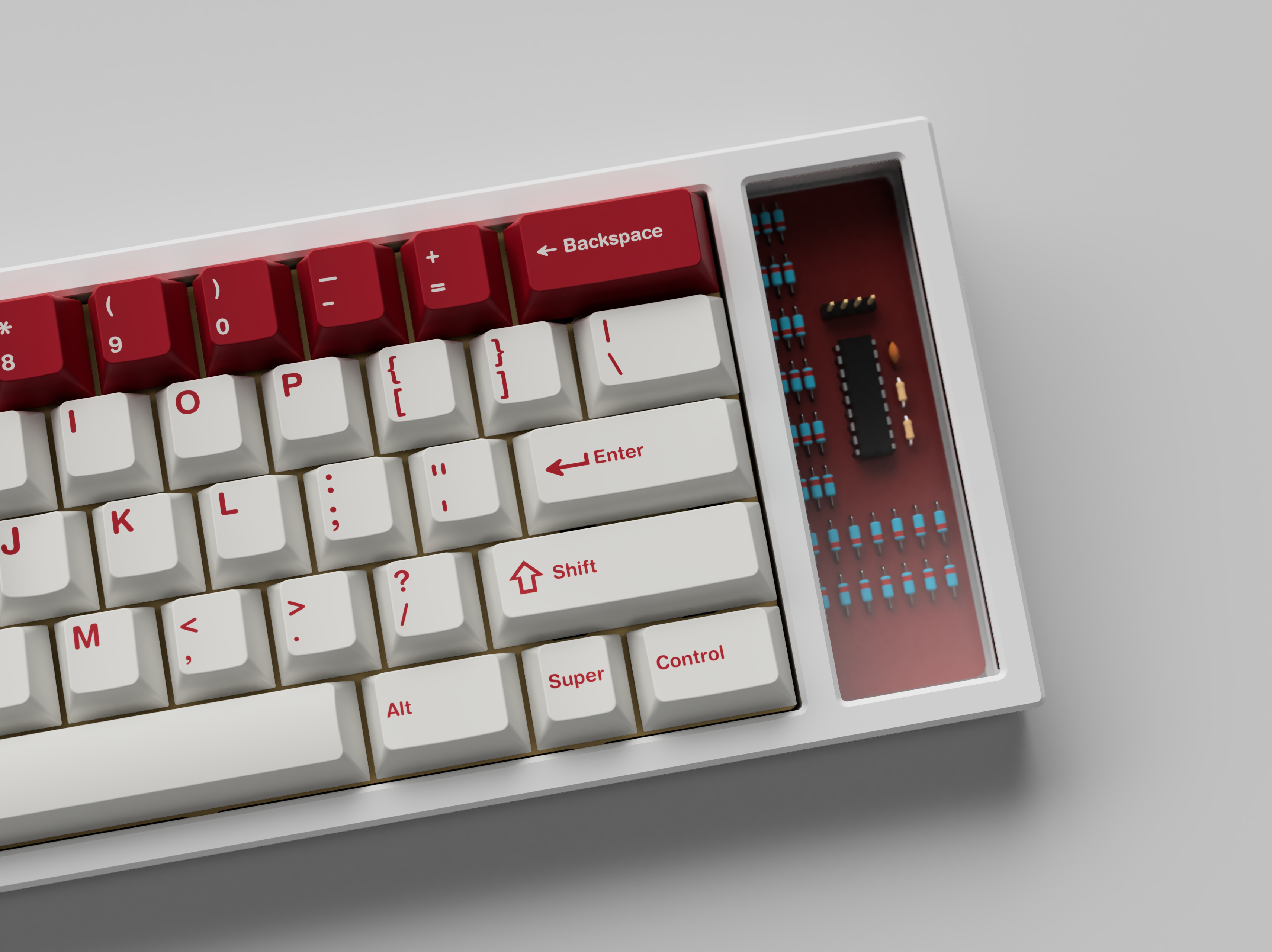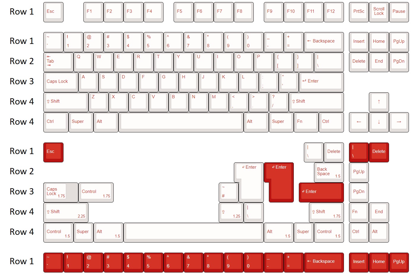 Design:Rebel / Red Alert is a classic colorway. It has had many variants but the one that I love the most and the one that is running is all Red on White with the option of a White on Red num-row which has been extended to the navigation cluster. The original colors were WFK for white and RBV for red. However, the red has been changed to RDD, a stock color, to keep the prices down. I have also opted for text + icon modifiers.