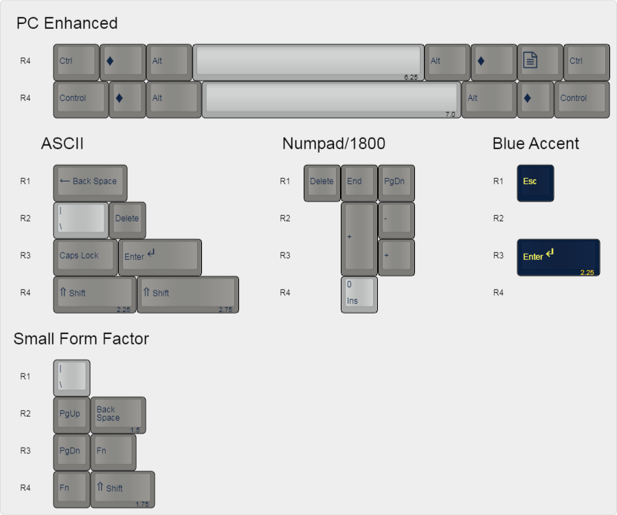 ASCII and Gate Array keycaps have text-only modifier legends in a nonstandard top-left position, while the PC Enhanced keycaps have text+icon modifiers in standard center-left position. Signature Plastics DCS legends are positioned center-left, so I am choosing legends to match the PC Enhanced design. The ASCII and Gate Array modifiers will still look good with this kit, but it won't be a perfect 1:1 match.