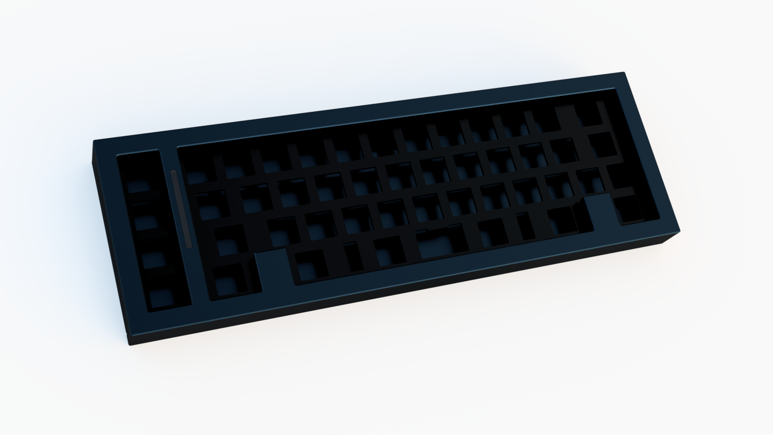 This board is my ideal for a staggered 40% keyboard layout. The 12.75u main cluster gives me the right amount of punctuation and keys to do everything I want without an abundance of layers, while also reducing hand travel as I type. I wanted to include a macro column both for additional flair and as a display piece for artisan keycaps. I thought the LED strip would also serve as a nice visual piece and an homage to one of the board's primary inspirations, the TMO50.