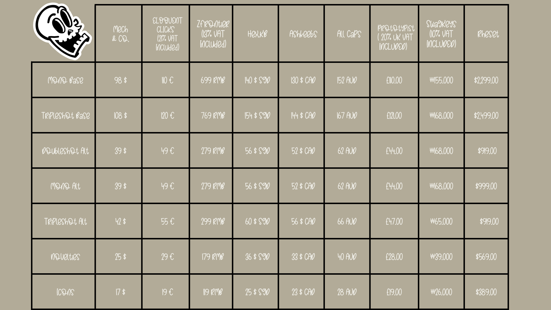 Europe: ELOQUENTCLICKS China: Zfrontier United States: Mechs & Co United Kingdom: Prototypist Canada: Ashkeebs South East Asia: Hex.kb Korea: Swagkeys Oceania: Allcaps Mexico: Rheset