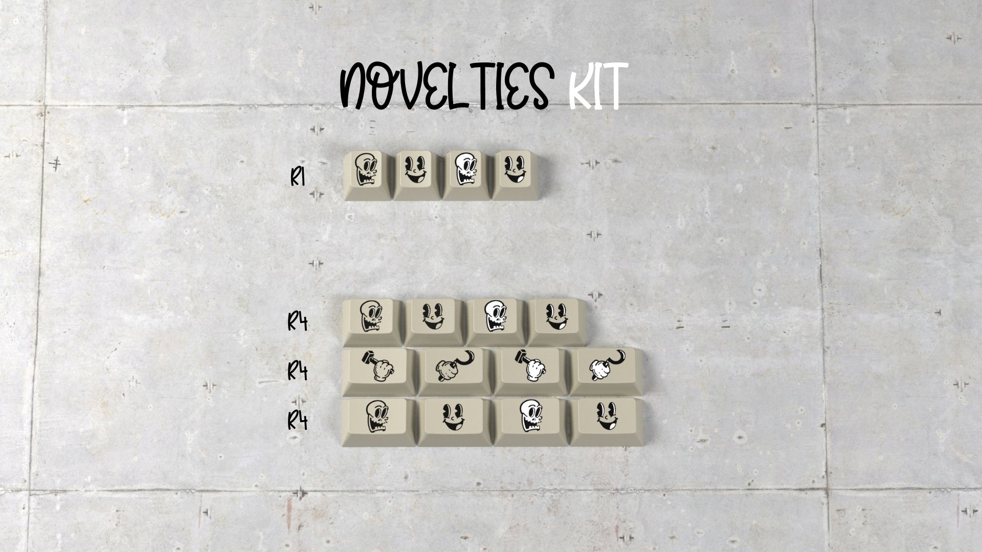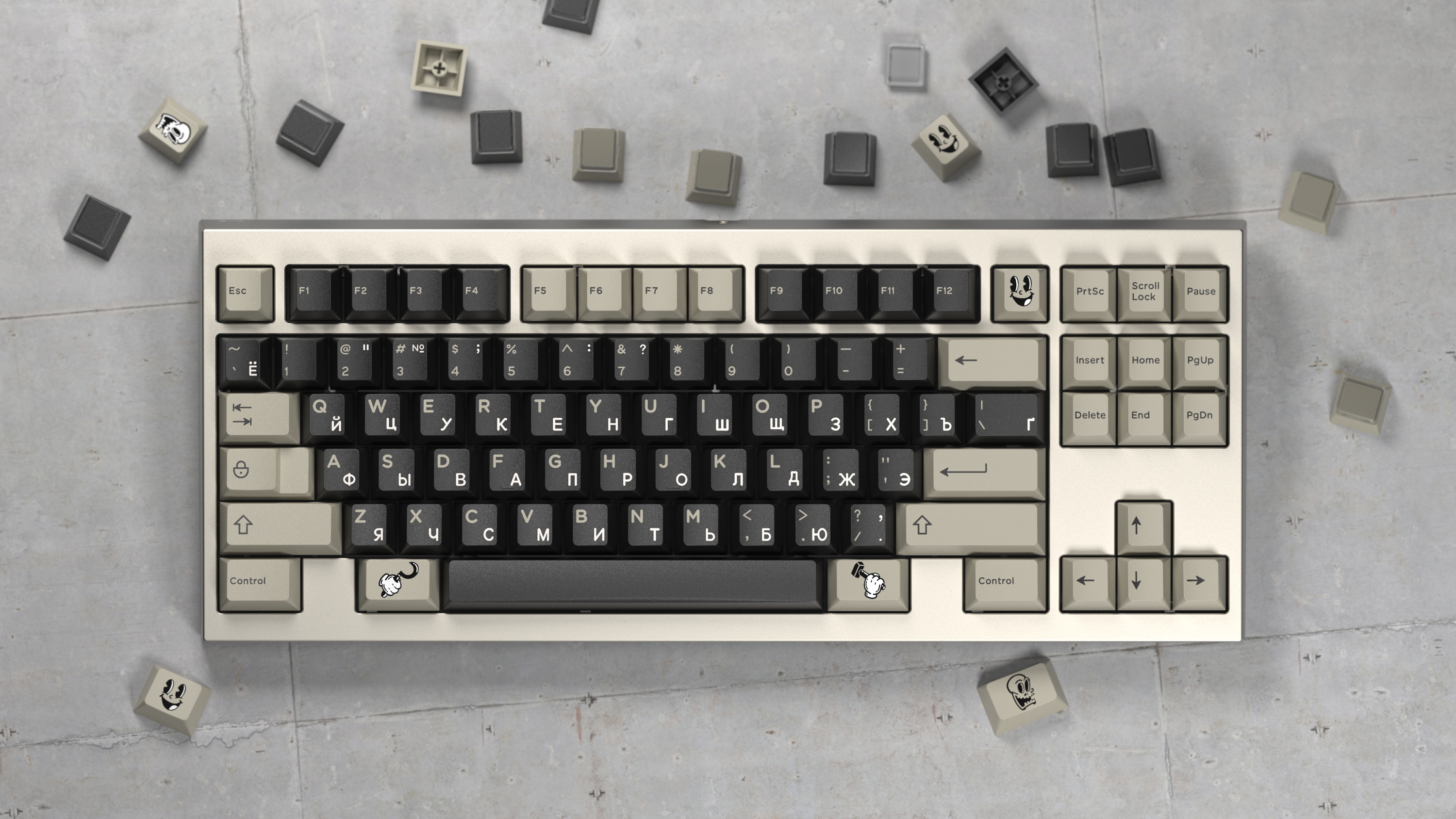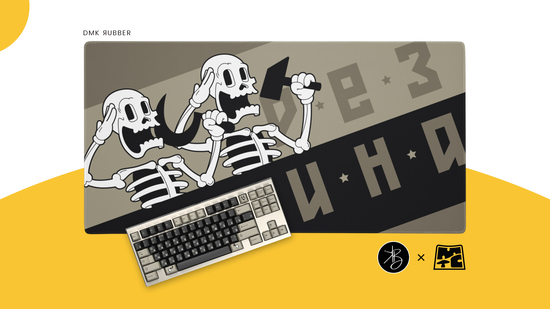 Hello, Manu from ELOQUENTCLICKS here (my actual name is Manu, I’m not a manufacturer, please stop). I am introducing my first set of keycaps, DMK ЯUBBER, a set that seeks to show what would have happened if Rubber Hose drawing style had been invented in the former Soviet Union.