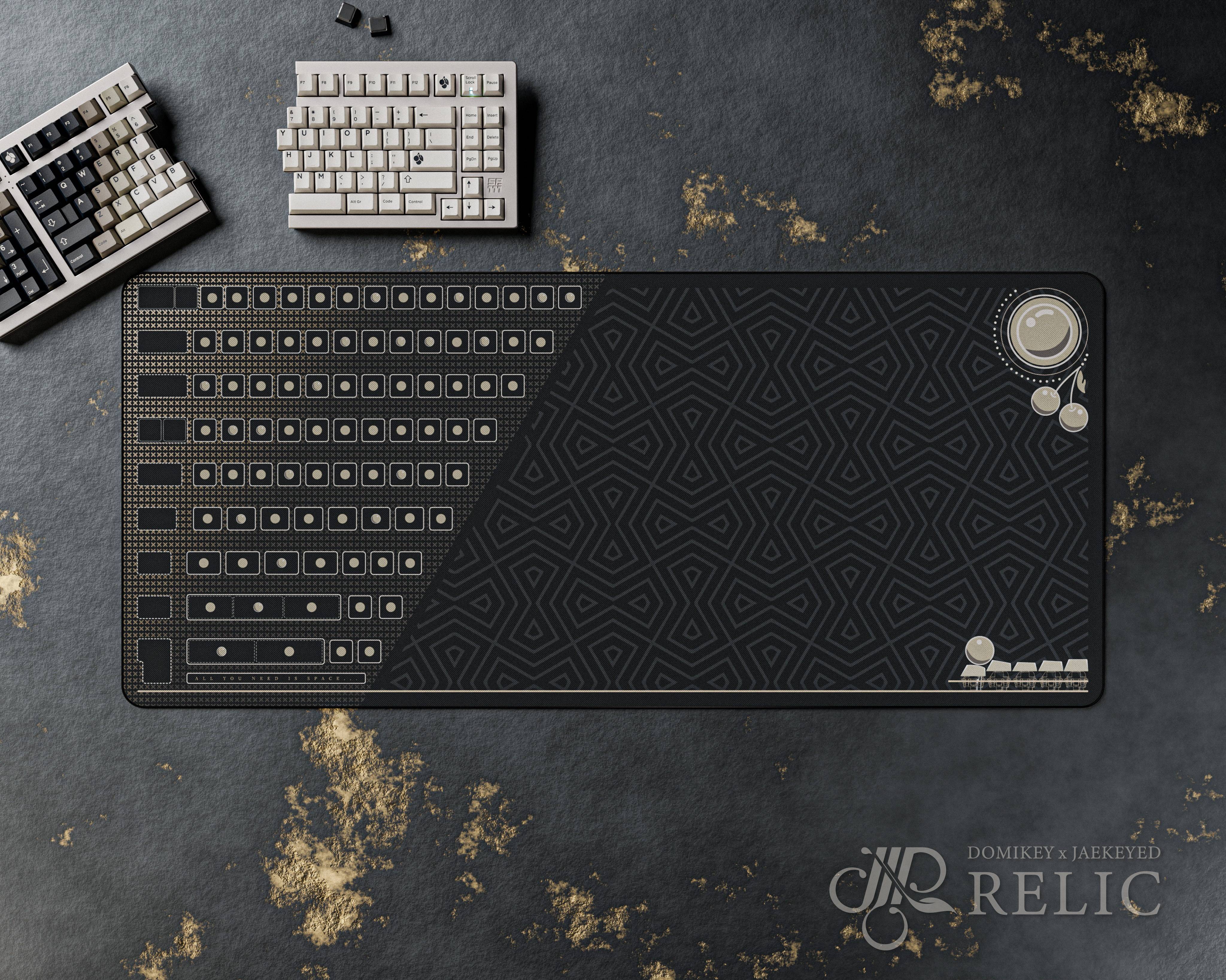 I want a functional deskmat, so I changed the original deskmat design into this new one. Whenever I change my keycaps, I always want them organized. People can use this deskmat to arrange their keycaps while building their boards. Since Relic is Cherry inspired, I incorporated the same elements as the previous deskmat design while adding some 'cherry balls'.