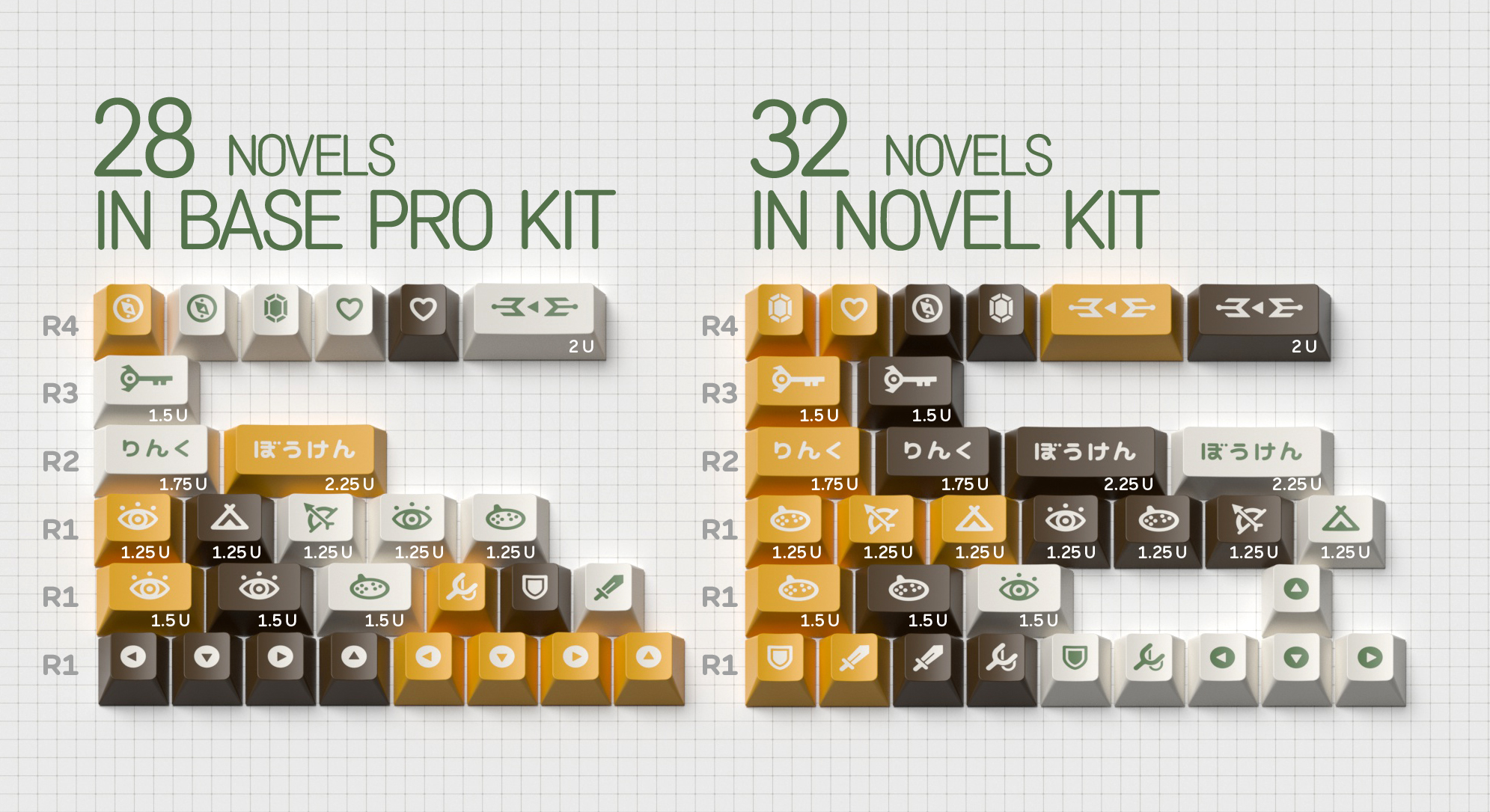 Due to the addition of R4 2U Novelkey (backspace) and R3 1.5u Novelkey (TAB), the purchase of base and additional alpha will enable the assembly of two keyboards