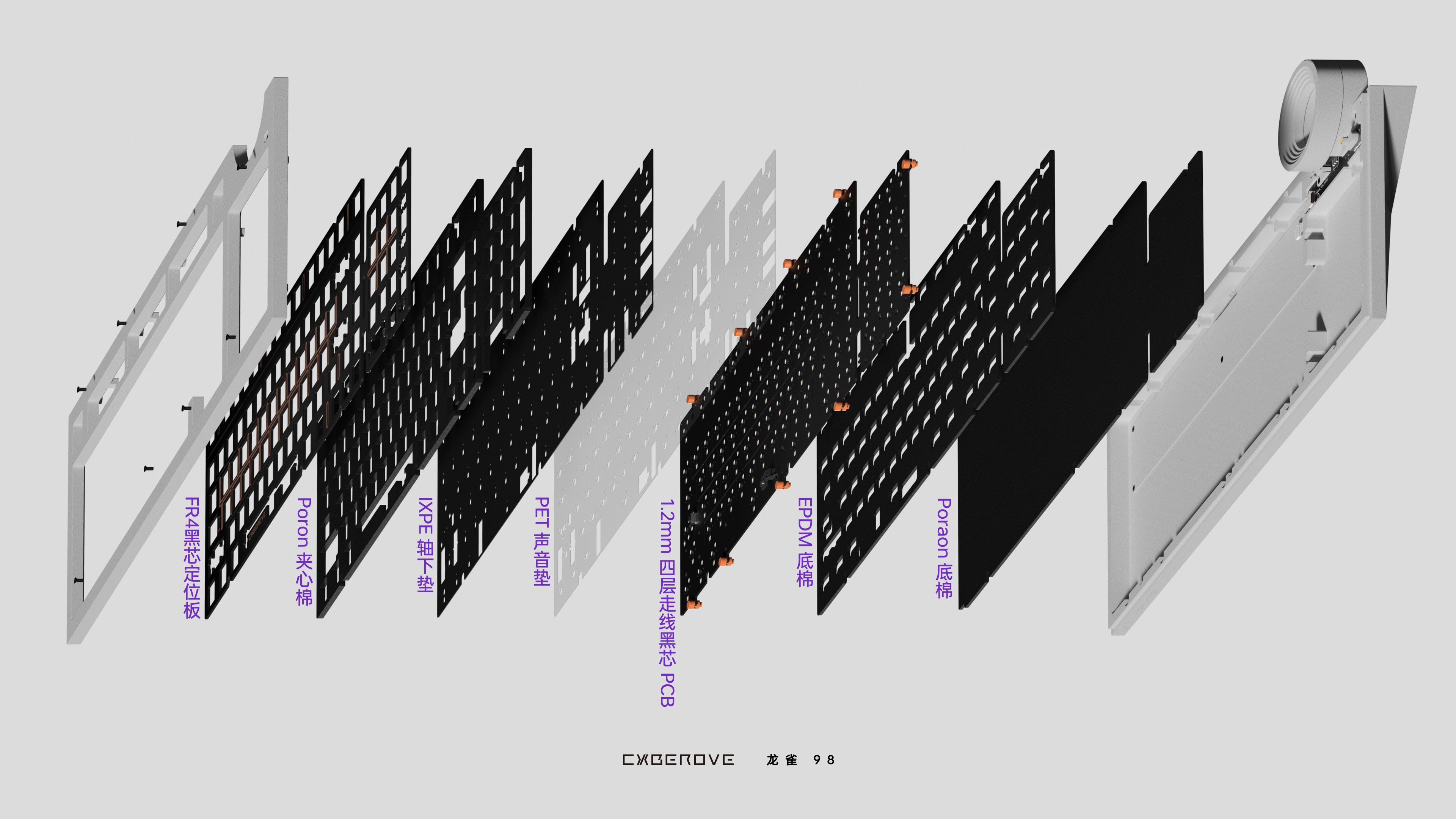 The "Dragon Sparrow 98" features a PCB Gasket structure, supported by 12 silicone columns that hold the entire interior.