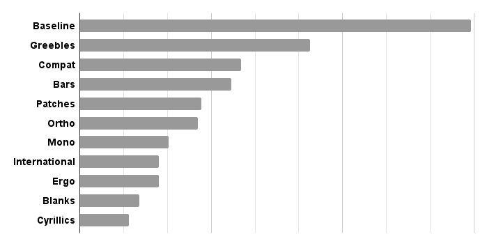 differences between the fonts (e.g. some letters feature stroke direction changes that come with an additional horizontal transition, making these letters slightly wider).