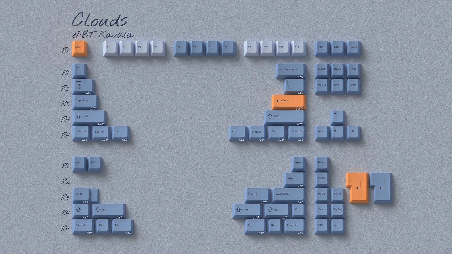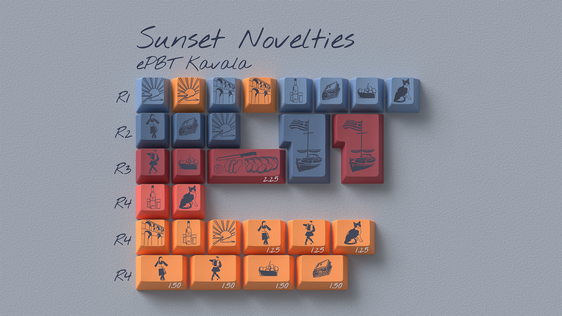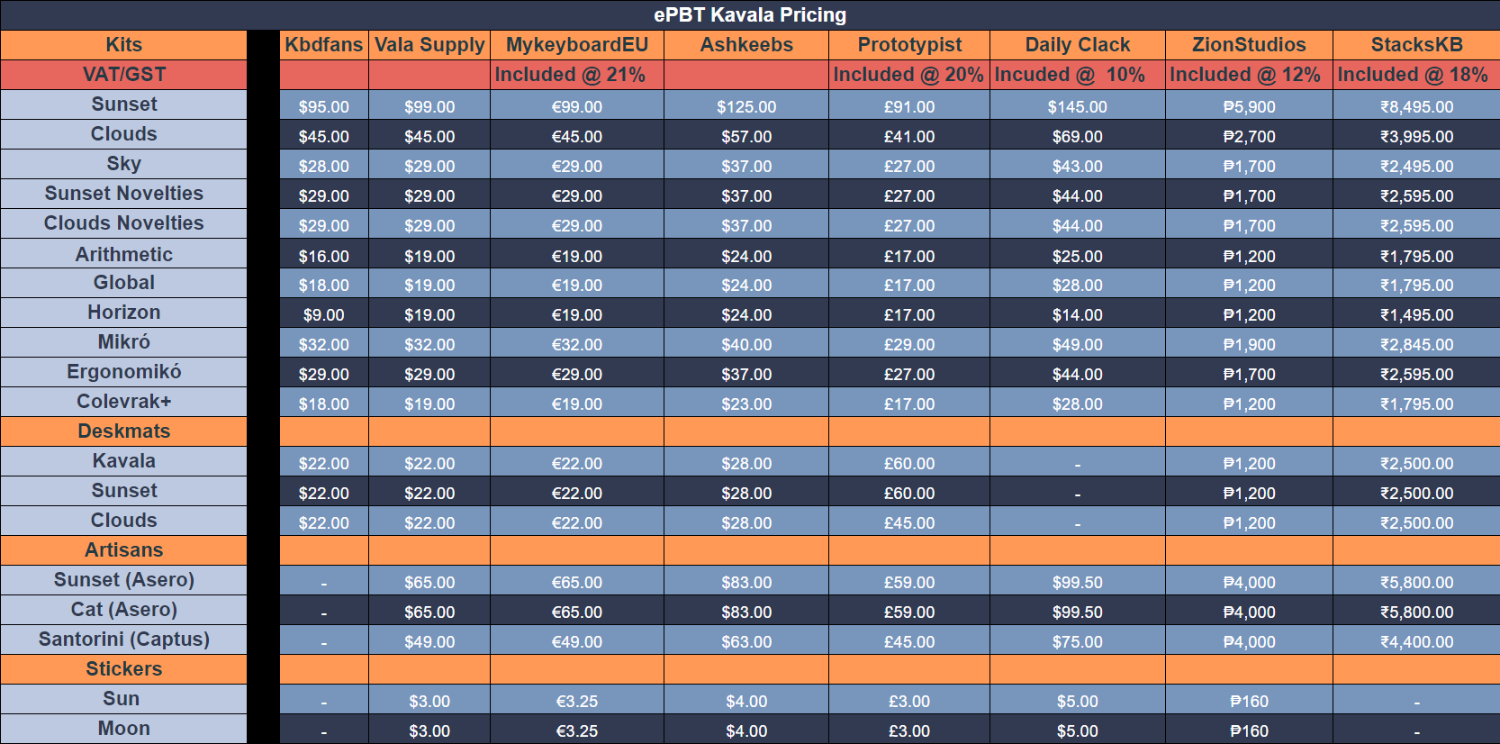 ePBT Kavala GB October 1 - November 1, 2021 Kavala (pronounced Kah-vaa-lah) is a town in Greece, and my mom’s hometown. I was inspired by a beautiful picture of a sunset my uncle took while on a walk. ePBT Kavala is a pbt dyesub set that is designed to capture how the last sunlight of the day plays amongst the clouds, creating a mesmerizing gradient of color from the open sky to the horizon. Vendors Estimated Delivery: June 2022 Global/AS: Kbdfans US: Vala Supply EU: MykeyboardEU CA: Ashkeebs UK: Prototypist OCE: DailyClack PH: ZionStudiosPH India: Stackskb Pricing Kits