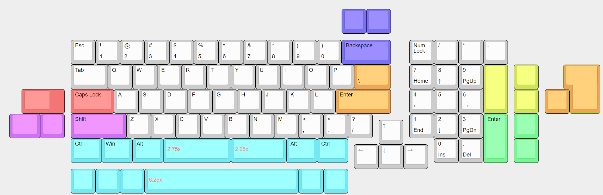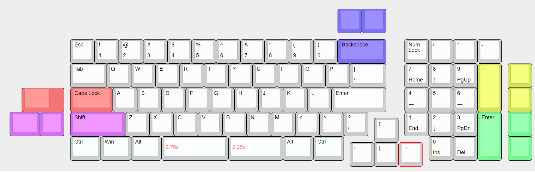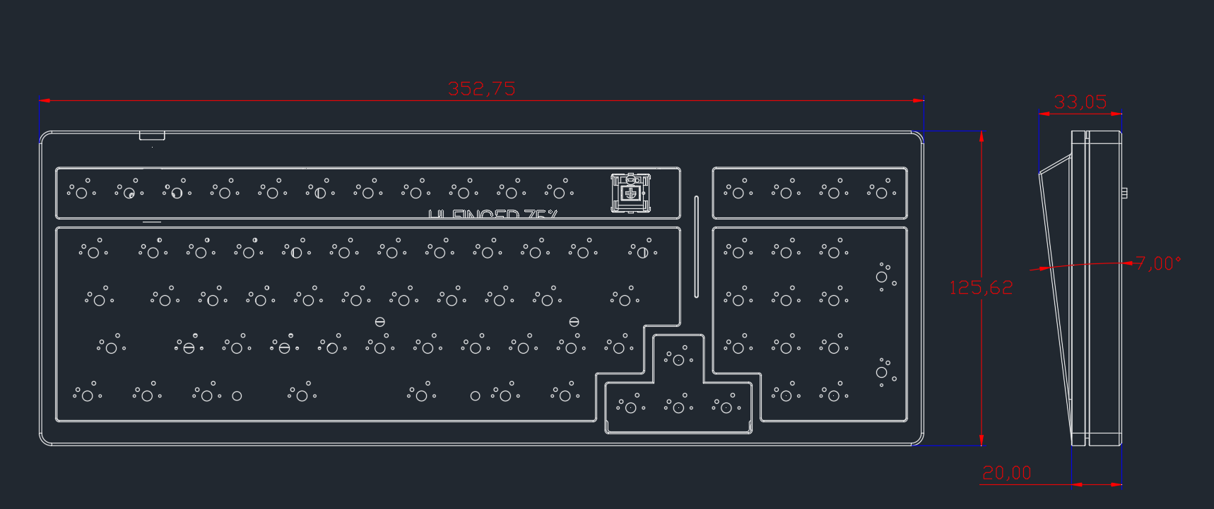 First of all, this is a 74 keys keyboard, based on layout 980 but some different, such as the key; and ‘’ next to L,changed to the Shift + K and Shift+L, and the [] key next to P has been reduced to Shift +\(the key below BS).then 6.25 spacebar spit to 2.75 U+2.25 U,the purpose of the spacebar modification is not to need to buy a big set of keycaps, the second is to be able to add a custom key for this keyboard Next, look into the structural features,