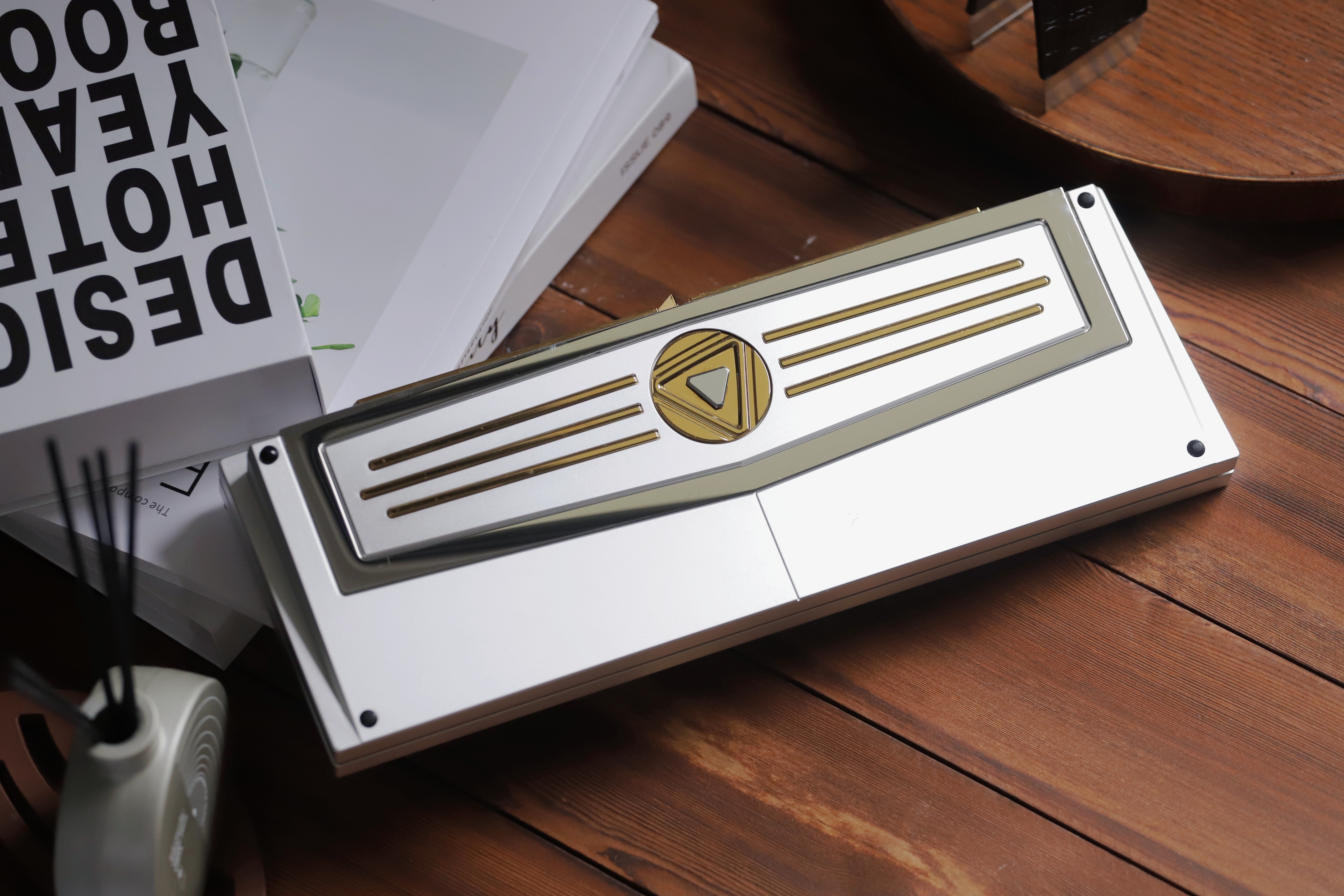 Back Design In the back design, the designers refined the edges of the weight-carrying frame, significantly enhancing its visual appeal and giving the product a more sophisticated and elegant look. They seamlessly incorporated flowing lines that extend from the center of the keyboard's bottom case to the edges of it. With a slight angle on the bottom case, these lines spread outward like a pair of wings. This design not only elevates the keyboard's aesthetic but also imparts a sense of refined harmony to the entire rear view.