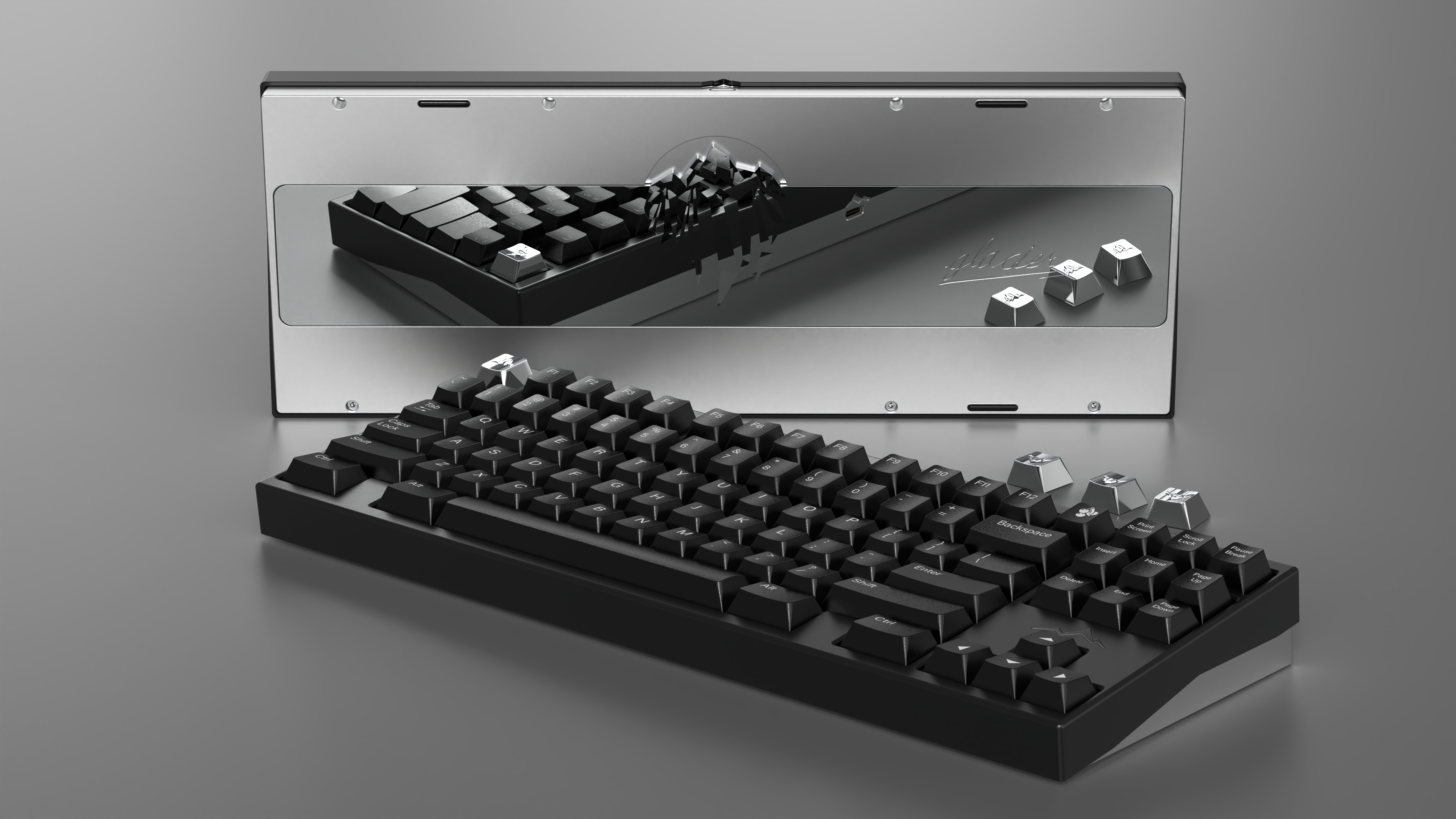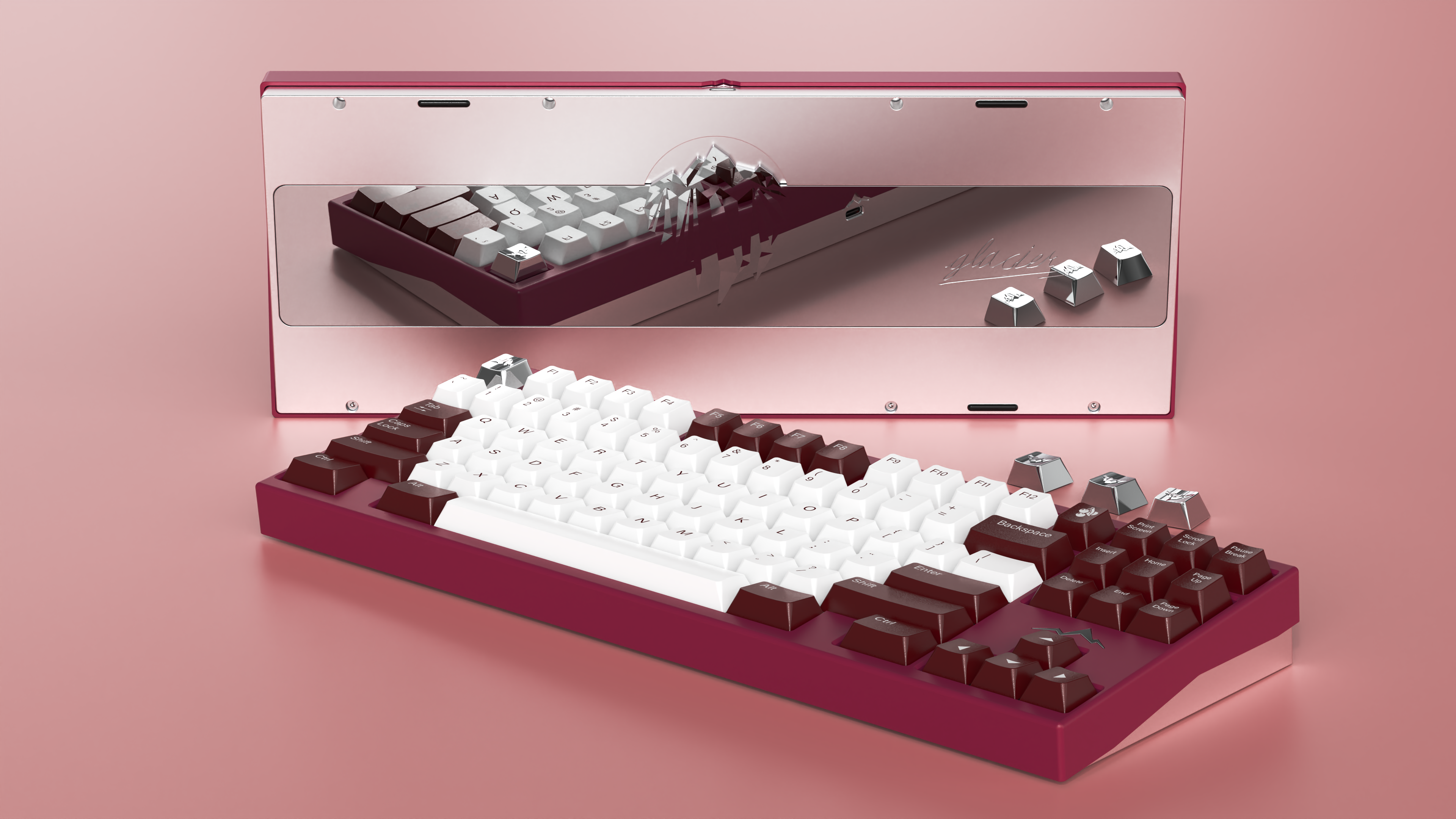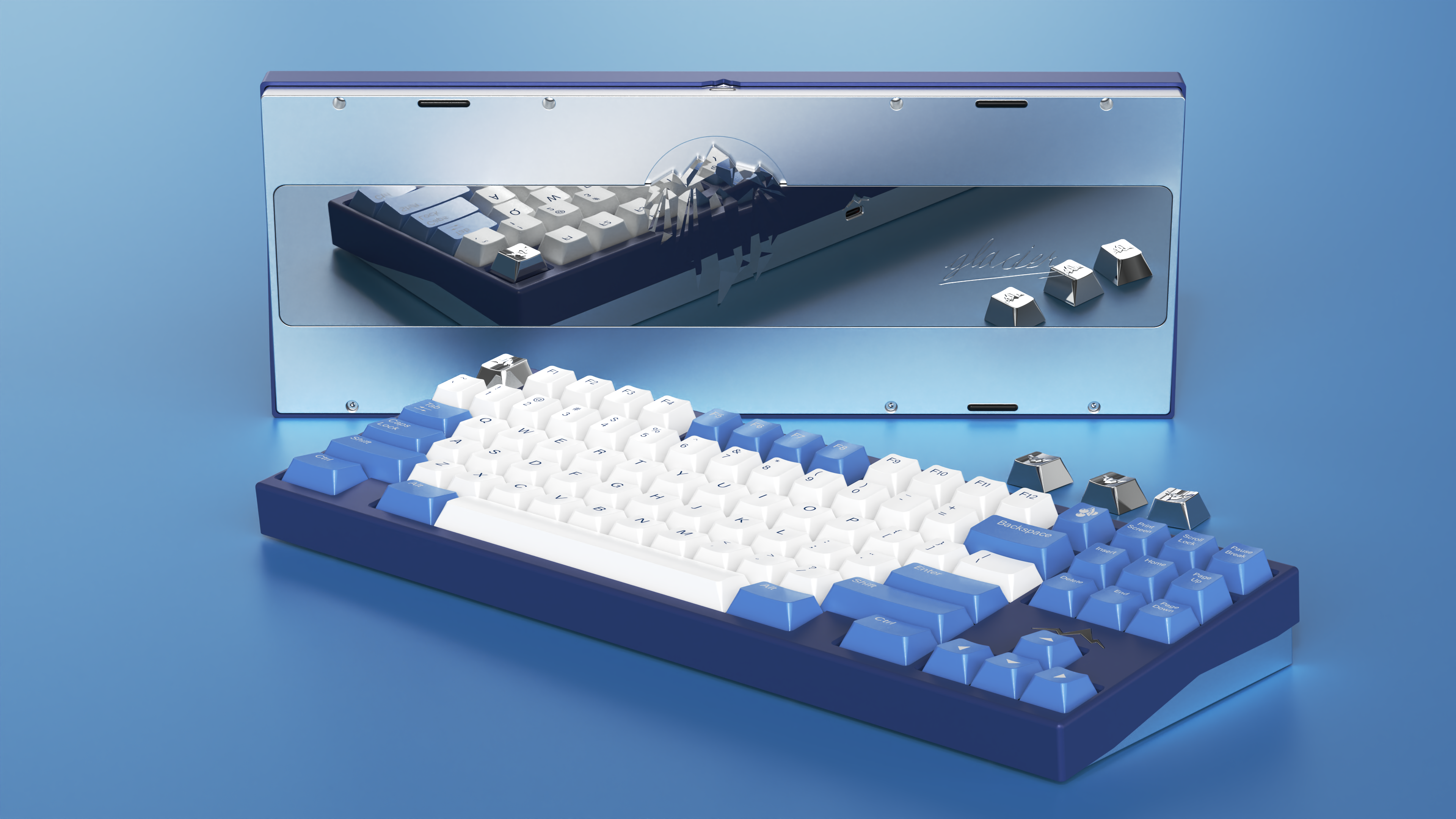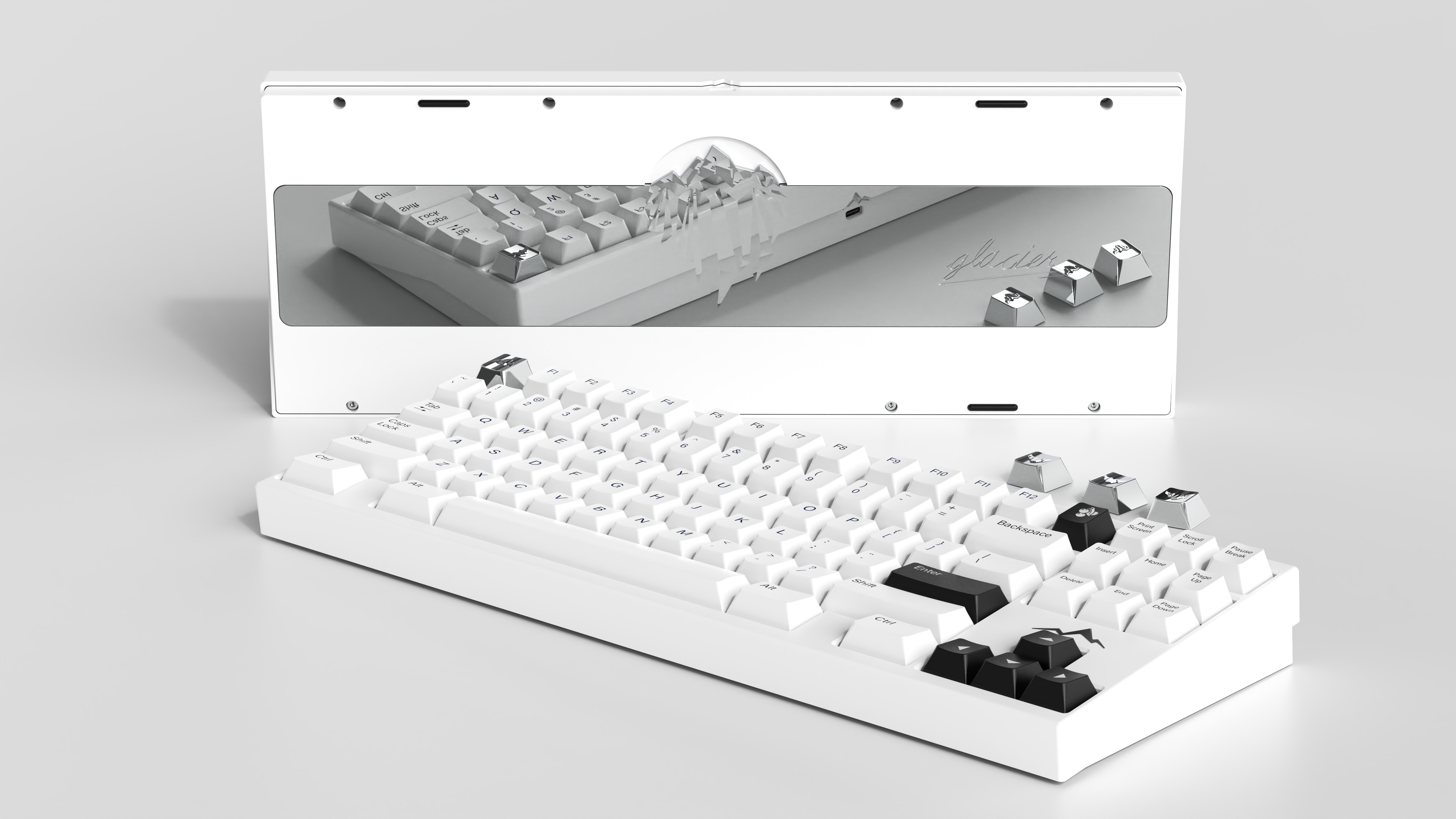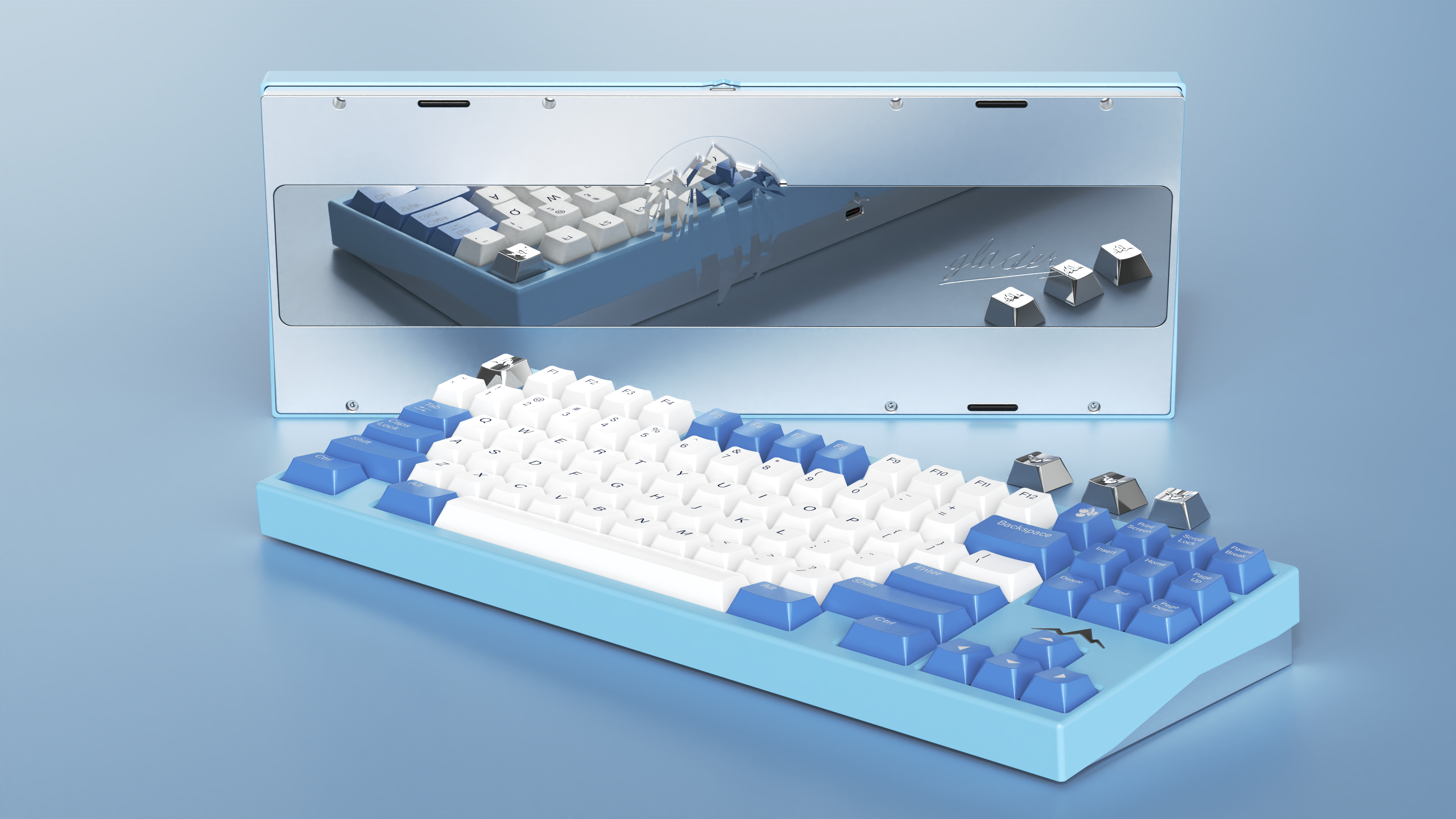 The keyboard is TKL with F13, also support WKL. The outline of glacier is set above the direction area, which emphasizes the theme of this work -- glacier. You can also choose an iceberg themed keycap, so that the front view of the keeb is more distinctive.