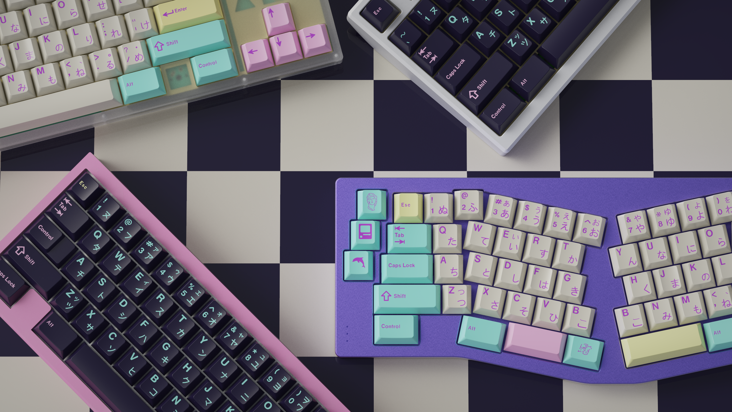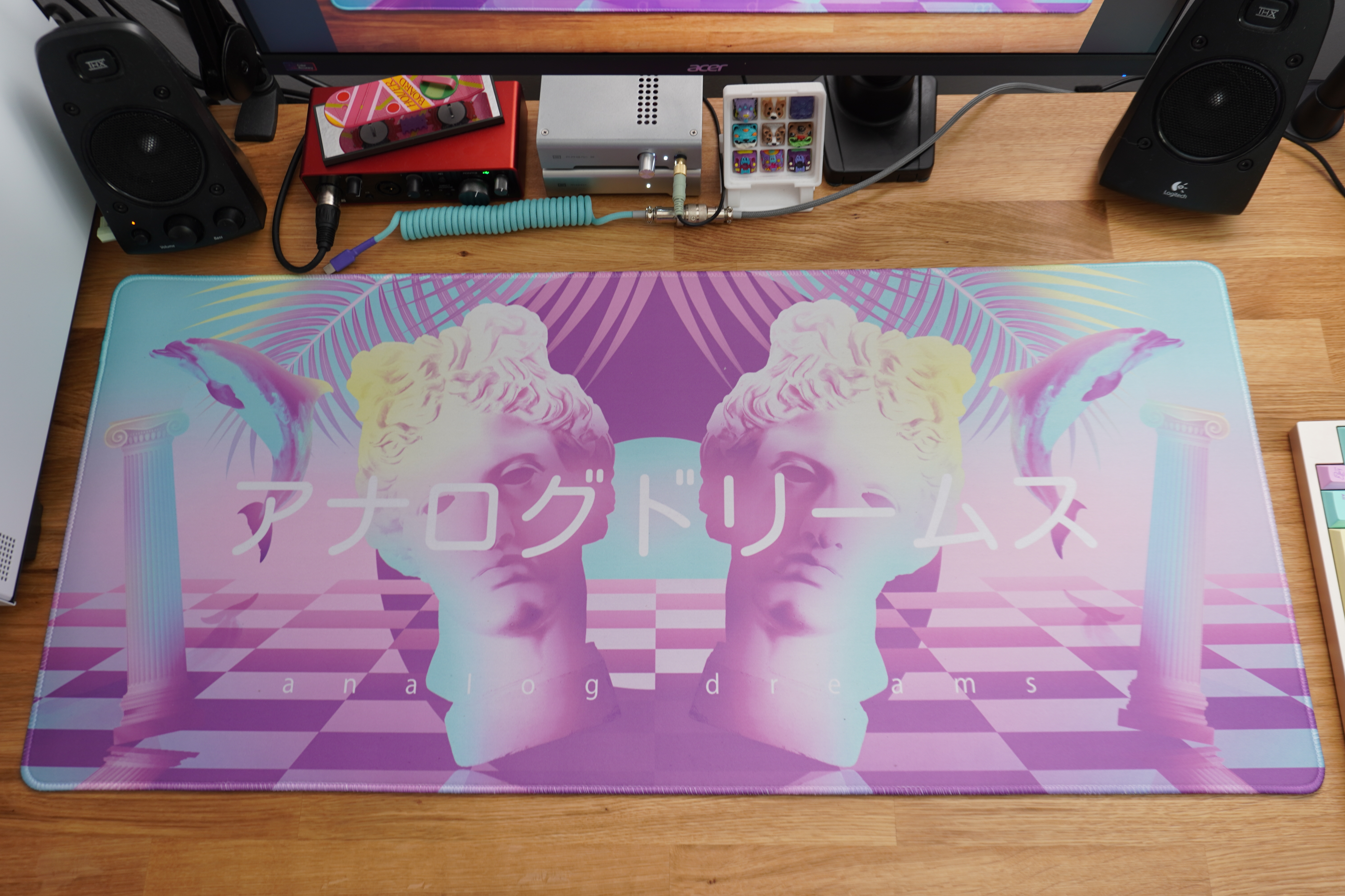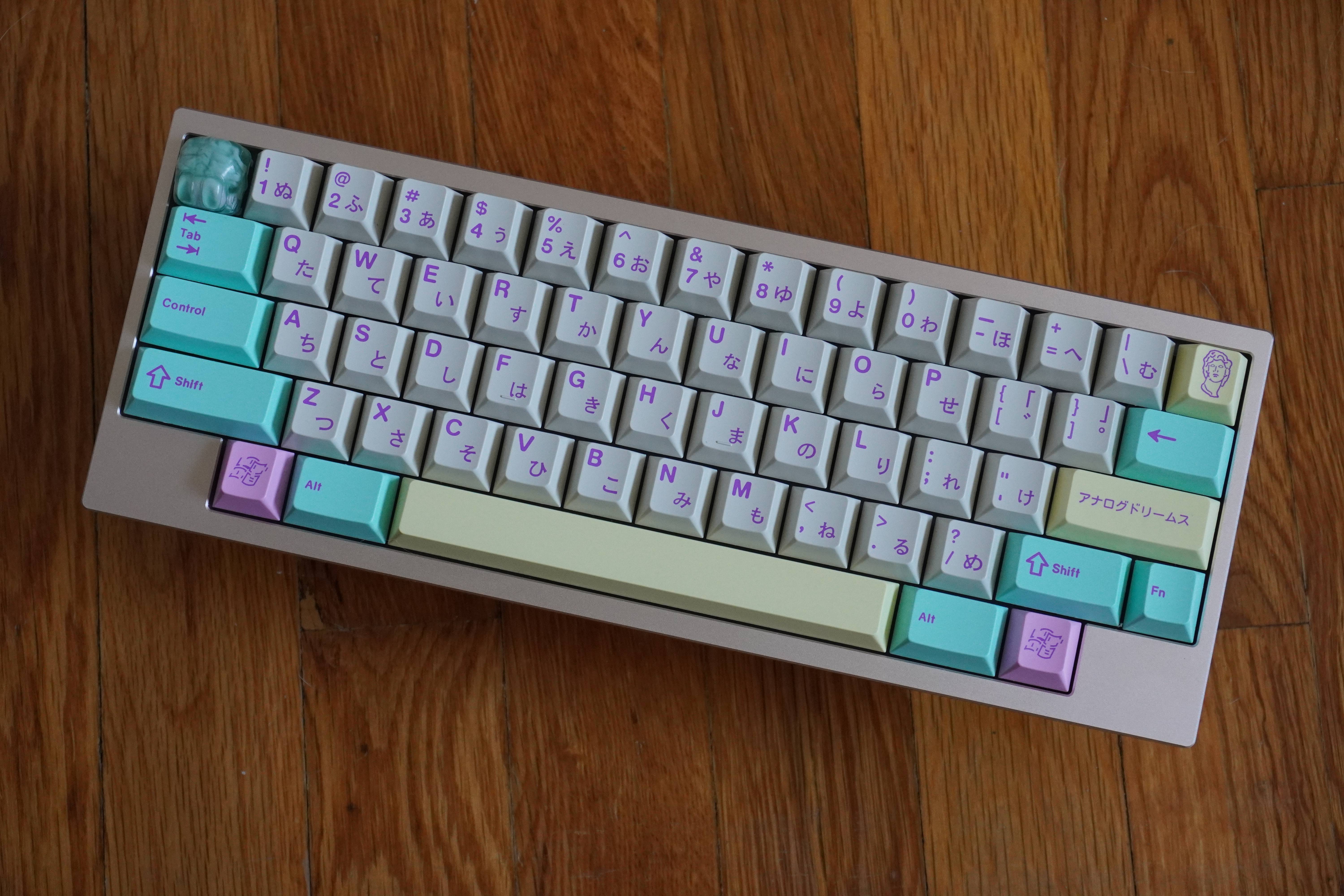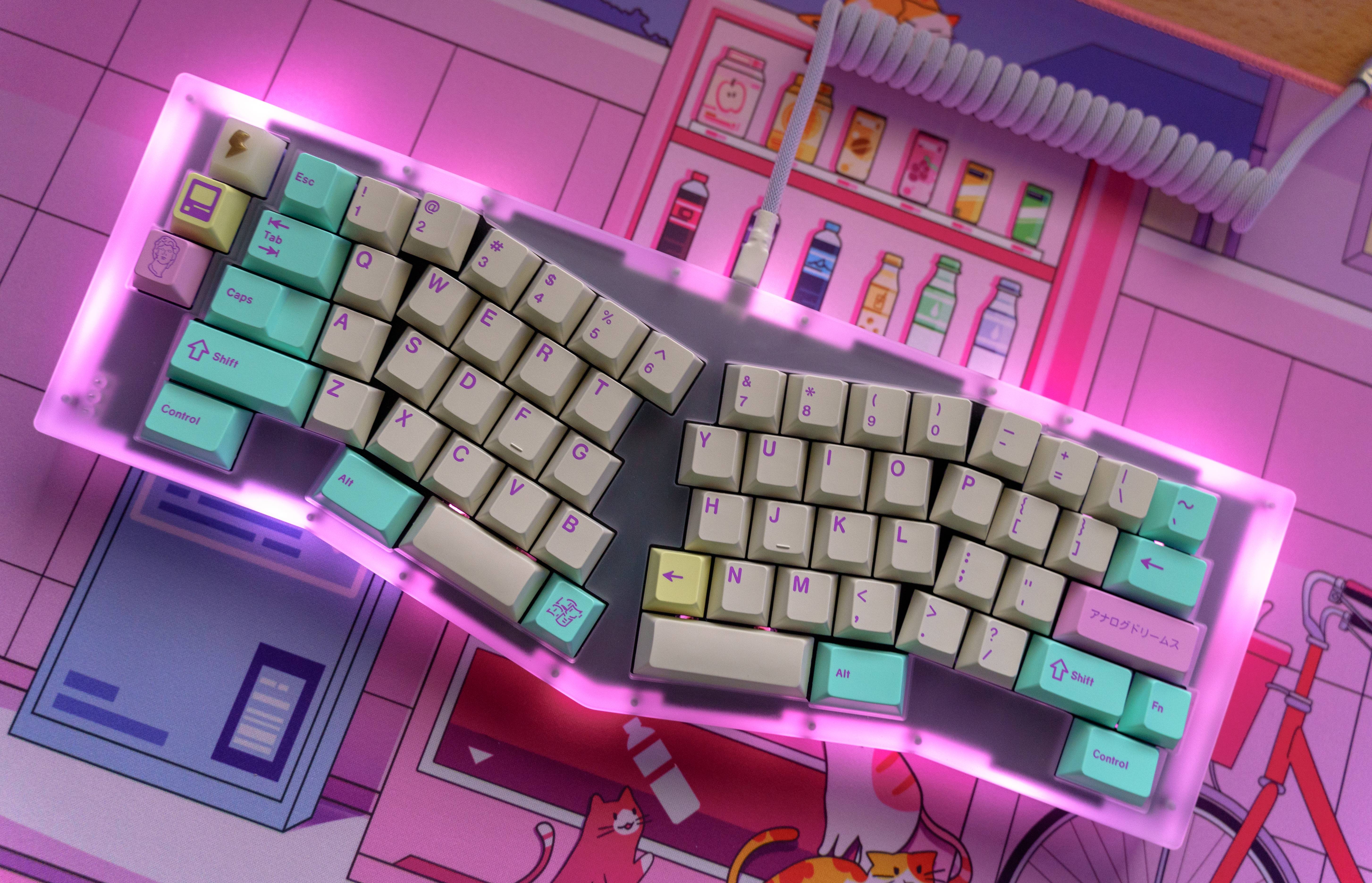 Not satisfied with other vaporwave themed keysets, I set out to create my own. Thus, GMK Analog Dreams was born. The beige base evokes the aesthetic of vintage computers. Add a splash of soft pastels, complimented by a pop of bright purple accent, and the result is a unique keyset that stands apart.
