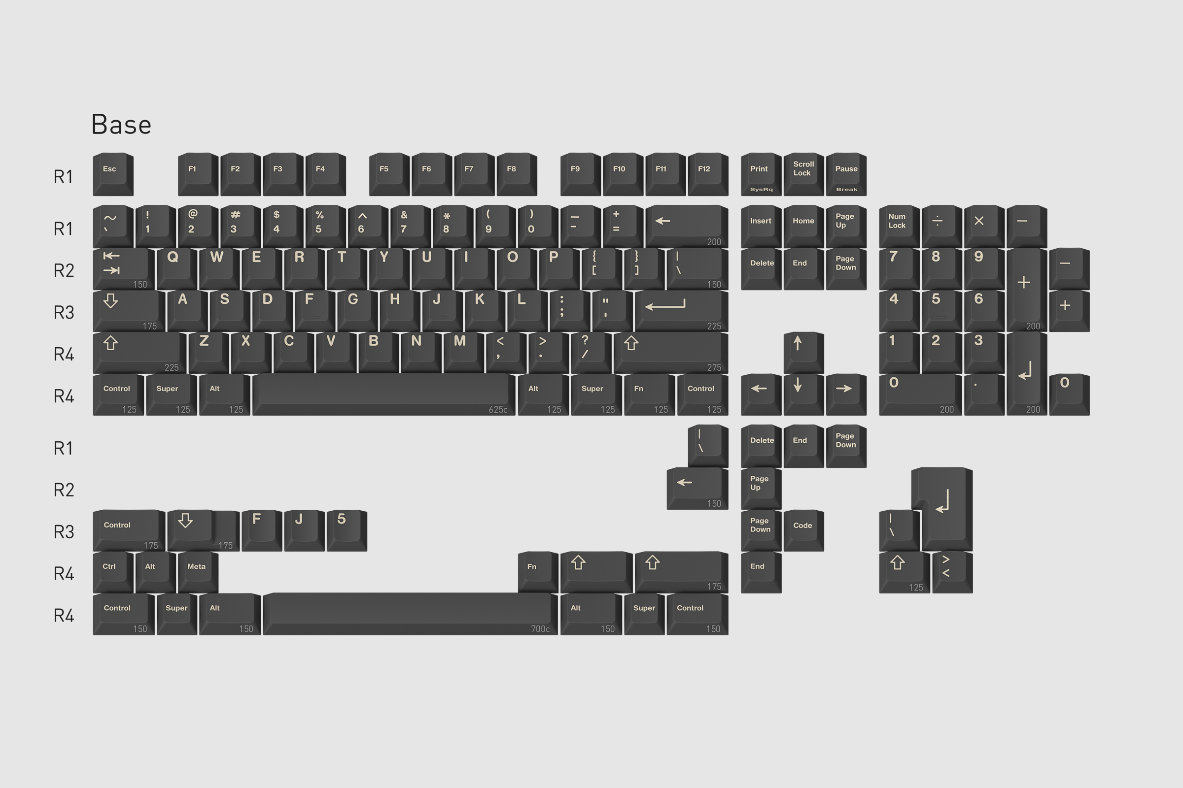 The base kit offers only the necessary key for 60%, 65%, TKL, WKL, 100% and 1800er layouts. I do expect the base kit to get very competitive pricing.