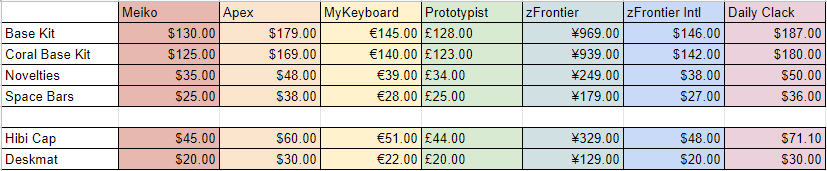 Vendors? Pricing?NA: MekiboCA: Apex KeyboardsEU: MyKeyboardUK: PrototypistAsia: