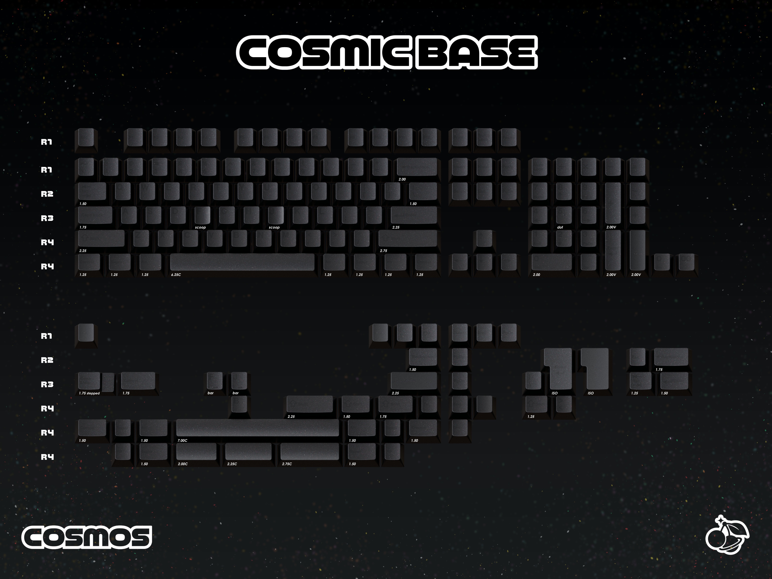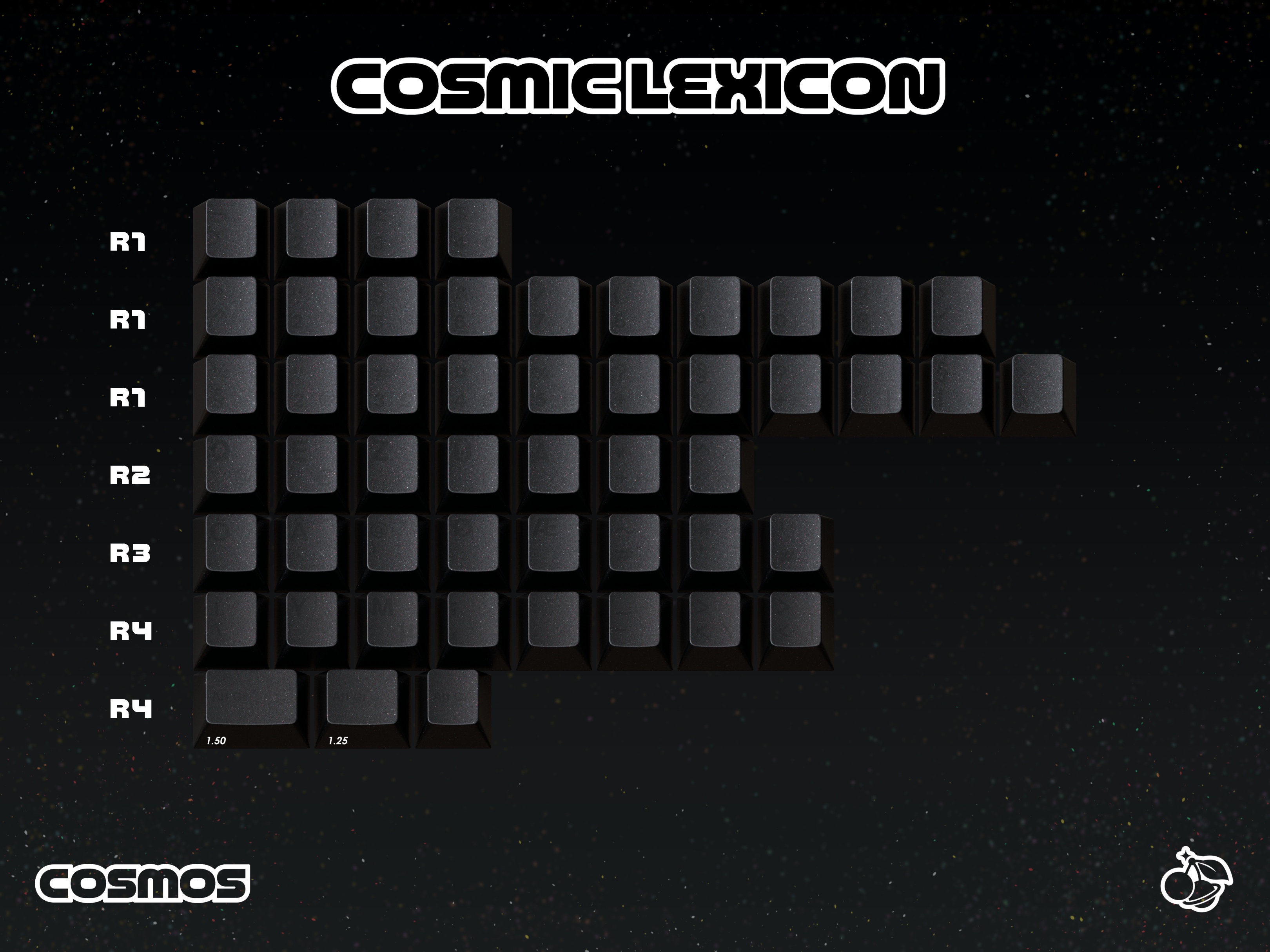 Hello and welcome to my debut set: GMK Cosmos. A black on black set using GMK’s custom, special-effects plastics. Cosmos is black with iridescent dust.