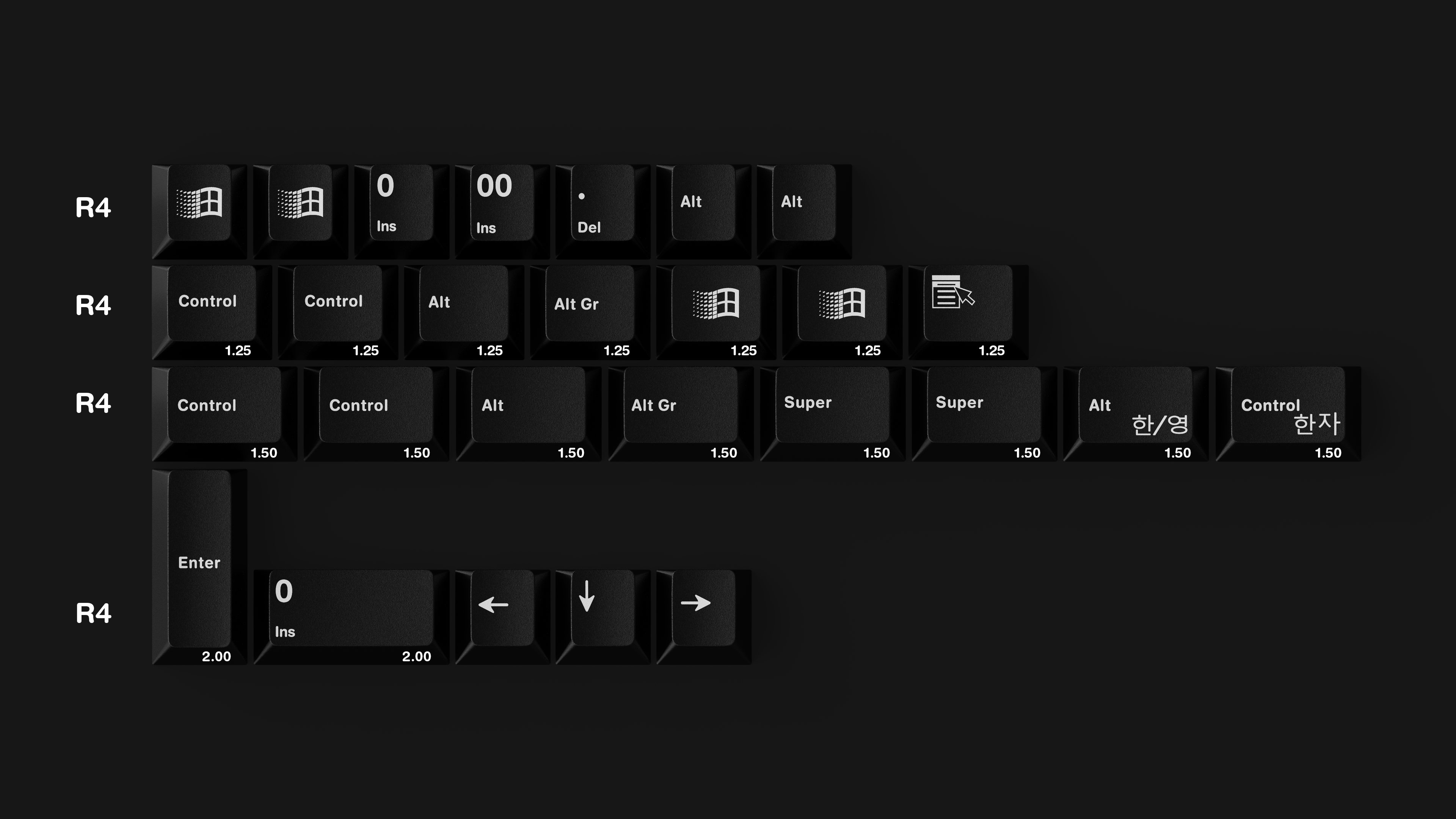 My goal with these kits is to extend the usefulness of GMK sets like Hineybeige and Dolch R5 for keyboard layouts where you might prefer a less aggressive bottom row profile, particularly those with winkeys.