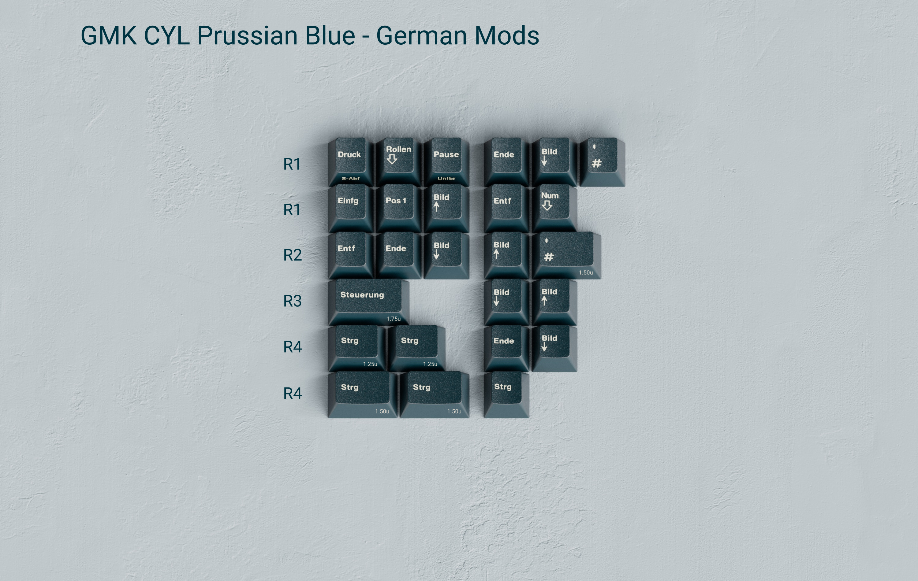 These MX-compatible keycaps will be made from ABS plastic and doubleshot legends (with UV front-print where needed). GMK Prussian Blue uses a simple color scheme with a GMK stock white (CP) for its legends and a custom color for the base: RAL 230 20 20 (