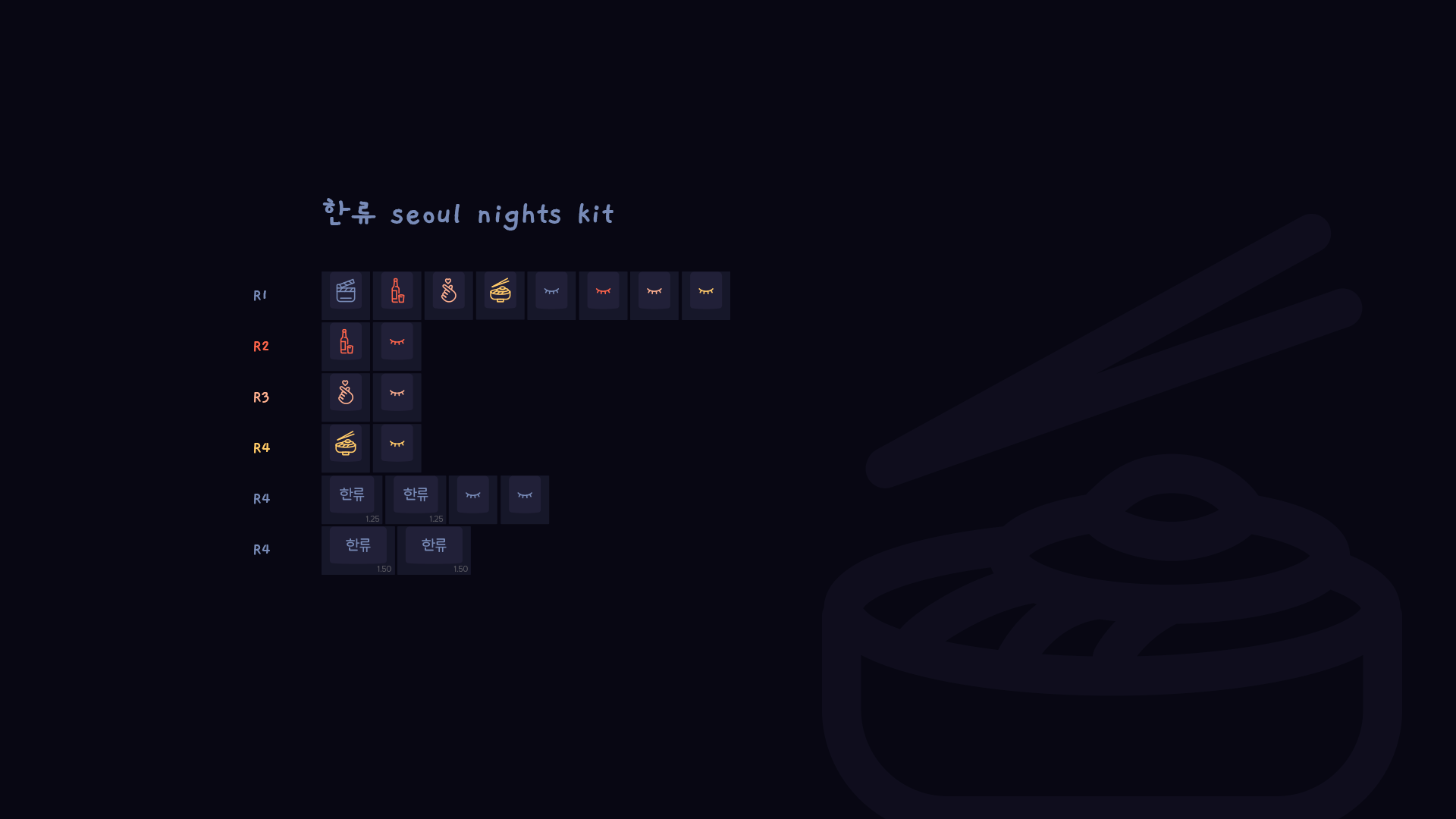 _ different icons : each one represents one aspect of Korea and its pop culture : korean cinema and k-drama (clapperboard icon) / food (bimbap bowl icon) / k-pop music (finger heart icon) / korean alcoholic drink (bottle of soju icon) / korean beauty, skincare and makeup (eyelash icon).