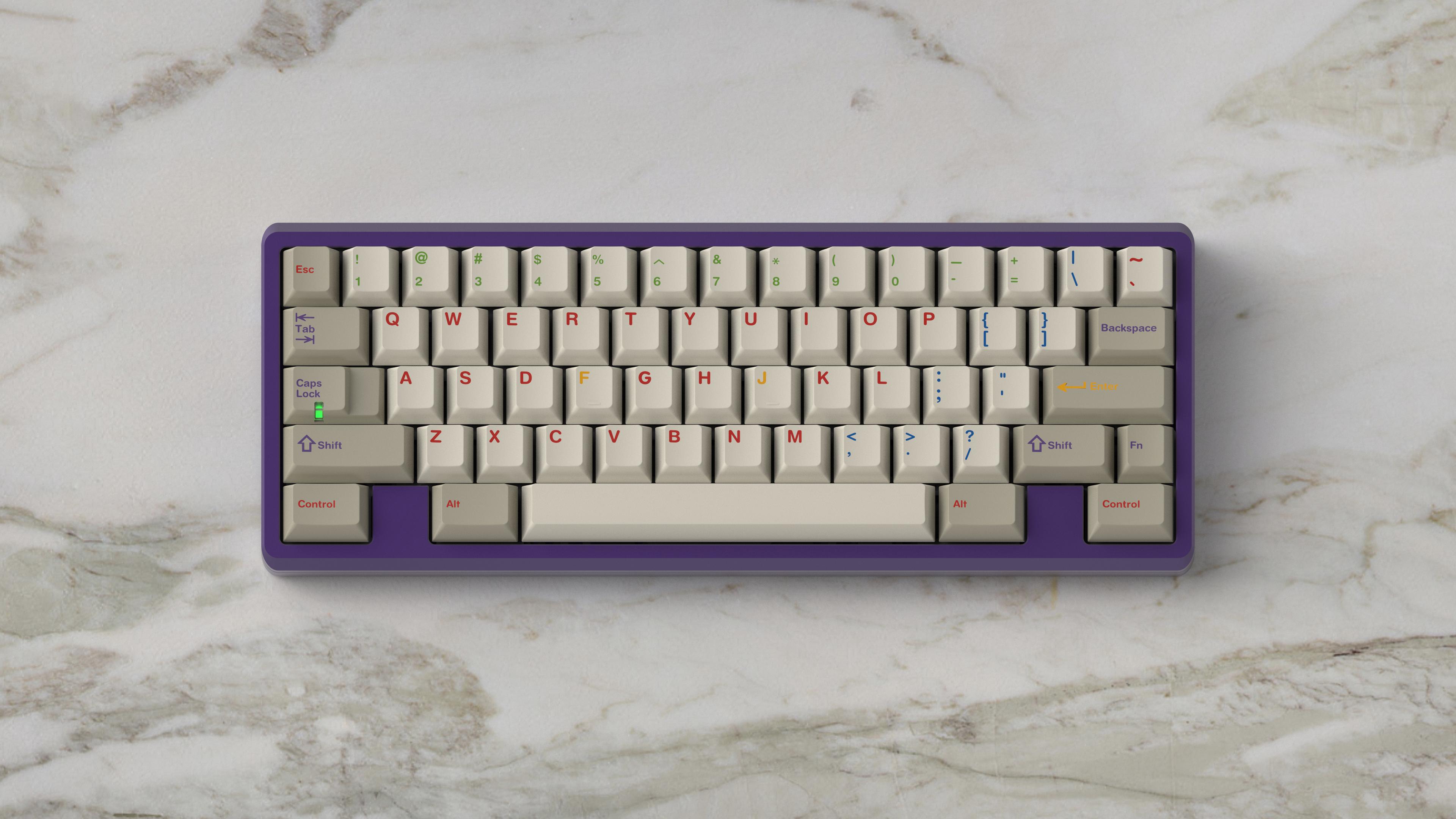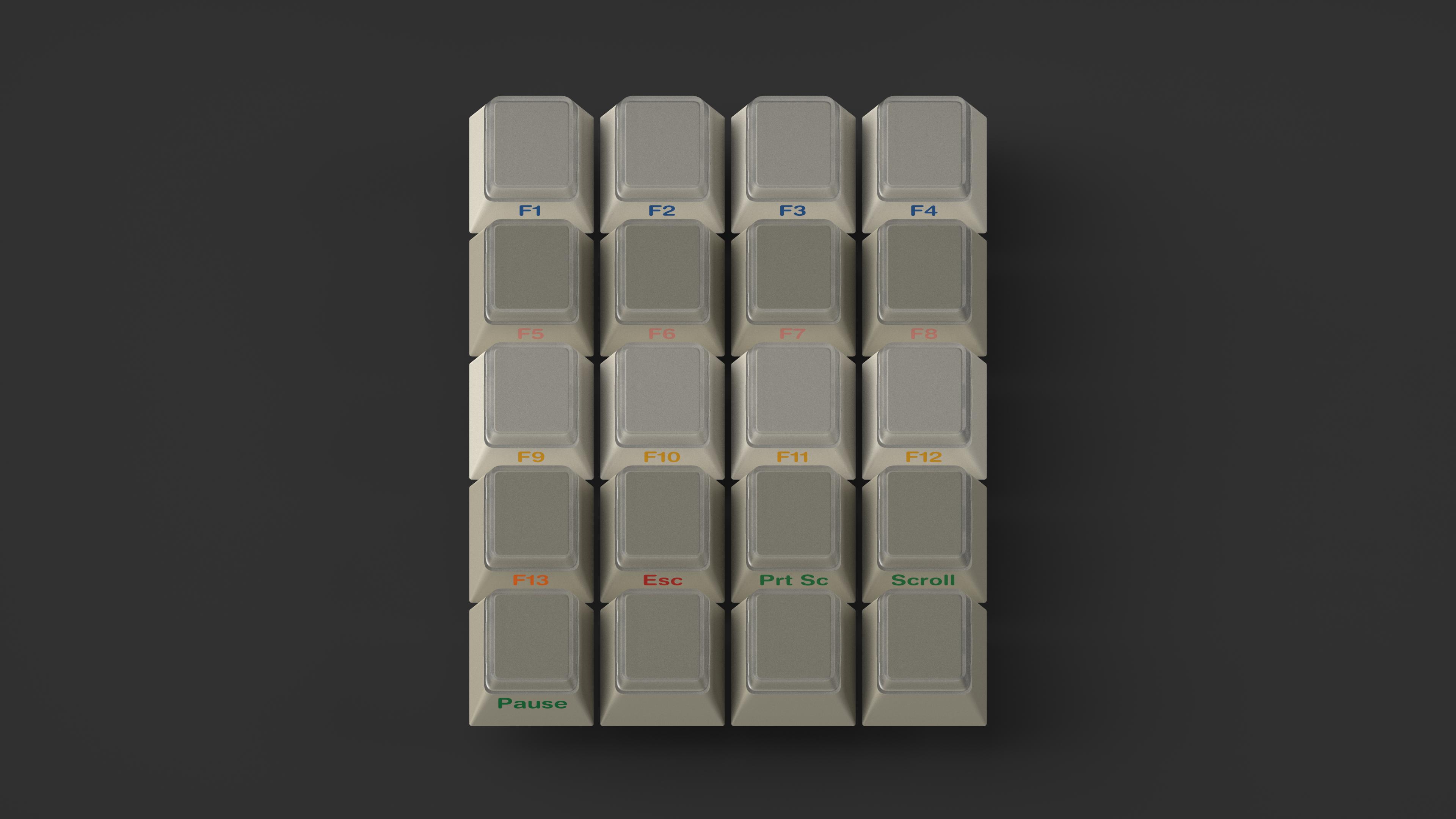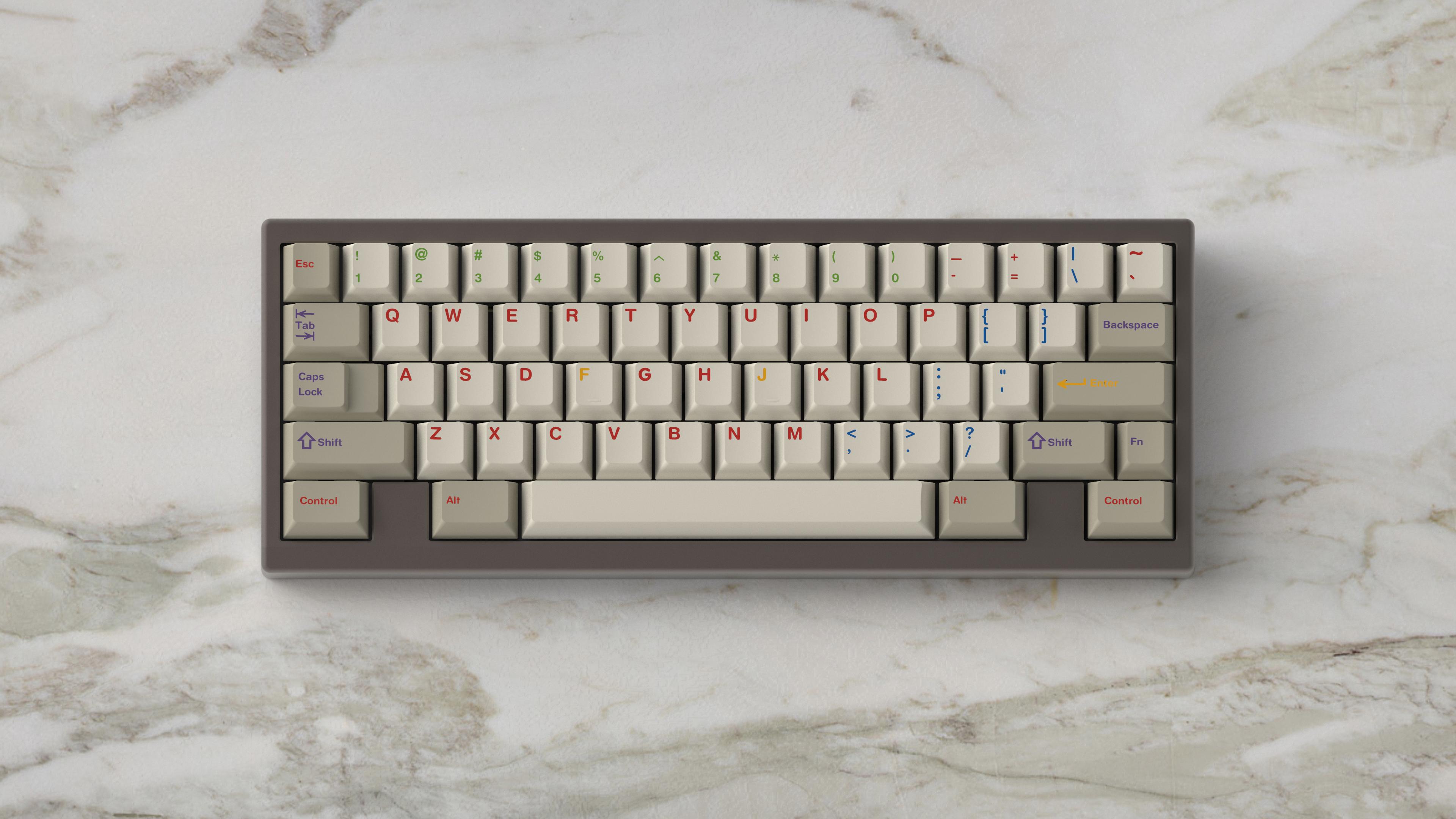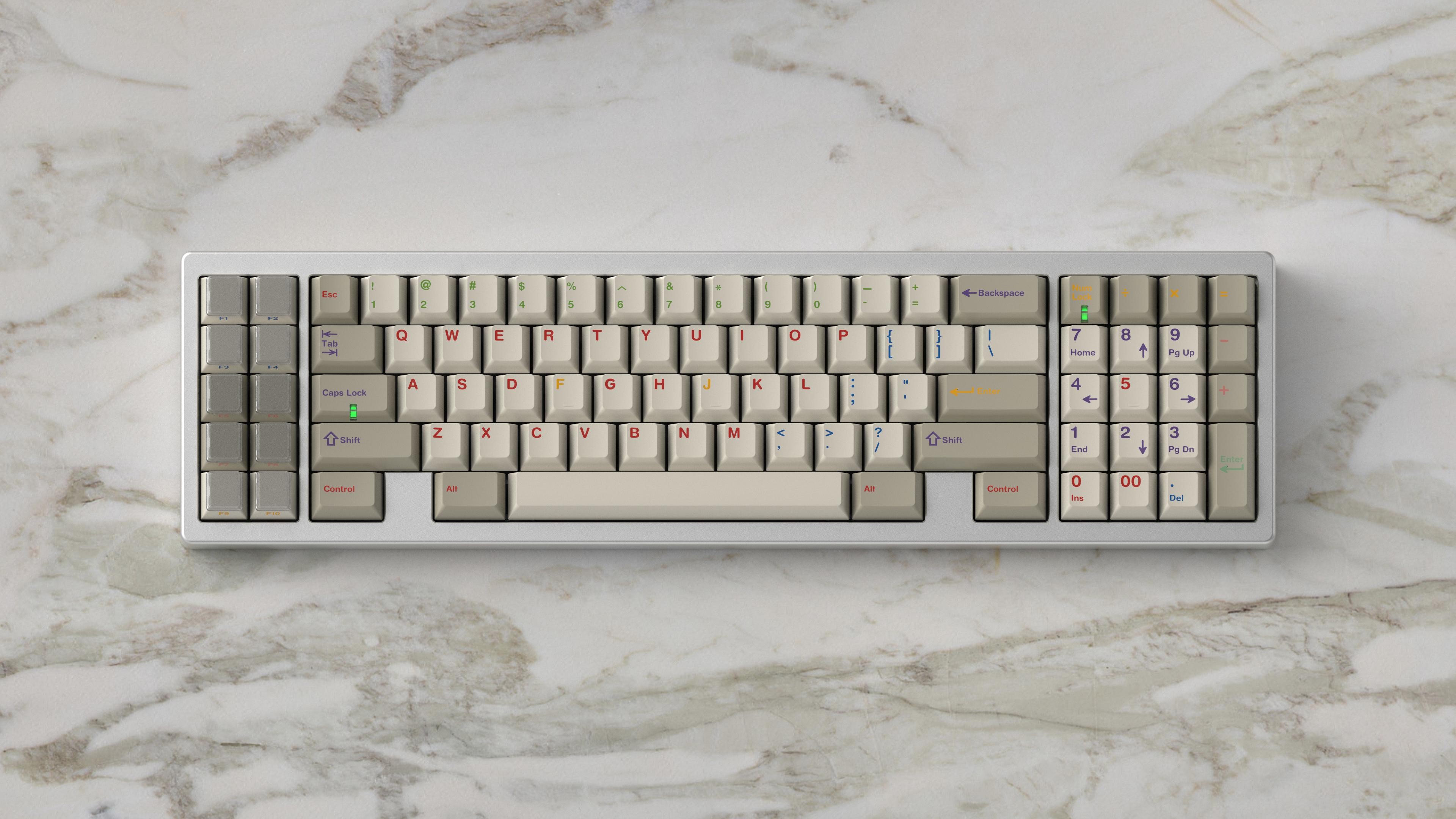 GMK Handarbeige features all stock GMK colours, which will be listed below. It is a combination of the U9+L9 beige background, with the GMK Handarbeit+ array as legends. It also includes V4 front print.