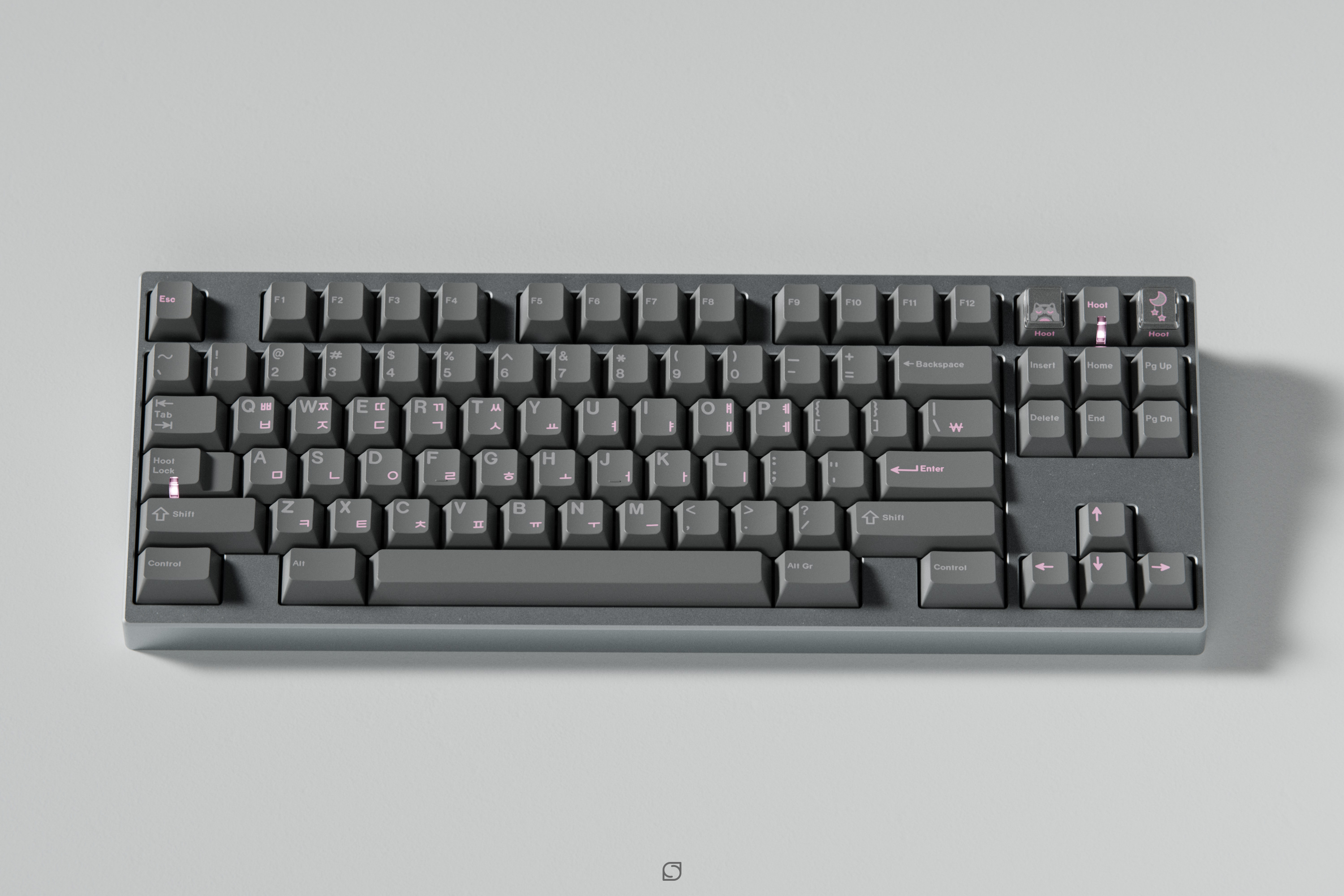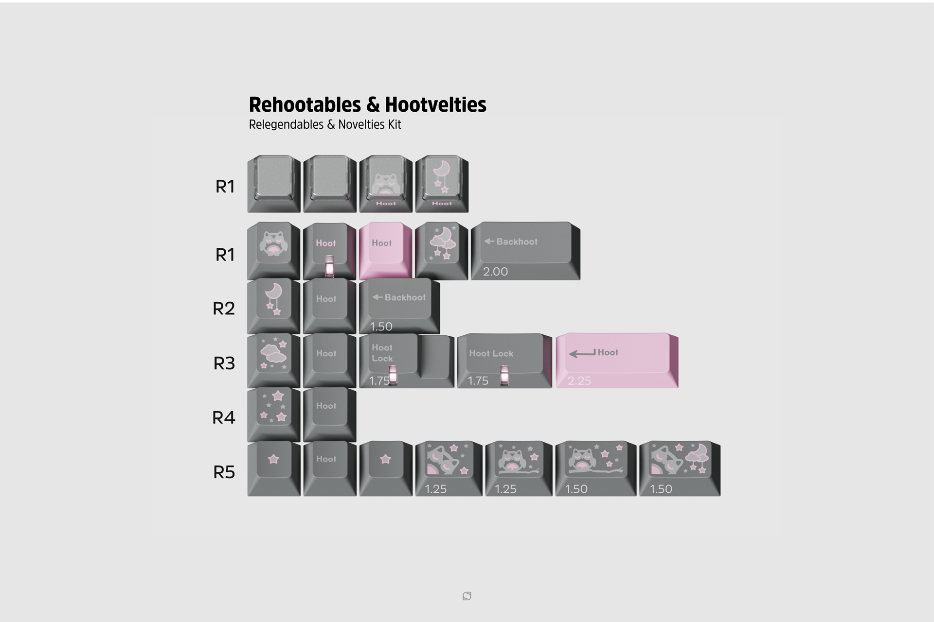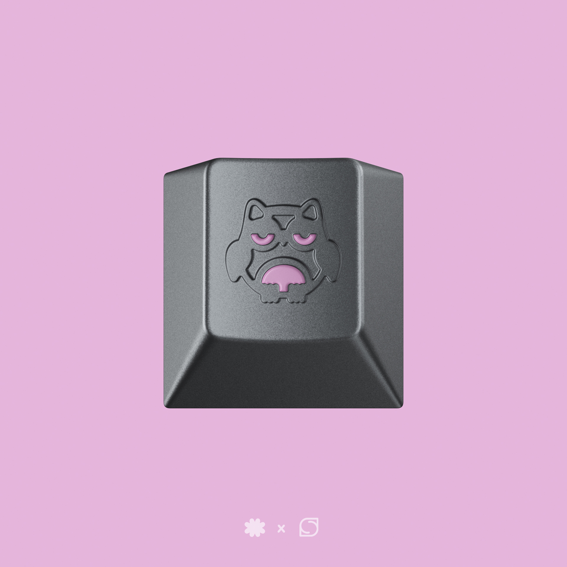 SwagKeysHooty is quite the grumpy little owlet, usually disgruntled, tired, generally unimpressed, and always waking up on the wrong side of the bed.Hooty will feature low contrast and saturation doubleshot greys throughout the set and novelties, with soft, bright pink UV throughout the base and novelties. Same pink will be used as the doubleshot accent legend, and the keycaps in the accent kit. Grey keycaps and legend in the accent kit is GMK 2B. Pink and light grey are custom.