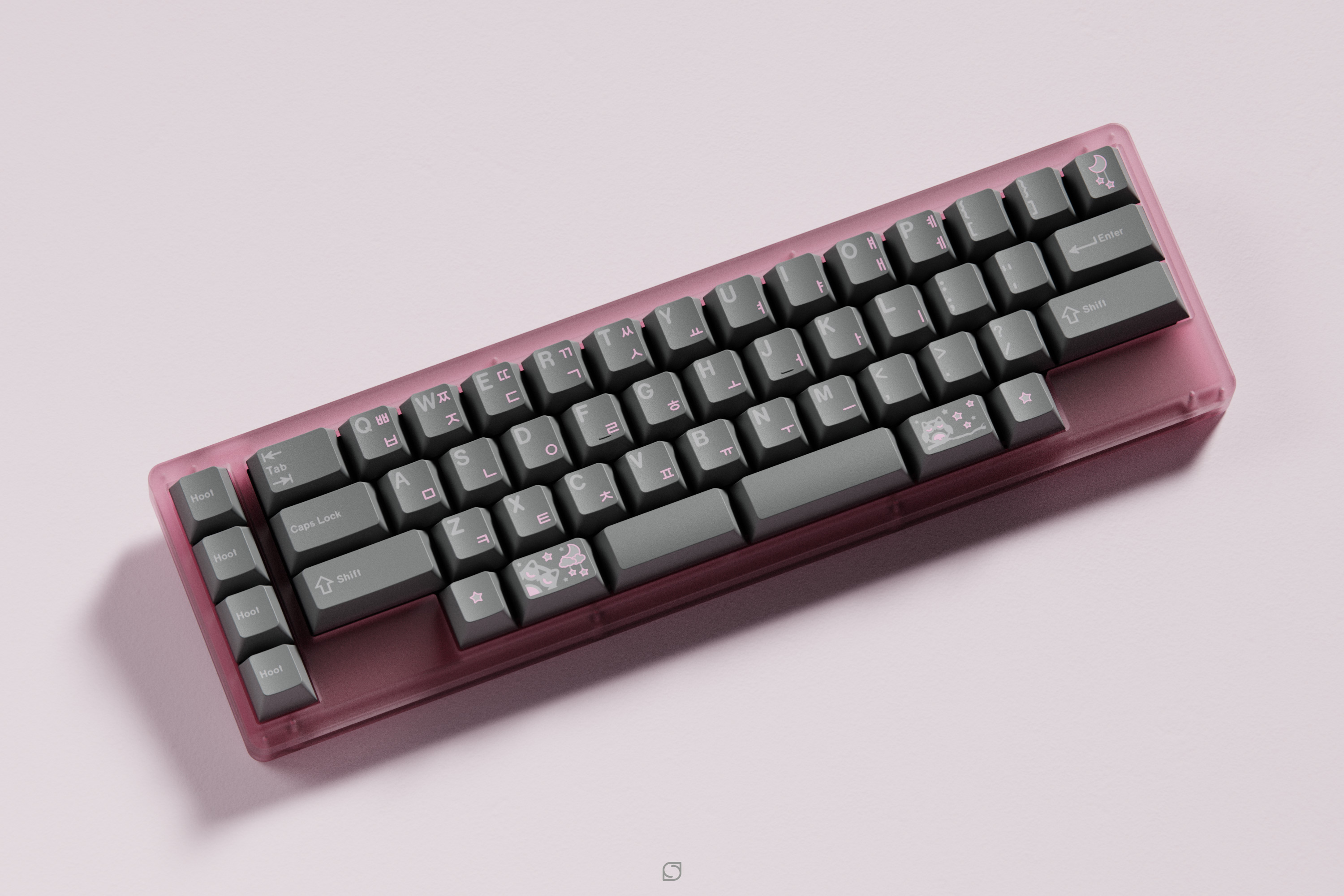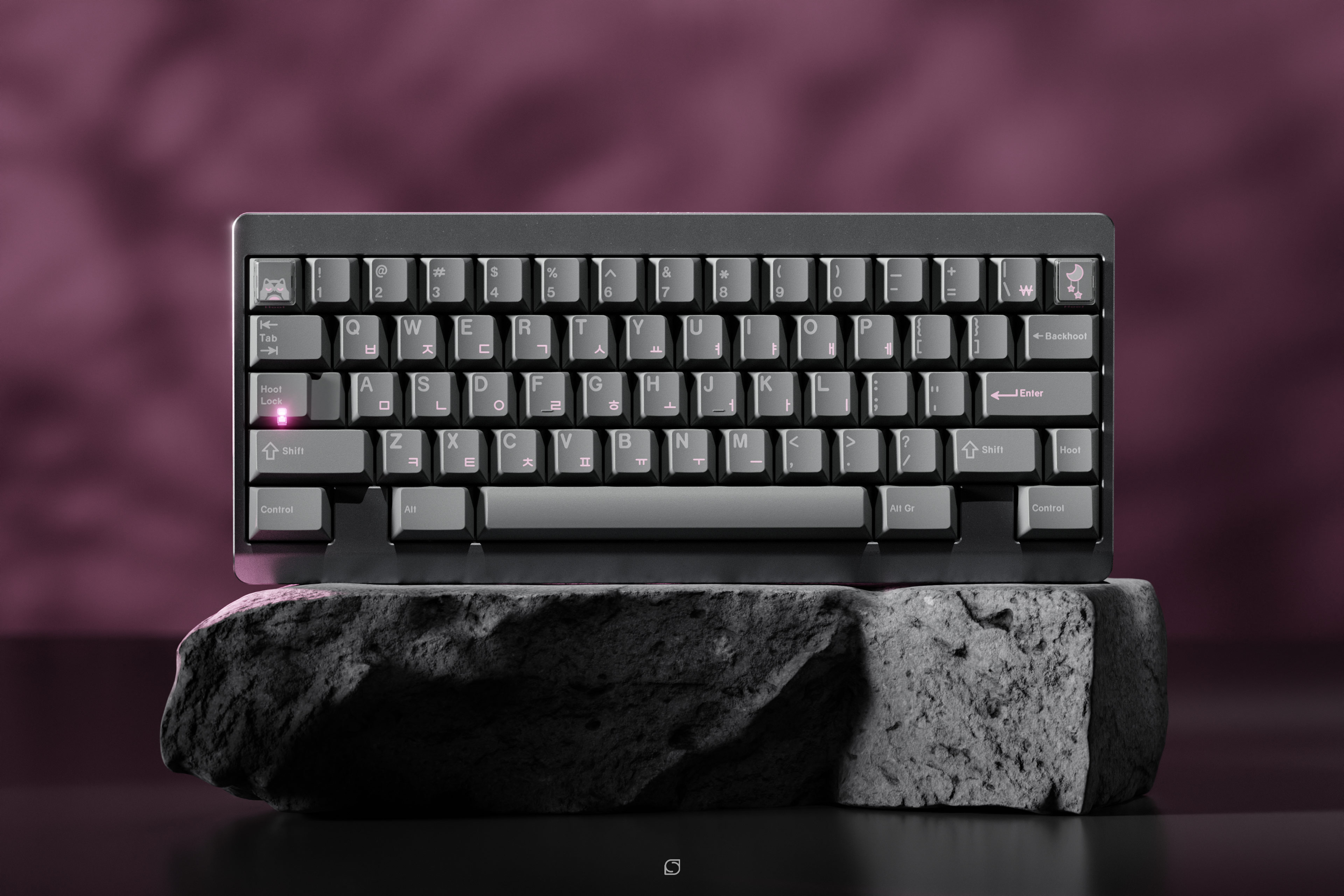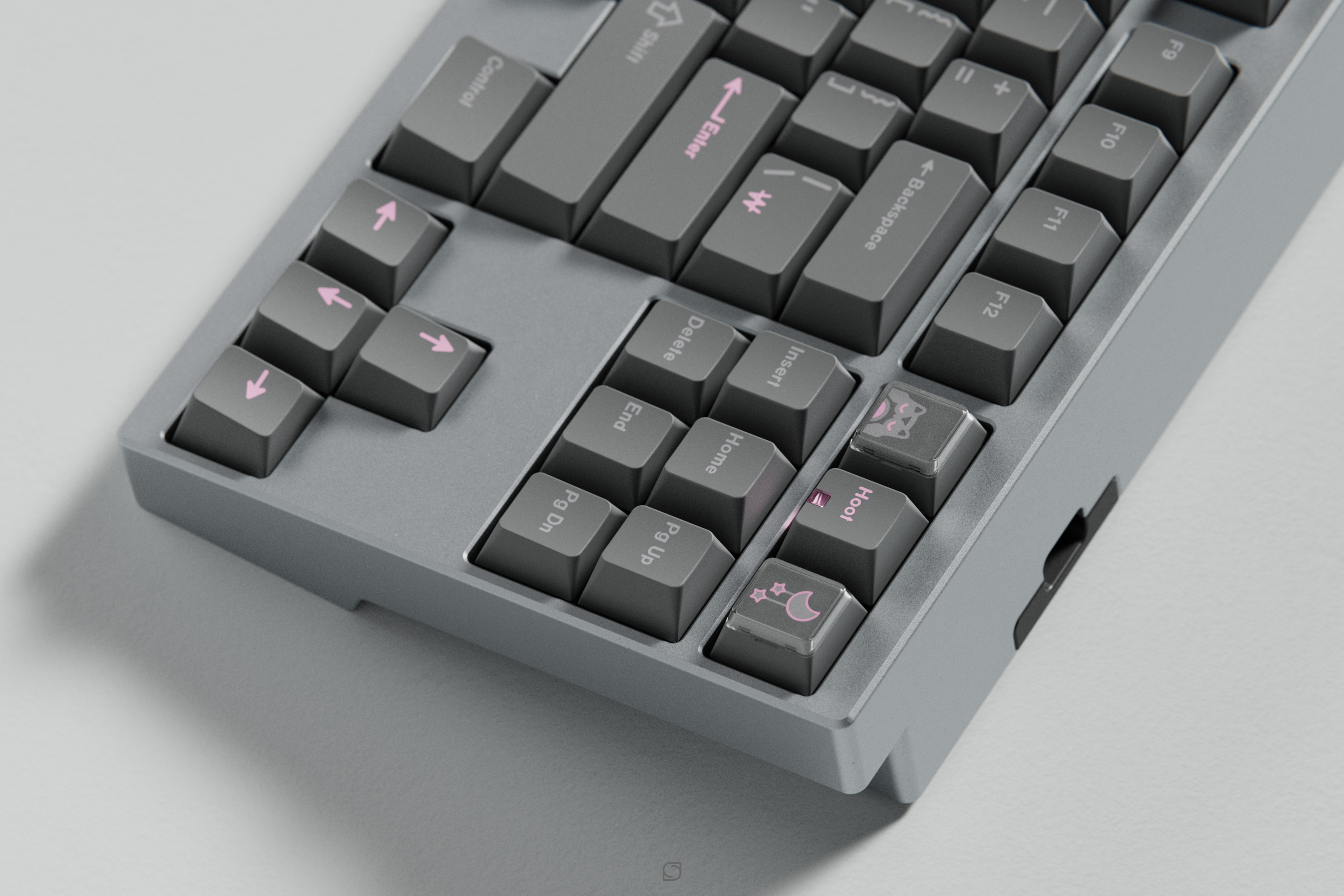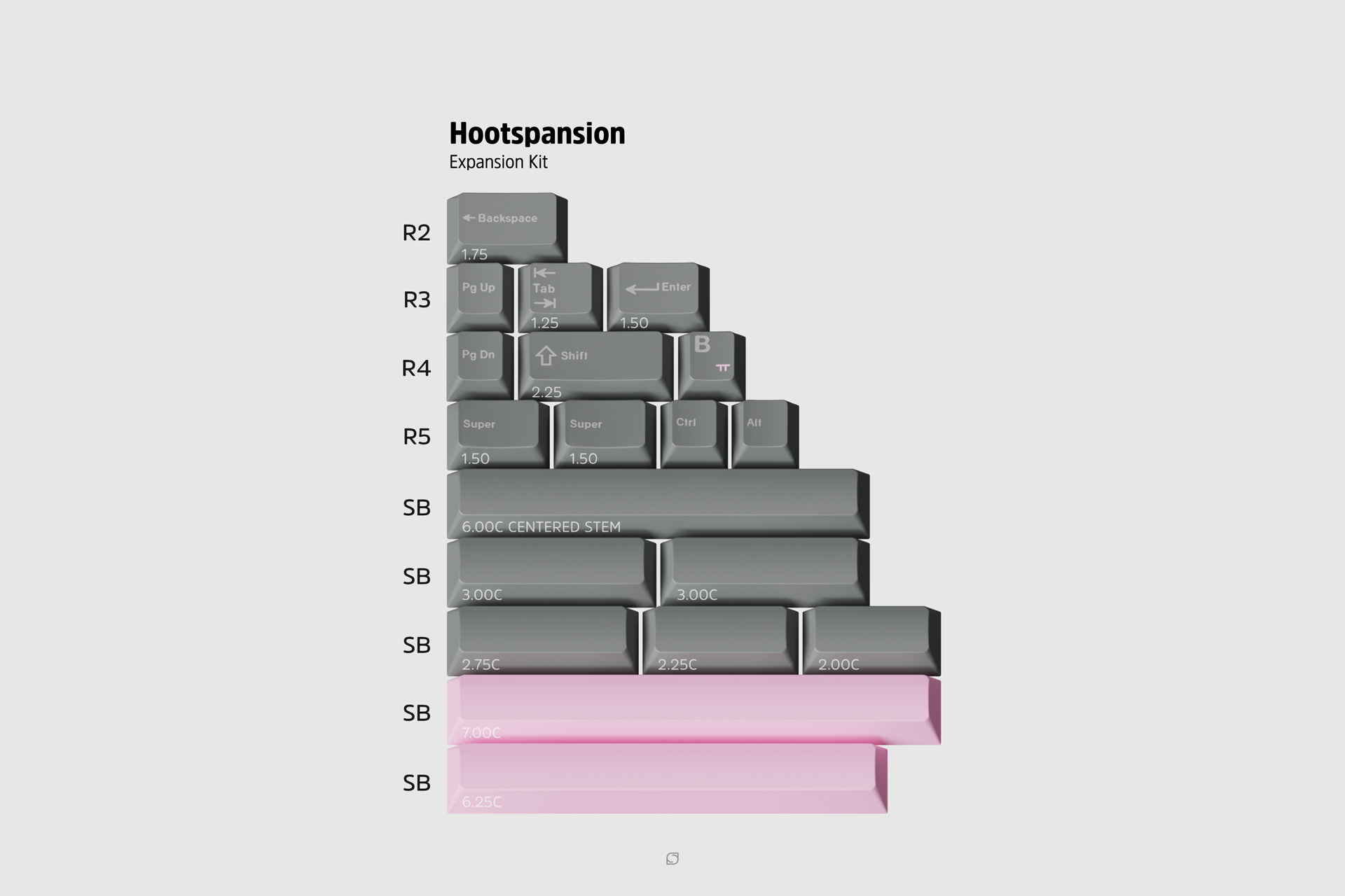 SwagKeysHooty is quite the grumpy little owlet, usually disgruntled, tired, generally unimpressed, and always waking up on the wrong side of the bed.Hooty will feature low contrast and saturation doubleshot greys throughout the set and novelties, with soft, bright pink UV throughout the base and novelties. Same pink will be used as the doubleshot accent legend, and the keycaps in the accent kit. Grey keycaps and legend in the accent kit is GMK 2B. Pink and light grey are custom.