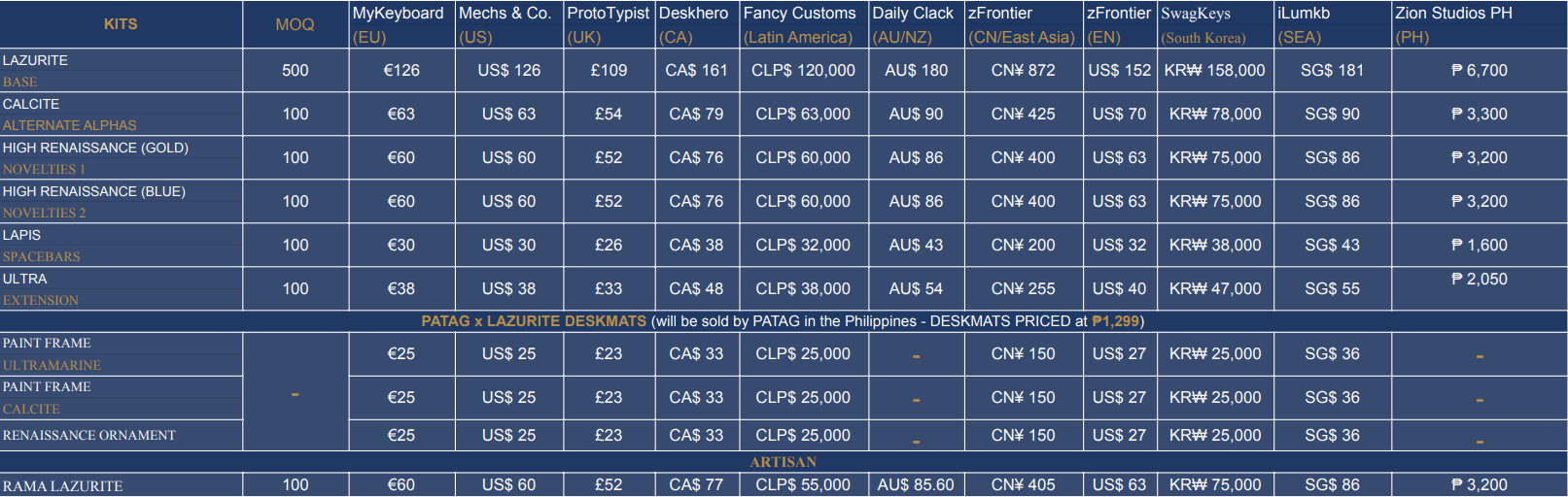 Where to place your group buy orders?GMK Lazurite Kits and Accessories EU : MyKeyboard US : Mechs & Co. UK : Proto[Typist] Keyboards CA : Desk[H]ero Oceania (AU/NZ) : Daily Clack CN/East Asia : zFrontier (EN) CN : zFrontier (CN) South Korea : SwagKeys SEA : iLumkb Latin America : Fancy Customs Philippines : Zion Studios PHSeparate PATAG x Lazurite Deskmat Links*Some vendors have the same product page links with GMK Lazurite kits