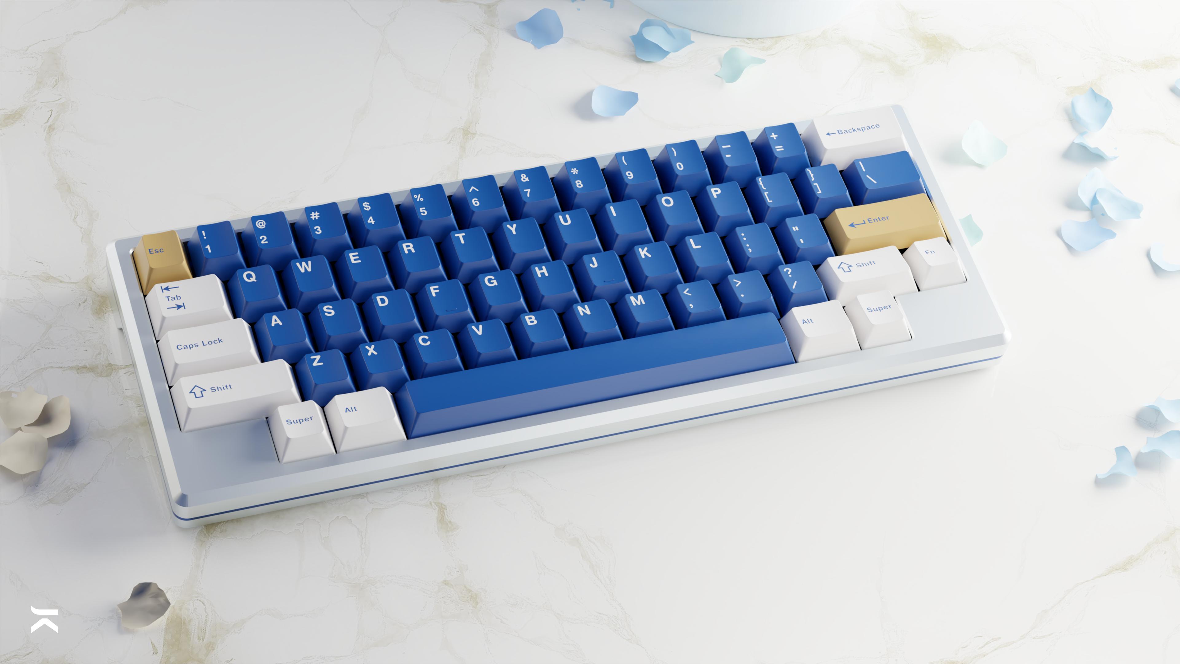 KBDfans x Lazurite D60Litea keyboard collaboration of GMK Lazurite with KBDfans60% keyboard, color-matched with GMK Lazurite's colors, sold as a Group Buy.