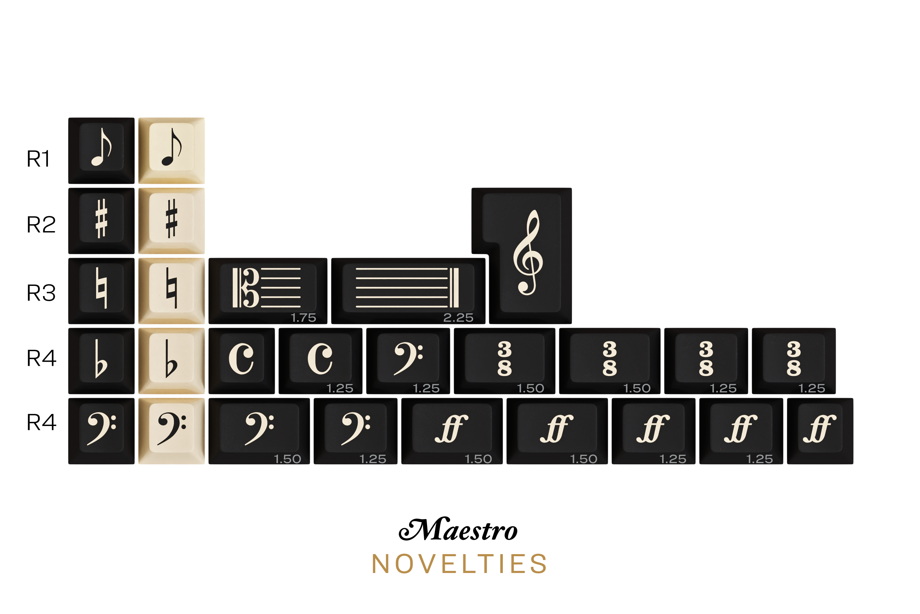 NoveltiesUS$60 / £53GBP / ¥400.00 / KRW73,000 / AU$86 / €58Minimalist musical pictograms that are universally used on music sheets. Featuring music symbols for macro keys (R1-R4) and modifiers novelties.