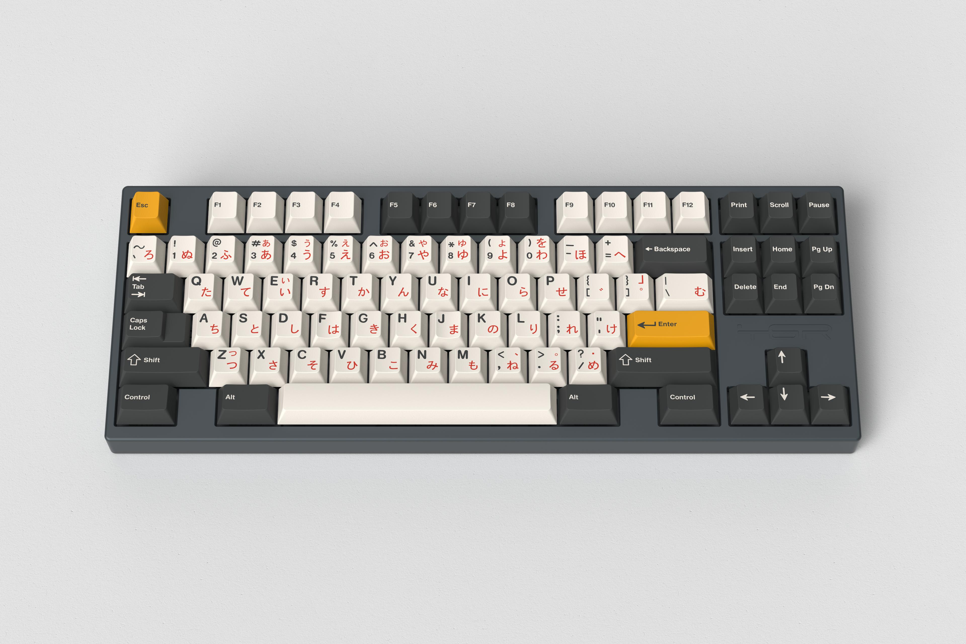 GMK Matsu was inspired by the art and colors on Hanafuda cards, most particularly the suit for the month of January, which depicts a crane amongst pine trees.