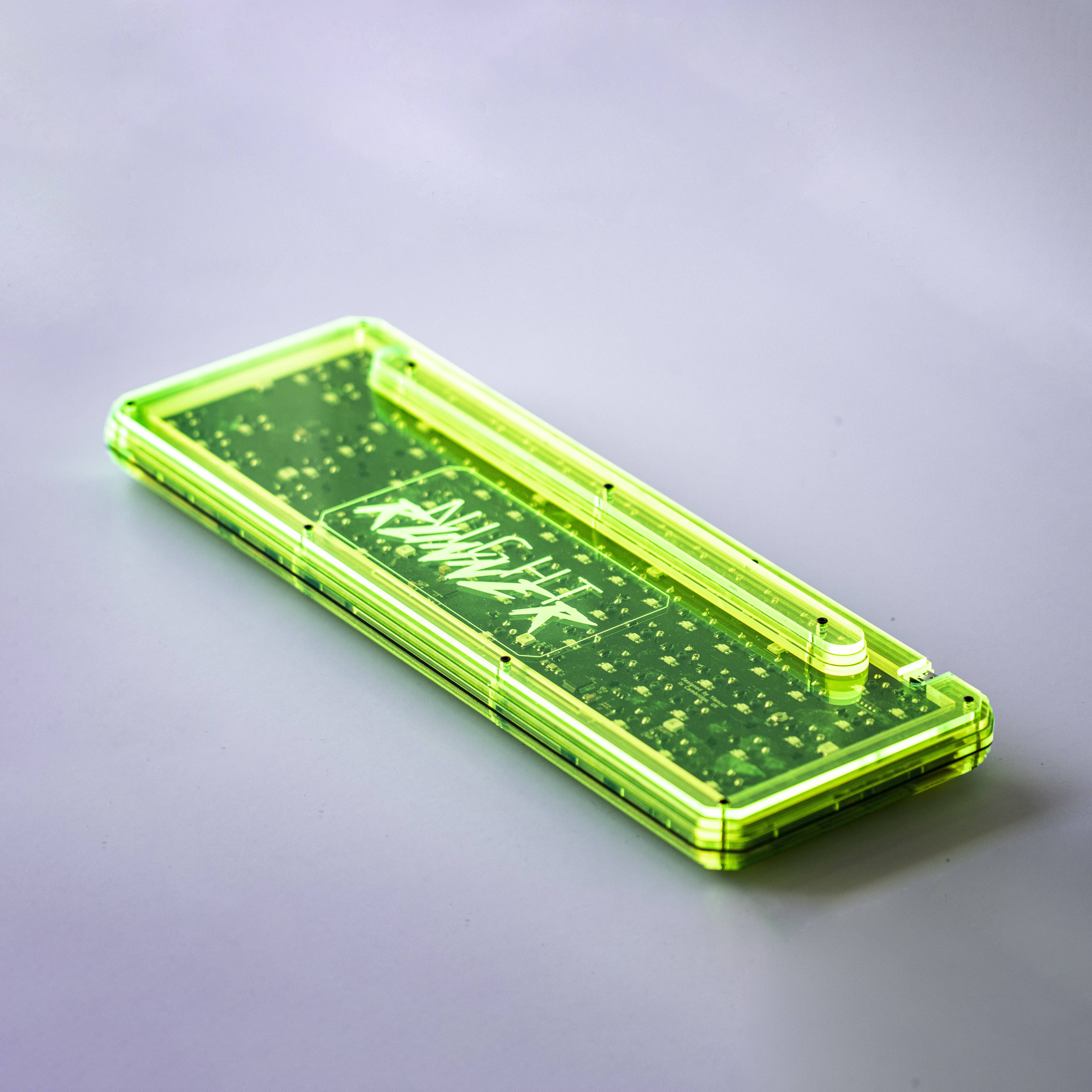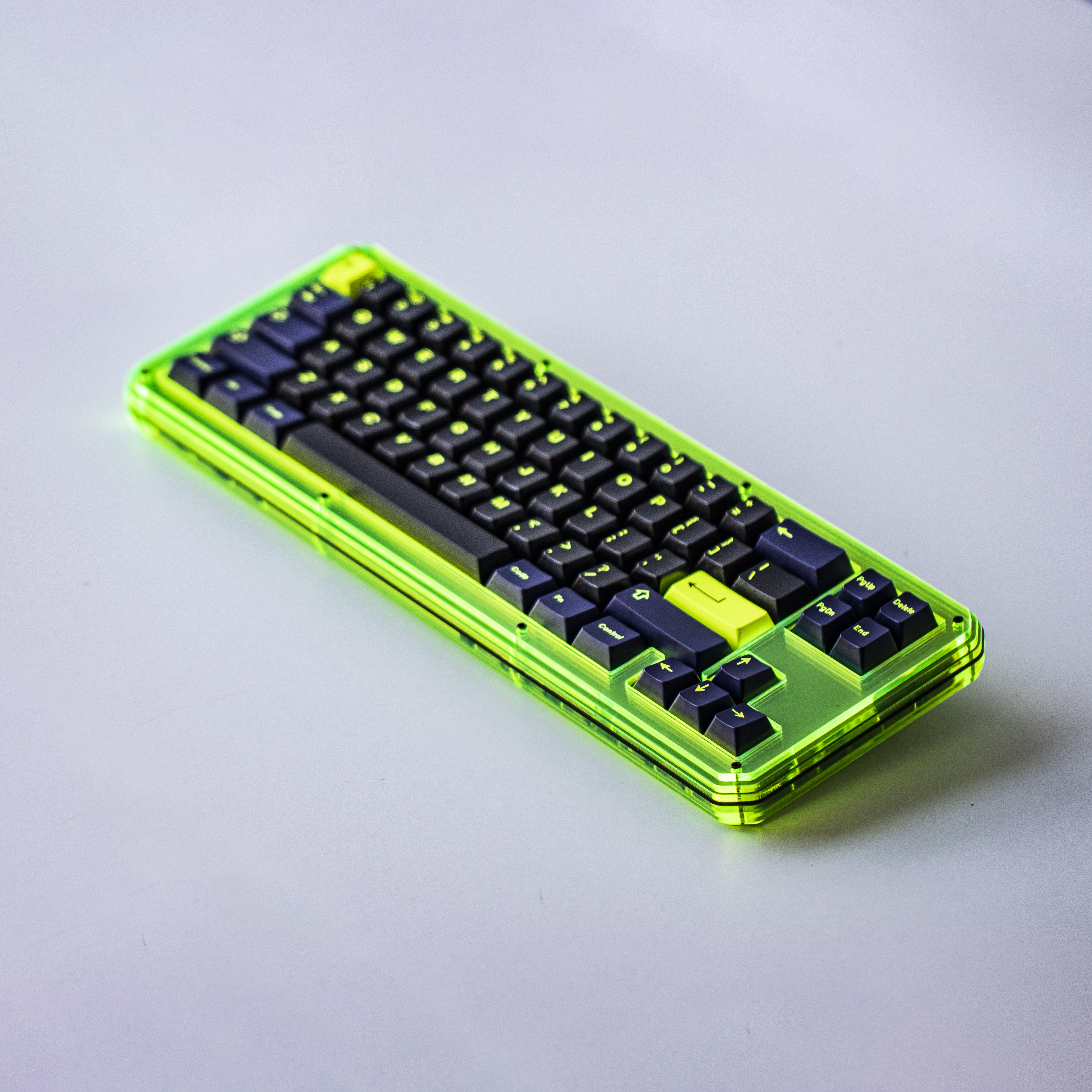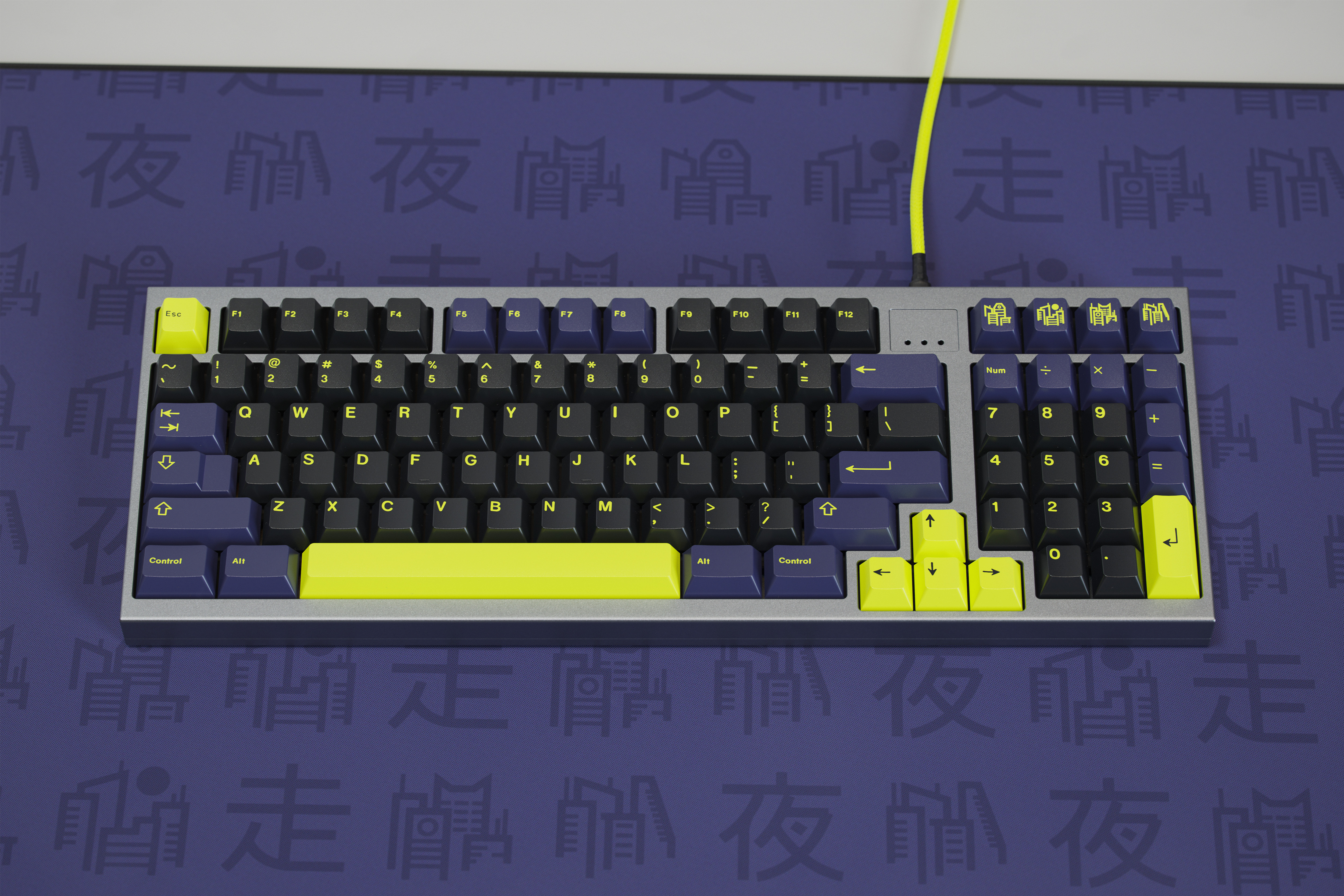 Inspired by those elite few who navigate the rooftops of a dystopian cyberpunk city, GMK Night Runner aims to bring a little of the not-so-distant future to your set up. The inky dark alpha base color represents the night sky, while the soft, dark blue used for the modifiers represents moon lit features, and the bright yellow legends represents the landscape of fluorescent signs and people running about the city and its skyline.