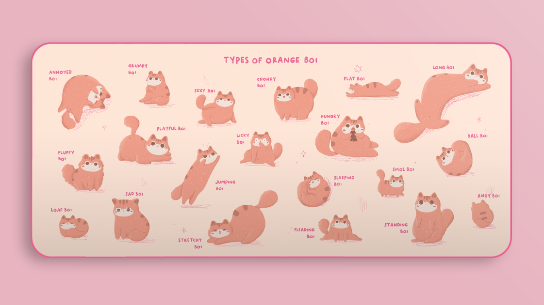 *Note that novelty designs will use UV printing for the second color. For all novelty caps, the cream color will be doubleshot and the pastel pink color will be UV printed.DESKMATSTypes of Orange Boi deskmat designed by Aly from okeydokey studio