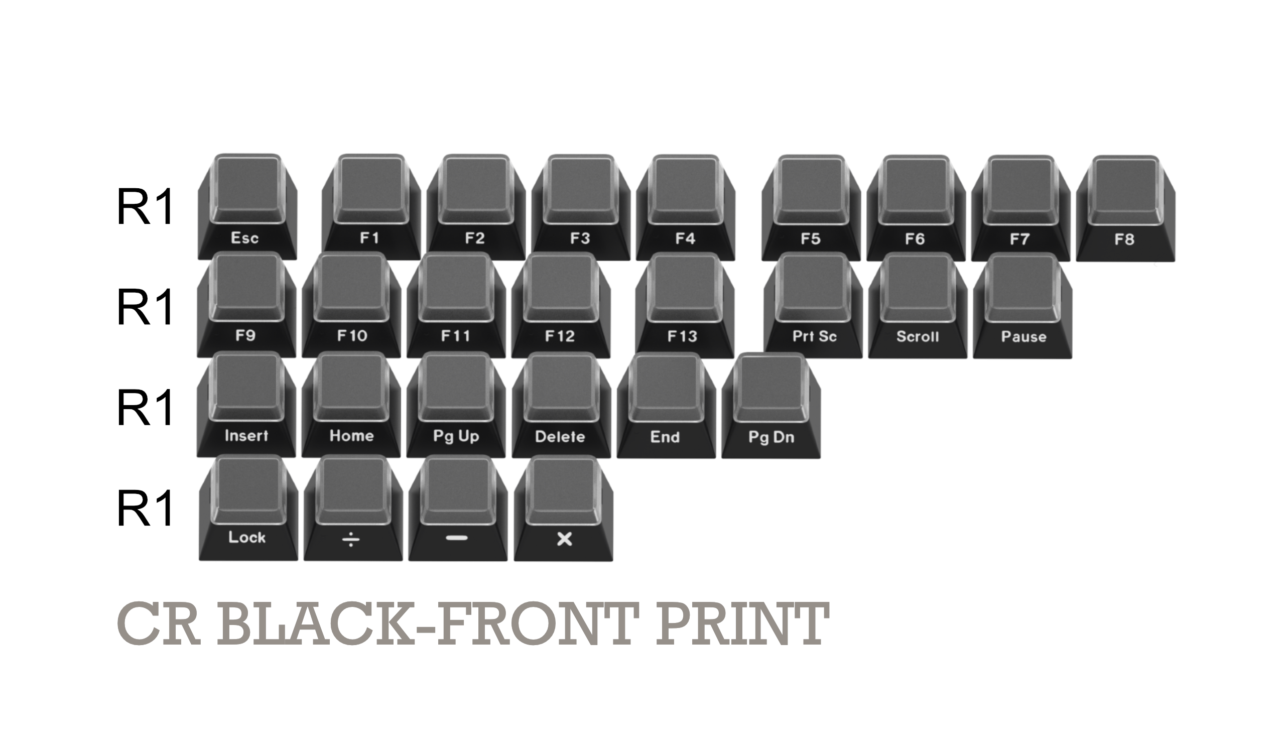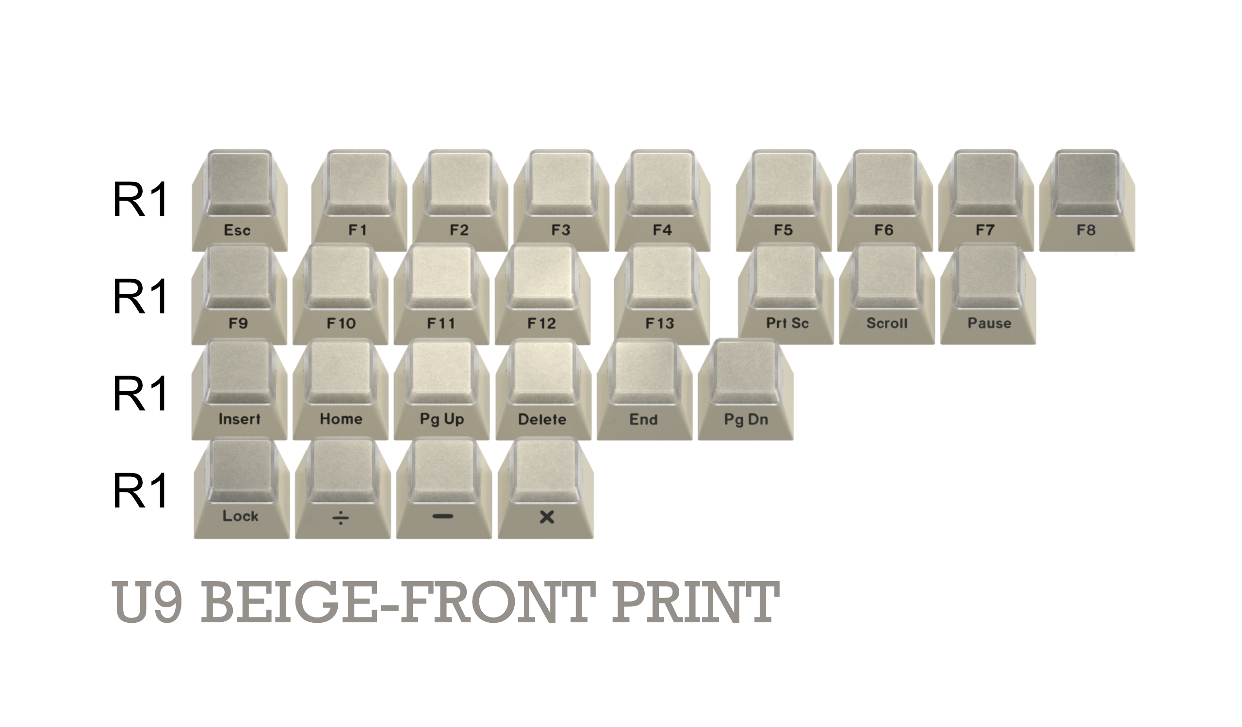KITS Front printed kits – CR base and U9 base. These include front printed kits in the two colourways, to suit WOB and to suit Beige Mods. The legends chosen will cover the top row of a TKL/full size as well as the nav cluster. While we agree the row height would be better if it matched the rows of the nav cluster, GMK unfortunately only makes these caps in R1.