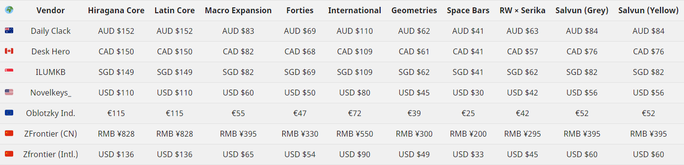 Esc keys, 1.00C to 2.75C space bars, and some alternate layout support for ortholinear keyboards.