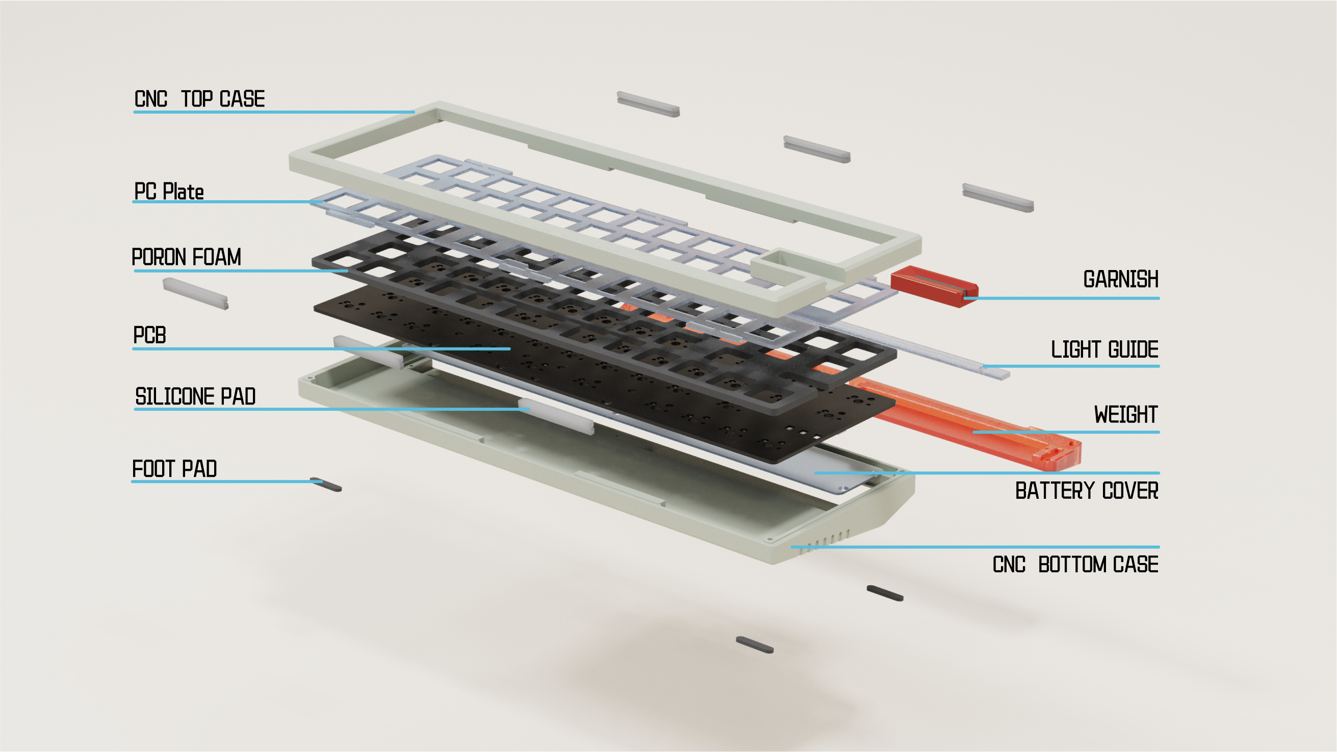 Cyber + industrial style The combination of different materials makes the keyboard look non-monotonous Exquisite and compact, can be carried anywhere and does not take up space Support split space that makes the layout more symmetrical Light strips on the front and back (color changeable) Front signal light: displays connection information and battery status